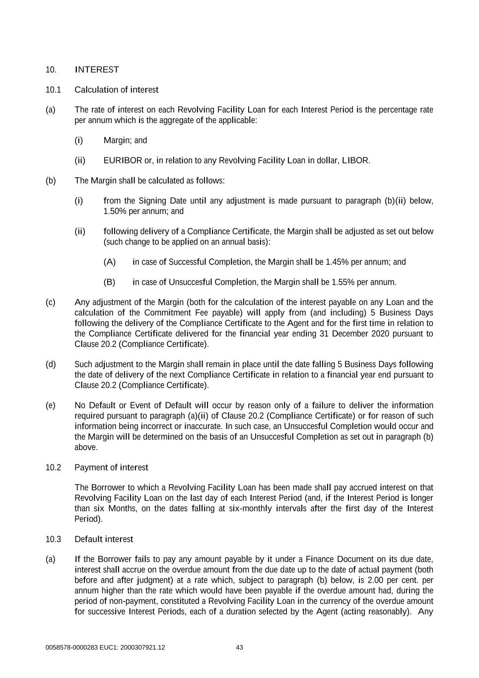 0058578-0000283 EUC1: 2000307921.12 43 10. INTEREST 10.1 Calculation of interest (a) The rate of interest on each Revolving Facility Loan for each Interest Period is the percentage rate per annum which is the aggregate of the applicable: (i) Margin; and (ii) EURIBOR or, in relation to any Revolving Facility Loan in dollar, LIBOR. (b) The Margin shall be calculated as follows: (i) from the Signing Date until any adjustment is made pursuant to paragraph (b)(ii) below, 1.50% per annum; and (ii) following delivery of a Compliance Certificate, the Margin shall be adjusted as set out below (such change to be applied on an annual basis): (A) in case of Successful Completion, the Margin shall be 1.45% per annum; and (B) in case of Unsuccesful Completion, the Margin shall be 1.55% per annum. (c) Any adjustment of the Margin (both for the calculation of the interest payable on any Loan and the calculation of the Commitment Fee payable) will apply from (and including) 5 Business Days following the delivery of the Compliance Certificate to the Agent and for the first time in relation to the Compliance Certificate delivered for the financial year ending 31 December 2020 pursuant to Clause 20.2 (Compliance Certificate). (d) Such adjustment to the Margin shall remain in place until the date falling 5 Business Days following the date of delivery of the next Compliance Certificate in relation to a financial year end pursuant to Clause 20.2 (Compliance Certificate). (e) No Default or Event of Default will occur by reason only of a failure to deliver the information required pursuant to paragraph (a)(ii) of Clause 20.2 (Compliance Certificate) or for reason of such information being incorrect or inaccurate. In such case, an Unsuccesful Completion would occur and the Margin will be determined on the basis of an Unsuccesful Completion as set out in paragraph (b) above. 10.2 Payment of interest The Borrower to which a Revolving Facility Loan has been made shall pay accrued interest on that Revolving Facility Loan on the last day of each Interest Period (and, if the Interest Period is longer than six Months, on the dates falling at six-monthly intervals after the first day of the Interest Period). 10.3 Default interest (a) If the Borrower fails to pay any amount payable by it under a Finance Document on its due date, interest shall accrue on the overdue amount from the due date up to the date of actual payment (both before and after judgment) at a rate which, subject to paragraph (b) below, is 2.00 per cent. per annum higher than the rate which would have been payable if the overdue amount had, during the period of non-payment, constituted a Revolving Facility Loan in the currency of the overdue amount for successive Interest Periods, each of a duration selected by the Agent (acting reasonably). Any