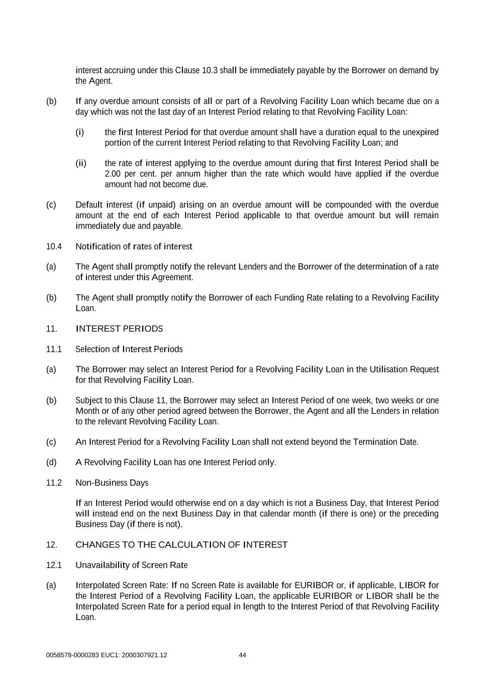 0058578-0000283 EUC1: 2000307921.12 44 interest accruing under this Clause 10.3 shall be immediately payable by the Borrower on demand by the Agent. (b) If any overdue amount consists of all or part of a Revolving Facility Loan which became due on a day which was not the last day of an Interest Period relating to that Revolving Facility Loan: (i) the first Interest Period for that overdue amount shall have a duration equal to the unexpired portion of the current Interest Period relating to that Revolving Facility Loan; and (ii) the rate of interest applying to the overdue amount during that first Interest Period shall be 2.00 per cent. per annum higher than the rate which would have applied if the overdue amount had not become due. (c) Default interest (if unpaid) arising on an overdue amount will be compounded with the overdue amount at the end of each Interest Period applicable to that overdue amount but will remain immediately due and payable. 10.4 Notification of rates of interest (a) The Agent shall promptly notify the relevant Lenders and the Borrower of the determination of a rate of interest under this Agreement. (b) The Agent shall promptly notify the Borrower of each Funding Rate relating to a Revolving Facility Loan. 11. INTEREST PERIODS 11.1 Selection of Interest Periods (a) The Borrower may select an Interest Period for a Revolving Facility Loan in the Utilisation Request for that Revolving Facility Loan. (b) Subject to this Clause 11, the Borrower may select an Interest Period of one week, two weeks or one Month or of any other period agreed between the Borrower, the Agent and all the Lenders in relation to the relevant Revolving Facility Loan. (c) An Interest Period for a Revolving Facility Loan shall not extend beyond the Termination Date. (d) A Revolving Facility Loan has one Interest Period only. 11.2 Non-Business Days If an Interest Period would otherwise end on a day which is not a Business Day, that Interest Period will instead end on the next Business Day in that calendar month (if there is one) or the preceding Business Day (if there is not). 12. CHANGES TO THE CALCULATION OF INTEREST 12.1 Unavailability of Screen Rate (a) Interpolated Screen Rate: If no Screen Rate is available for EURIBOR or, if applicable, LIBOR for the Interest Period of a Revolving Facility Loan, the applicable EURIBOR or LIBOR shall be the Interpolated Screen Rate for a period equal in length to the Interest Period of that Revolving Facility Loan.