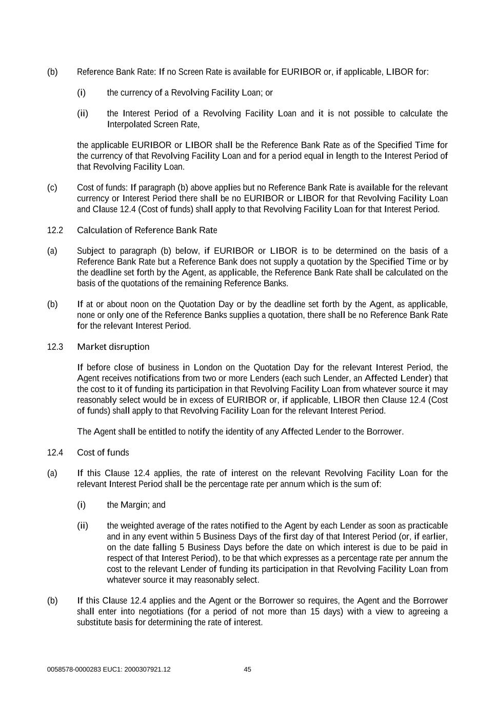 0058578-0000283 EUC1: 2000307921.12 45 (b) Reference Bank Rate: If no Screen Rate is available for EURIBOR or, if applicable, LIBOR for: (i) the currency of a Revolving Facility Loan; or (ii) the Interest Period of a Revolving Facility Loan and it is not possible to calculate the Interpolated Screen Rate, the applicable EURIBOR or LIBOR shall be the Reference Bank Rate as of the Specified Time for the currency of that Revolving Facility Loan and for a period equal in length to the Interest Period of that Revolving Facility Loan. (c) Cost of funds: If paragraph (b) above applies but no Reference Bank Rate is available for the relevant currency or Interest Period there shall be no EURIBOR or LIBOR for that Revolving Facility Loan and Clause 12.4 (Cost of funds) shall apply to that Revolving Facility Loan for that Interest Period. 12.2 Calculation of Reference Bank Rate (a) Subject to paragraph (b) below, if EURIBOR or LIBOR is to be determined on the basis of a Reference Bank Rate but a Reference Bank does not supply a quotation by the Specified Time or by the deadline set forth by the Agent, as applicable, the Reference Bank Rate shall be calculated on the basis of the quotations of the remaining Reference Banks. (b) If at or about noon on the Quotation Day or by the deadline set forth by the Agent, as applicable, none or only one of the Reference Banks supplies a quotation, there shall be no Reference Bank Rate for the relevant Interest Period. 12.3 Market disruption If before close of business in London on the Quotation Day for the relevant Interest Period, the Agent receives notifications from two or more Lenders (each such Lender, an Affected Lender) that the cost to it of funding its participation in that Revolving Facility Loan from whatever source it may reasonably select would be in excess of EURIBOR or, if applicable, LIBOR then Clause 12.4 (Cost of funds) shall apply to that Revolving Facility Loan for the relevant Interest Period. The Agent shall be entitled to notify the identity of any Affected Lender to the Borrower. 12.4 Cost of funds (a) If this Clause 12.4 applies, the rate of interest on the relevant Revolving Facility Loan for the relevant Interest Period shall be the percentage rate per annum which is the sum of: (i) the Margin; and (ii) the weighted average of the rates notified to the Agent by each Lender as soon as practicable and in any event within 5 Business Days of the first day of that Interest Period (or, if earlier, on the date falling 5 Business Days before the date on which interest is due to be paid in respect of that Interest Period), to be that which expresses as a percentage rate per annum the cost to the relevant Lender of funding its participation in that Revolving Facility Loan from whatever source it may reasonably select. (b) If this Clause 12.4 applies and the Agent or the Borrower so requires, the Agent and the Borrower shall enter into negotiations (for a period of not more than 15 days) with a view to agreeing a substitute basis for determining the rate of interest.