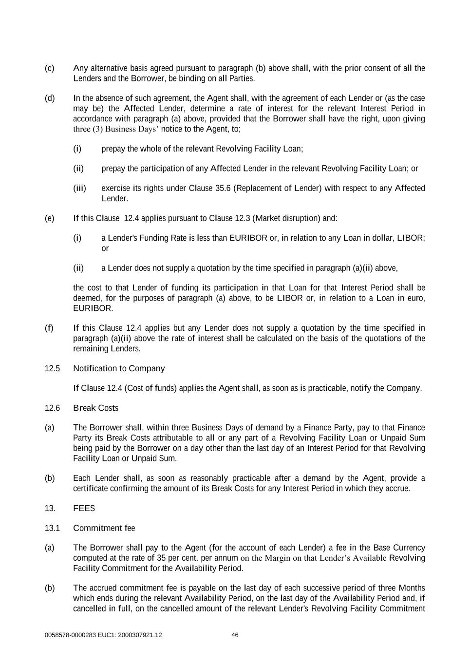 0058578-0000283 EUC1: 2000307921.12 46 (c) Any alternative basis agreed pursuant to paragraph (b) above shall, with the prior consent of all the Lenders and the Borrower, be binding on all Parties. (d) In the absence of such agreement, the Agent shall, with the agreement of each Lender or (as the case may be) the Affected Lender, determine a rate of interest for the relevant Interest Period in accordance with paragraph (a) above, provided that the Borrower shall have the right, upon giving three (3) Business Days’ notice to the Agent, to; (i) prepay the whole of the relevant Revolving Facility Loan; (ii) prepay the participation of any Affected Lender in the relevant Revolving Facility Loan; or (iii) exercise its rights under Clause 35.6 (Replacement of Lender) with respect to any Affected Lender. (e) If this Clause 12.4 applies pursuant to Clause 12.3 (Market disruption) and: (i) a Lender's Funding Rate is less than EURIBOR or, in relation to any Loan in dollar, LIBOR; or (ii) a Lender does not supply a quotation by the time specified in paragraph (a)(ii) above, the cost to that Lender of funding its participation in that Loan for that Interest Period shall be deemed, for the purposes of paragraph (a) above, to be LIBOR or, in relation to a Loan in euro, EURIBOR. (f) If this Clause 12.4 applies but any Lender does not supply a quotation by the time specified in paragraph (a)(ii) above the rate of interest shall be calculated on the basis of the quotations of the remaining Lenders. 12.5 Notification to Company If Clause 12.4 (Cost of funds) applies the Agent shall, as soon as is practicable, notify the Company. 12.6 Break Costs (a) The Borrower shall, within three Business Days of demand by a Finance Party, pay to that Finance Party its Break Costs attributable to all or any part of a Revolving Facility Loan or Unpaid Sum being paid by the Borrower on a day other than the last day of an Interest Period for that Revolving Facility Loan or Unpaid Sum. (b) Each Lender shall, as soon as reasonably practicable after a demand by the Agent, provide a certificate confirming the amount of its Break Costs for any Interest Period in which they accrue. 13. FEES 13.1 Commitment fee (a) The Borrower shall pay to the Agent (for the account of each Lender) a fee in the Base Currency computed at the rate of 35 per cent. per annum on the Margin on that Lender’s Available Revolving Facility Commitment for the Availability Period. (b) The accrued commitment fee is payable on the last day of each successive period of three Months which ends during the relevant Availability Period, on the last day of the Availability Period and, if cancelled in full, on the cancelled amount of the relevant Lender's Revolving Facility Commitment
