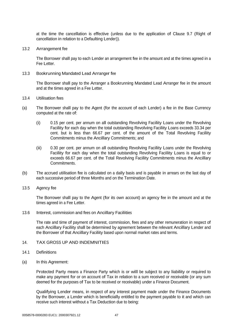 0058578-0000283 EUC1: 2000307921.12 47 at the time the cancellation is effective (unless due to the application of Clause 9.7 (Right of cancellation in relation to a Defaulting Lender)). 13.2 Arrangement fee The Borrower shall pay to each Lender an arrangement fee in the amount and at the times agreed in a Fee Letter. 13.3 Bookrunning Mandated Lead Arranger fee The Borrower shall pay to the Arranger a Bookrunning Mandated Lead Arranger fee in the amount and at the times agreed in a Fee Letter. 13.4 Utilisation fees (a) The Borrower shall pay to the Agent (for the account of each Lender) a fee in the Base Currency computed at the rate of: (i) 0.15 per cent. per annum on all outstanding Revolving Facility Loans under the Revolving Facility for each day when the total outstanding Revolving Facility Loans exceeds 33.34 per cent. but is less than 66.67 per cent. of the amount of the Total Revolving Facility Commitments minus the Ancillary Commitments; and (ii) 0.30 per cent. per annum on all outstanding Revolving Facility Loans under the Revolving Facility for each day when the total outstanding Revolving Facility Loans is equal to or exceeds 66.67 per cent. of the Total Revolving Facility Commitments minus the Ancillary Commitments. (b) The accrued utilisation fee is calculated on a daily basis and is payable in arrears on the last day of each successive period of three Months and on the Termination Date. 13.5 Agency fee The Borrower shall pay to the Agent (for its own account) an agency fee in the amount and at the times agreed in a Fee Letter. 13.6 Interest, commission and fees on Ancillary Facilities The rate and time of payment of interest, commission, fees and any other remuneration in respect of each Ancillary Facility shall be determined by agreement between the relevant Ancillary Lender and the Borrower of that Ancillary Facility based upon normal market rates and terms. 14. TAX GROSS UP AND INDEMNITIES 14.1 Definitions (a) In this Agreement: Protected Party means a Finance Party which is or will be subject to any liability or required to make any payment for or on account of Tax in relation to a sum received or receivable (or any sum deemed for the purposes of Tax to be received or receivable) under a Finance Document. Qualifying Lender means, in respect of any interest payment made under the Finance Documents by the Borrower, a Lender which is beneficially entitled to the payment payable to it and which can receive such interest without a Tax Deduction due to being: