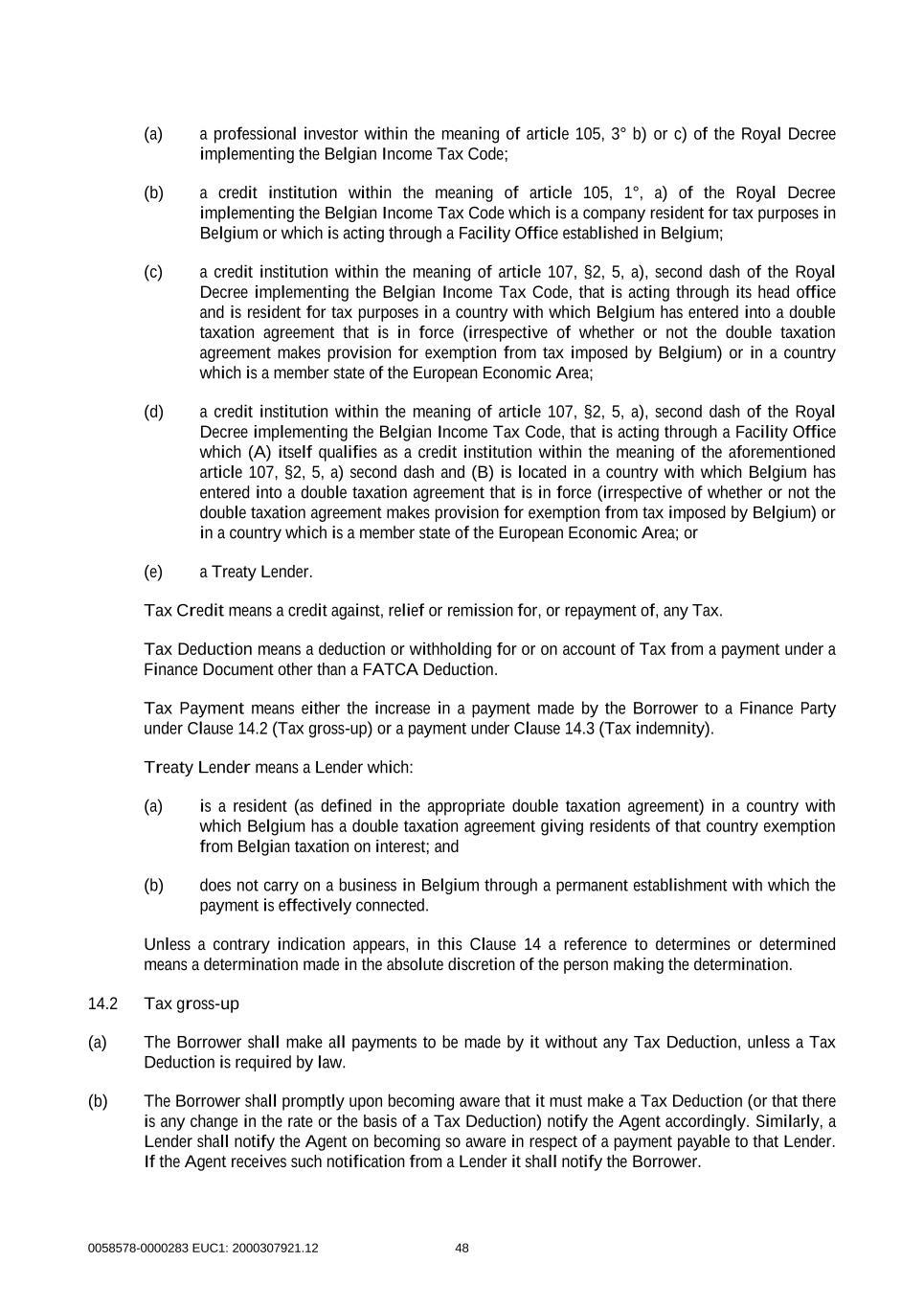 0058578-0000283 EUC1: 2000307921.12 48 (a) a professional investor within the meaning of article 105, 3° b) or c) of the Royal Decree implementing the Belgian Income Tax Code; (b) a credit institution within the meaning of article 105, 1°, a) of the Royal Decree implementing the Belgian Income Tax Code which is a company resident for tax purposes in Belgium or which is acting through a Facility Office established in Belgium; (c) a credit institution within the meaning of article 107, §2, 5, a), second dash of the Royal Decree implementing the Belgian Income Tax Code, that is acting through its head office and is resident for tax purposes in a country with which Belgium has entered into a double taxation agreement that is in force (irrespective of whether or not the double taxation agreement makes provision for exemption from tax imposed by Belgium) or in a country which is a member state of the European Economic Area; (d) a credit institution within the meaning of article 107, §2, 5, a), second dash of the Royal Decree implementing the Belgian Income Tax Code, that is acting through a Facility Office which (A) itself qualifies as a credit institution within the meaning of the aforementioned article 107, §2, 5, a) second dash and (B) is located in a country with which Belgium has entered into a double taxation agreement that is in force (irrespective of whether or not the double taxation agreement makes provision for exemption from tax imposed by Belgium) or in a country which is a member state of the European Economic Area; or (e) a Treaty Lender. Tax Credit means a credit against, relief or remission for, or repayment of, any Tax. Tax Deduction means a deduction or withholding for or on account of Tax from a payment under a Finance Document other than a FATCA Deduction. Tax Payment means either the increase in a payment made by the Borrower to a Finance Party under Clause 14.2 (Tax gross-up) or a payment under Clause 14.3 (Tax indemnity). Treaty Lender means a Lender which: (a) is a resident (as defined in the appropriate double taxation agreement) in a country with which Belgium has a double taxation agreement giving residents of that country exemption from Belgian taxation on interest; and (b) does not carry on a business in Belgium through a permanent establishment with which the payment is effectively connected. Unless a contrary indication appears, in this Clause 14 a reference to determines or determined means a determination made in the absolute discretion of the person making the determination. 14.2 Tax gross-up (a) The Borrower shall make all payments to be made by it without any Tax Deduction, unless a Tax Deduction is required by law. (b) The Borrower shall promptly upon becoming aware that it must make a Tax Deduction (or that there is any change in the rate or the basis of a Tax Deduction) notify the Agent accordingly. Similarly, a Lender shall notify the Agent on becoming so aware in respect of a payment payable to that Lender. If the Agent receives such notification from a Lender it shall notify the Borrower.