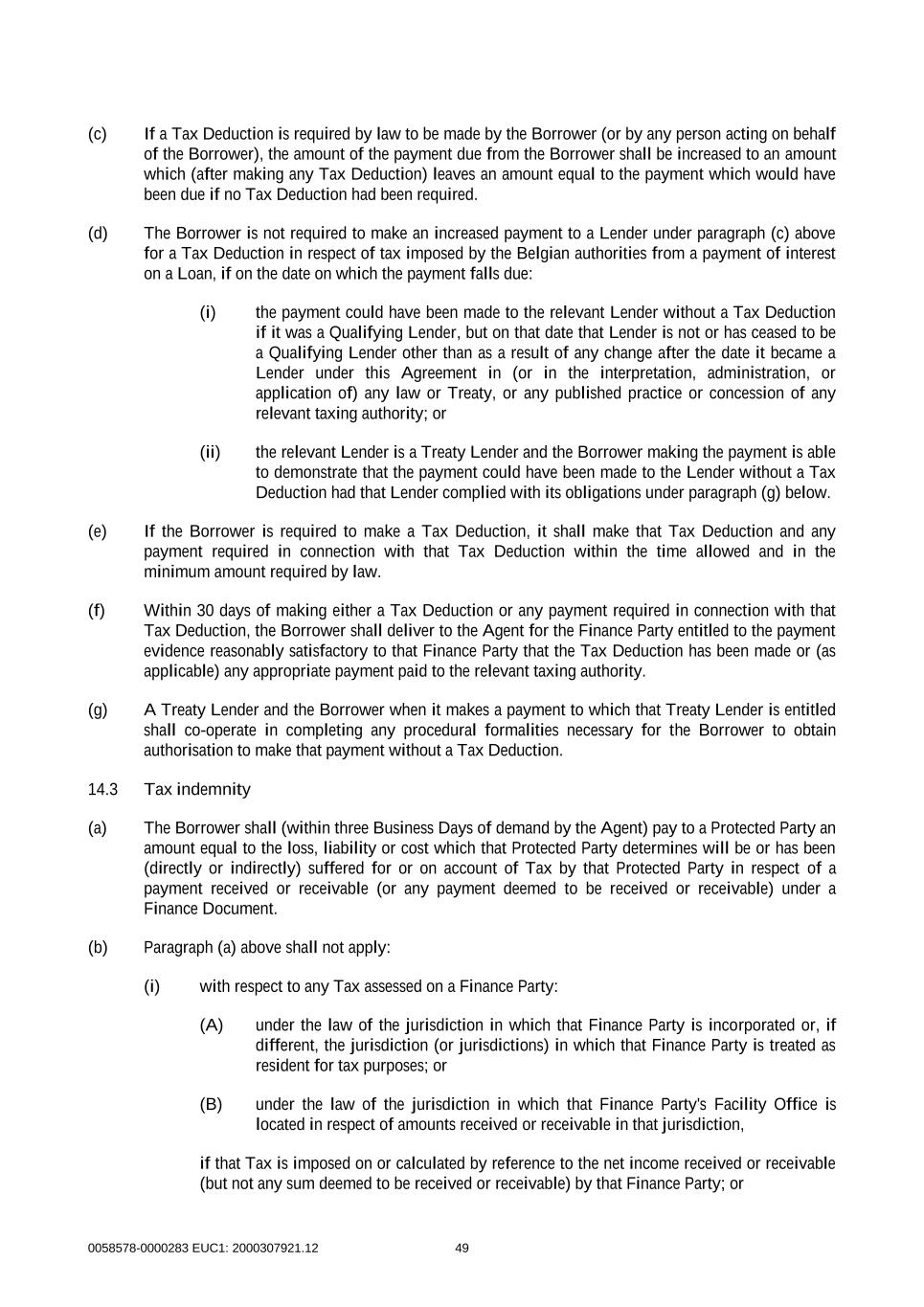 0058578-0000283 EUC1: 2000307921.12 49 (c) If a Tax Deduction is required by law to be made by the Borrower (or by any person acting on behalf of the Borrower), the amount of the payment due from the Borrower shall be increased to an amount which (after making any Tax Deduction) leaves an amount equal to the payment which would have been due if no Tax Deduction had been required. (d) The Borrower is not required to make an increased payment to a Lender under paragraph (c) above for a Tax Deduction in respect of tax imposed by the Belgian authorities from a payment of interest on a Loan, if on the date on which the payment falls due: (i) the payment could have been made to the relevant Lender without a Tax Deduction if it was a Qualifying Lender, but on that date that Lender is not or has ceased to be a Qualifying Lender other than as a result of any change after the date it became a Lender under this Agreement in (or in the interpretation, administration, or application of) any law or Treaty, or any published practice or concession of any relevant taxing authority; or (ii) the relevant Lender is a Treaty Lender and the Borrower making the payment is able to demonstrate that the payment could have been made to the Lender without a Tax Deduction had that Lender complied with its obligations under paragraph (g) below. (e) If the Borrower is required to make a Tax Deduction, it shall make that Tax Deduction and any payment required in connection with that Tax Deduction within the time allowed and in the minimum amount required by law. (f) Within 30 days of making either a Tax Deduction or any payment required in connection with that Tax Deduction, the Borrower shall deliver to the Agent for the Finance Party entitled to the payment evidence reasonably satisfactory to that Finance Party that the Tax Deduction has been made or (as applicable) any appropriate payment paid to the relevant taxing authority. (g) A Treaty Lender and the Borrower when it makes a payment to which that Treaty Lender is entitled shall co-operate in completing any procedural formalities necessary for the Borrower to obtain authorisation to make that payment without a Tax Deduction. 14.3 Tax indemnity (a) The Borrower shall (within three Business Days of demand by the Agent) pay to a Protected Party an amount equal to the loss, liability or cost which that Protected Party determines will be or has been (directly or indirectly) suffered for or on account of Tax by that Protected Party in respect of a payment received or receivable (or any payment deemed to be received or receivable) under a Finance Document. (b) Paragraph (a) above shall not apply: (i) with respect to any Tax assessed on a Finance Party: (A) under the law of the jurisdiction in which that Finance Party is incorporated or, if different, the jurisdiction (or jurisdictions) in which that Finance Party is treated as resident for tax purposes; or (B) under the law of the jurisdiction in which that Finance Party's Facility Office is located in respect of amounts received or receivable in that jurisdiction, if that Tax is imposed on or calculated by reference to the net income received or receivable (but not any sum deemed to be received or receivable) by that Finance Party; or