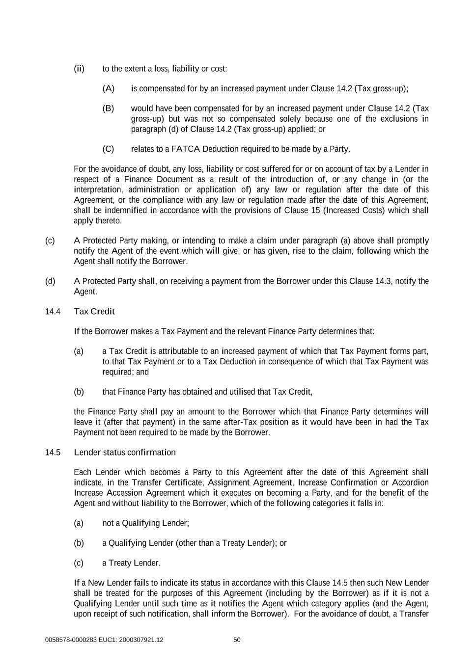0058578-0000283 EUC1: 2000307921.12 50 (ii) to the extent a loss, liability or cost: (A) is compensated for by an increased payment under Clause 14.2 (Tax gross-up); (B) would have been compensated for by an increased payment under Clause 14.2 (Tax gross-up) but was not so compensated solely because one of the exclusions in paragraph (d) of Clause 14.2 (Tax gross-up) applied; or (C) relates to a FATCA Deduction required to be made by a Party. For the avoidance of doubt, any loss, liability or cost suffered for or on account of tax by a Lender in respect of a Finance Document as a result of the introduction of, or any change in (or the interpretation, administration or application of) any law or regulation after the date of this Agreement, or the compliance with any law or regulation made after the date of this Agreement, shall be indemnified in accordance with the provisions of Clause 15 (Increased Costs) which shall apply thereto. (c) A Protected Party making, or intending to make a claim under paragraph (a) above shall promptly notify the Agent of the event which will give, or has given, rise to the claim, following which the Agent shall notify the Borrower. (d) A Protected Party shall, on receiving a payment from the Borrower under this Clause 14.3, notify the Agent. 14.4 Tax Credit If the Borrower makes a Tax Payment and the relevant Finance Party determines that: (a) a Tax Credit is attributable to an increased payment of which that Tax Payment forms part, to that Tax Payment or to a Tax Deduction in consequence of which that Tax Payment was required; and (b) that Finance Party has obtained and utilised that Tax Credit, the Finance Party shall pay an amount to the Borrower which that Finance Party determines will leave it (after that payment) in the same after-Tax position as it would have been in had the Tax Payment not been required to be made by the Borrower. 14.5 Lender status confirmation Each Lender which becomes a Party to this Agreement after the date of this Agreement shall indicate, in the Transfer Certificate, Assignment Agreement, Increase Confirmation or Accordion Increase Accession Agreement which it executes on becoming a Party, and for the benefit of the Agent and without liability to the Borrower, which of the following categories it falls in: (a) not a Qualifying Lender; (b) a Qualifying Lender (other than a Treaty Lender); or (c) a Treaty Lender. If a New Lender fails to indicate its status in accordance with this Clause 14.5 then such New Lender shall be treated for the purposes of this Agreement (including by the Borrower) as if it is not a Qualifying Lender until such time as it notifies the Agent which category applies (and the Agent, upon receipt of such notification, shall inform the Borrower). For the avoidance of doubt, a Transfer