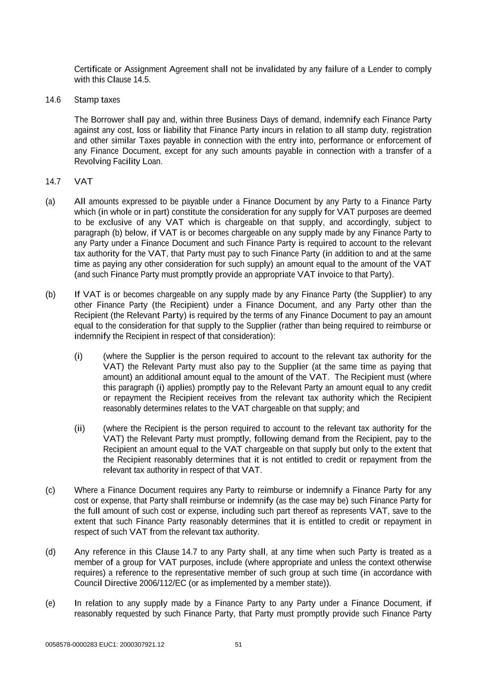 0058578-0000283 EUC1: 2000307921.12 51 Certificate or Assignment Agreement shall not be invalidated by any failure of a Lender to comply with this Clause 14.5. 14.6 Stamp taxes The Borrower shall pay and, within three Business Days of demand, indemnify each Finance Party against any cost, loss or liability that Finance Party incurs in relation to all stamp duty, registration and other similar Taxes payable in connection with the entry into, performance or enforcement of any Finance Document, except for any such amounts payable in connection with a transfer of a Revolving Facility Loan. 14.7 VAT (a) All amounts expressed to be payable under a Finance Document by any Party to a Finance Party which (in whole or in part) constitute the consideration for any supply for VAT purposes are deemed to be exclusive of any VAT which is chargeable on that supply, and accordingly, subject to paragraph (b) below, if VAT is or becomes chargeable on any supply made by any Finance Party to any Party under a Finance Document and such Finance Party is required to account to the relevant tax authority for the VAT, that Party must pay to such Finance Party (in addition to and at the same time as paying any other consideration for such supply) an amount equal to the amount of the VAT (and such Finance Party must promptly provide an appropriate VAT invoice to that Party). (b) If VAT is or becomes chargeable on any supply made by any Finance Party (the Supplier) to any other Finance Party (the Recipient) under a Finance Document, and any Party other than the Recipient (the Relevant Party) is required by the terms of any Finance Document to pay an amount equal to the consideration for that supply to the Supplier (rather than being required to reimburse or indemnify the Recipient in respect of that consideration): (i) (where the Supplier is the person required to account to the relevant tax authority for the VAT) the Relevant Party must also pay to the Supplier (at the same time as paying that amount) an additional amount equal to the amount of the VAT. The Recipient must (where this paragraph (i) applies) promptly pay to the Relevant Party an amount equal to any credit or repayment the Recipient receives from the relevant tax authority which the Recipient reasonably determines relates to the VAT chargeable on that supply; and (ii) (where the Recipient is the person required to account to the relevant tax authority for the VAT) the Relevant Party must promptly, following demand from the Recipient, pay to the Recipient an amount equal to the VAT chargeable on that supply but only to the extent that the Recipient reasonably determines that it is not entitled to credit or repayment from the relevant tax authority in respect of that VAT. (c) Where a Finance Document requires any Party to reimburse or indemnify a Finance Party for any cost or expense, that Party shall reimburse or indemnify (as the case may be) such Finance Party for the full amount of such cost or expense, including such part thereof as represents VAT, save to the extent that such Finance Party reasonably determines that it is entitled to credit or repayment in respect of such VAT from the relevant tax authority. (d) Any reference in this Clause 14.7 to any Party shall, at any time when such Party is treated as a member of a group for VAT purposes, include (where appropriate and unless the context otherwise requires) a reference to the representative member of such group at such time (in accordance with Council Directive 2006/112/EC (or as implemented by a member state)). (e) In relation to any supply made by a Finance Party to any Party under a Finance Document, if reasonably requested by such Finance Party, that Party must promptly provide such Finance Party