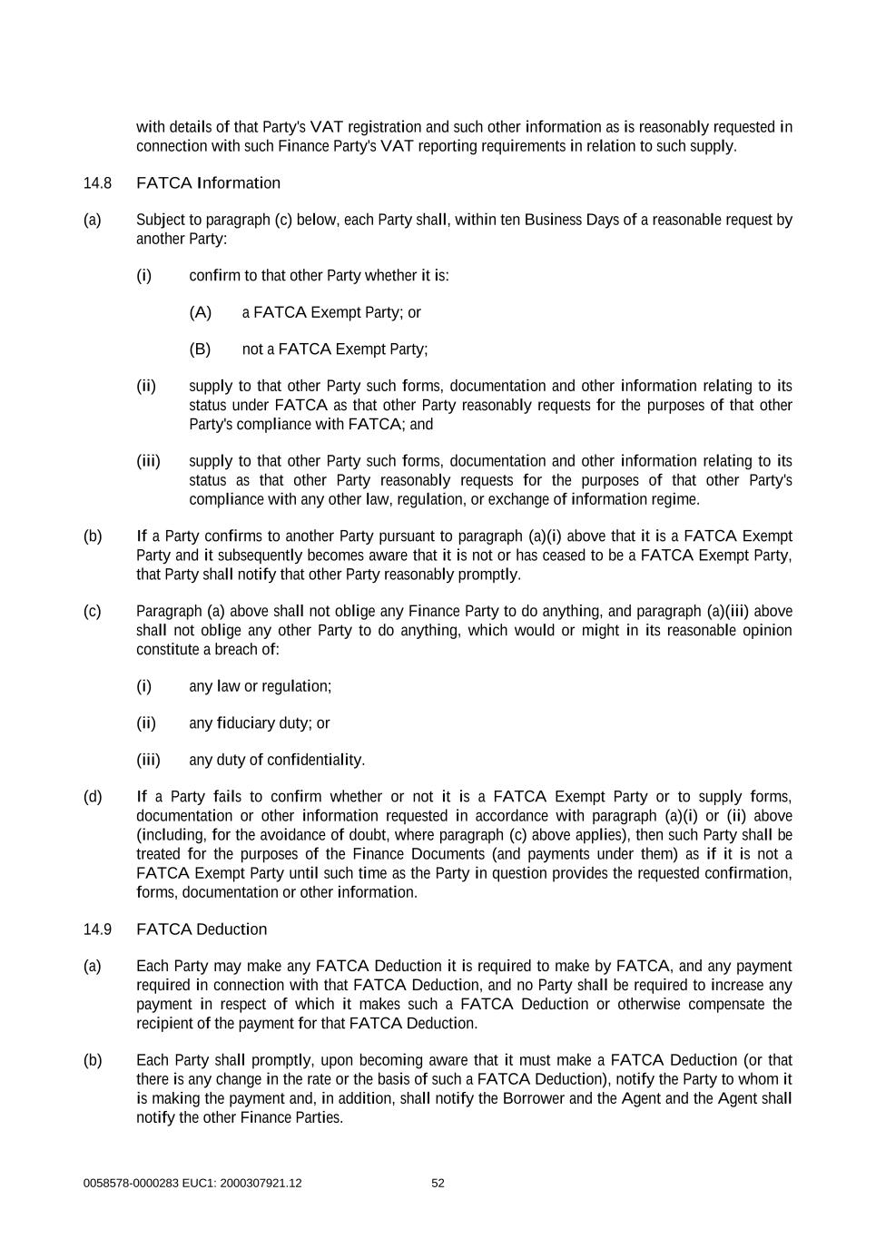 0058578-0000283 EUC1: 2000307921.12 52 with details of that Party's VAT registration and such other information as is reasonably requested in connection with such Finance Party's VAT reporting requirements in relation to such supply. 14.8 FATCA Information (a) Subject to paragraph (c) below, each Party shall, within ten Business Days of a reasonable request by another Party: (i) confirm to that other Party whether it is: (A) a FATCA Exempt Party; or (B) not a FATCA Exempt Party; (ii) supply to that other Party such forms, documentation and other information relating to its status under FATCA as that other Party reasonably requests for the purposes of that other Party's compliance with FATCA; and (iii) supply to that other Party such forms, documentation and other information relating to its status as that other Party reasonably requests for the purposes of that other Party's compliance with any other law, regulation, or exchange of information regime. (b) If a Party confirms to another Party pursuant to paragraph (a)(i) above that it is a FATCA Exempt Party and it subsequently becomes aware that it is not or has ceased to be a FATCA Exempt Party, that Party shall notify that other Party reasonably promptly. (c) Paragraph (a) above shall not oblige any Finance Party to do anything, and paragraph (a)(iii) above shall not oblige any other Party to do anything, which would or might in its reasonable opinion constitute a breach of: (i) any law or regulation; (ii) any fiduciary duty; or (iii) any duty of confidentiality. (d) If a Party fails to confirm whether or not it is a FATCA Exempt Party or to supply forms, documentation or other information requested in accordance with paragraph (a)(i) or (ii) above (including, for the avoidance of doubt, where paragraph (c) above applies), then such Party shall be treated for the purposes of the Finance Documents (and payments under them) as if it is not a FATCA Exempt Party until such time as the Party in question provides the requested confirmation, forms, documentation or other information. 14.9 FATCA Deduction (a) Each Party may make any FATCA Deduction it is required to make by FATCA, and any payment required in connection with that FATCA Deduction, and no Party shall be required to increase any payment in respect of which it makes such a FATCA Deduction or otherwise compensate the recipient of the payment for that FATCA Deduction. (b) Each Party shall promptly, upon becoming aware that it must make a FATCA Deduction (or that there is any change in the rate or the basis of such a FATCA Deduction), notify the Party to whom it is making the payment and, in addition, shall notify the Borrower and the Agent and the Agent shall notify the other Finance Parties.