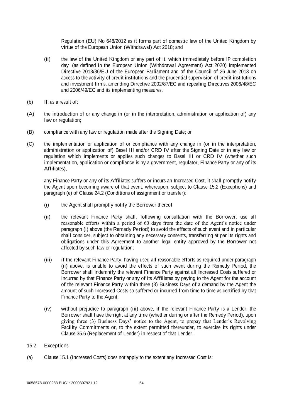 0058578-0000283 EUC1: 2000307921.12 54 Regulation (EU) No 648/2012 as it forms part of domestic law of the United Kingdom by virtue of the European Union (Withdrawal) Act 2018; and (ii) the law of the United Kingdom or any part of it, which immediately before IP completion day (as defined in the European Union (Withdrawal Agreement) Act 2020) implemented Directive 2013/36/EU of the European Parliament and of the Council of 26 June 2013 on access to the activity of credit institutions and the prudential supervision of credit institutions and investment firms, amending Directive 2002/87/EC and repealing Directives 2006/48/EC and 2006/49/EC and its implementing measures. (b) If, as a result of: (A) the introduction of or any change in (or in the interpretation, administration or application of) any law or regulation; (B) compliance with any law or regulation made after the Signing Date; or (C) the implementation or application of or compliance with any change in (or in the interpretation, administration or application of) Basel III and/or CRD IV after the Signing Date or in any law or regulation which implements or applies such changes to Basel III or CRD IV (whether such implementation, application or compliance is by a government, regulator, Finance Party or any of its Affiliates), any Finance Party or any of its Affiliates suffers or incurs an Increased Cost, it shall promptly notify the Agent upon becoming aware of that event, whereupon, subject to Clause 15.2 (Exceptions) and paragraph (e) of Clause 24.2 (Conditions of assignment or transfer): (i) the Agent shall promptly notify the Borrower thereof; (ii) the relevant Finance Party shall, following consultation with the Borrower, use all reasonable efforts within a period of 60 days from the date of the Agent’s notice under paragraph (i) above (the Remedy Period) to avoid the effects of such event and in particular shall consider, subject to obtaining any necessary consents, transferring at par its rights and obligations under this Agreement to another legal entity approved by the Borrower not affected by such law or regulation; (iii) if the relevant Finance Party, having used all reasonable efforts as required under paragraph (ii) above, is unable to avoid the effects of such event during the Remedy Period, the Borrower shall indemnify the relevant Finance Party against all Increased Costs suffered or incurred by that Finance Party or any of its Affiliates by paying to the Agent for the account of the relevant Finance Party within three (3) Business Days of a demand by the Agent the amount of such Increased Costs so suffered or incurred from time to time as certified by that Finance Party to the Agent; (iv) without prejudice to paragraph (iii) above, if the relevant Finance Party is a Lender, the Borrower shall have the right at any time (whether during or after the Remedy Period), upon giving three (3) Business Days’ notice to the Agent, to prepay that Lender’s Revolving Facility Commitments or, to the extent permitted thereunder, to exercise its rights under Clause 35.6 (Replacement of Lender) in respect of that Lender. 15.2 Exceptions (a) Clause 15.1 (Increased Costs) does not apply to the extent any Increased Cost is: