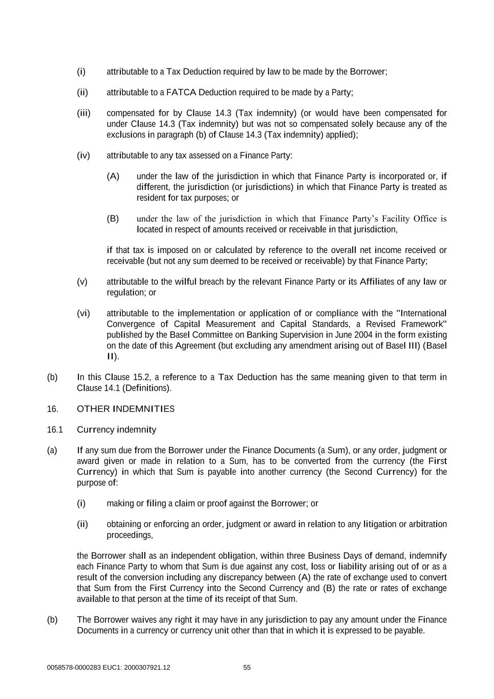 0058578-0000283 EUC1: 2000307921.12 55 (i) attributable to a Tax Deduction required by law to be made by the Borrower; (ii) attributable to a FATCA Deduction required to be made by a Party; (iii) compensated for by Clause 14.3 (Tax indemnity) (or would have been compensated for under Clause 14.3 (Tax indemnity) but was not so compensated solely because any of the exclusions in paragraph (b) of Clause 14.3 (Tax indemnity) applied); (iv) attributable to any tax assessed on a Finance Party: (A) under the law of the jurisdiction in which that Finance Party is incorporated or, if different, the jurisdiction (or jurisdictions) in which that Finance Party is treated as resident for tax purposes; or (B) under the law of the jurisdiction in which that Finance Party’s Facility Office is located in respect of amounts received or receivable in that jurisdiction, if that tax is imposed on or calculated by reference to the overall net income received or receivable (but not any sum deemed to be received or receivable) by that Finance Party; (v) attributable to the wilful breach by the relevant Finance Party or its Affiliates of any law or regulation; or (vi) attributable to the implementation or application of or compliance with the "International Convergence of Capital Measurement and Capital Standards, a Revised Framework" published by the Basel Committee on Banking Supervision in June 2004 in the form existing on the date of this Agreement (but excluding any amendment arising out of Basel III) (Basel II). (b) In this Clause 15.2, a reference to a Tax Deduction has the same meaning given to that term in Clause 14.1 (Definitions). 16. OTHER INDEMNITIES 16.1 Currency indemnity (a) If any sum due from the Borrower under the Finance Documents (a Sum), or any order, judgment or award given or made in relation to a Sum, has to be converted from the currency (the First Currency) in which that Sum is payable into another currency (the Second Currency) for the purpose of: (i) making or filing a claim or proof against the Borrower; or (ii) obtaining or enforcing an order, judgment or award in relation to any litigation or arbitration proceedings, the Borrower shall as an independent obligation, within three Business Days of demand, indemnify each Finance Party to whom that Sum is due against any cost, loss or liability arising out of or as a result of the conversion including any discrepancy between (A) the rate of exchange used to convert that Sum from the First Currency into the Second Currency and (B) the rate or rates of exchange available to that person at the time of its receipt of that Sum. (b) The Borrower waives any right it may have in any jurisdiction to pay any amount under the Finance Documents in a currency or currency unit other than that in which it is expressed to be payable.