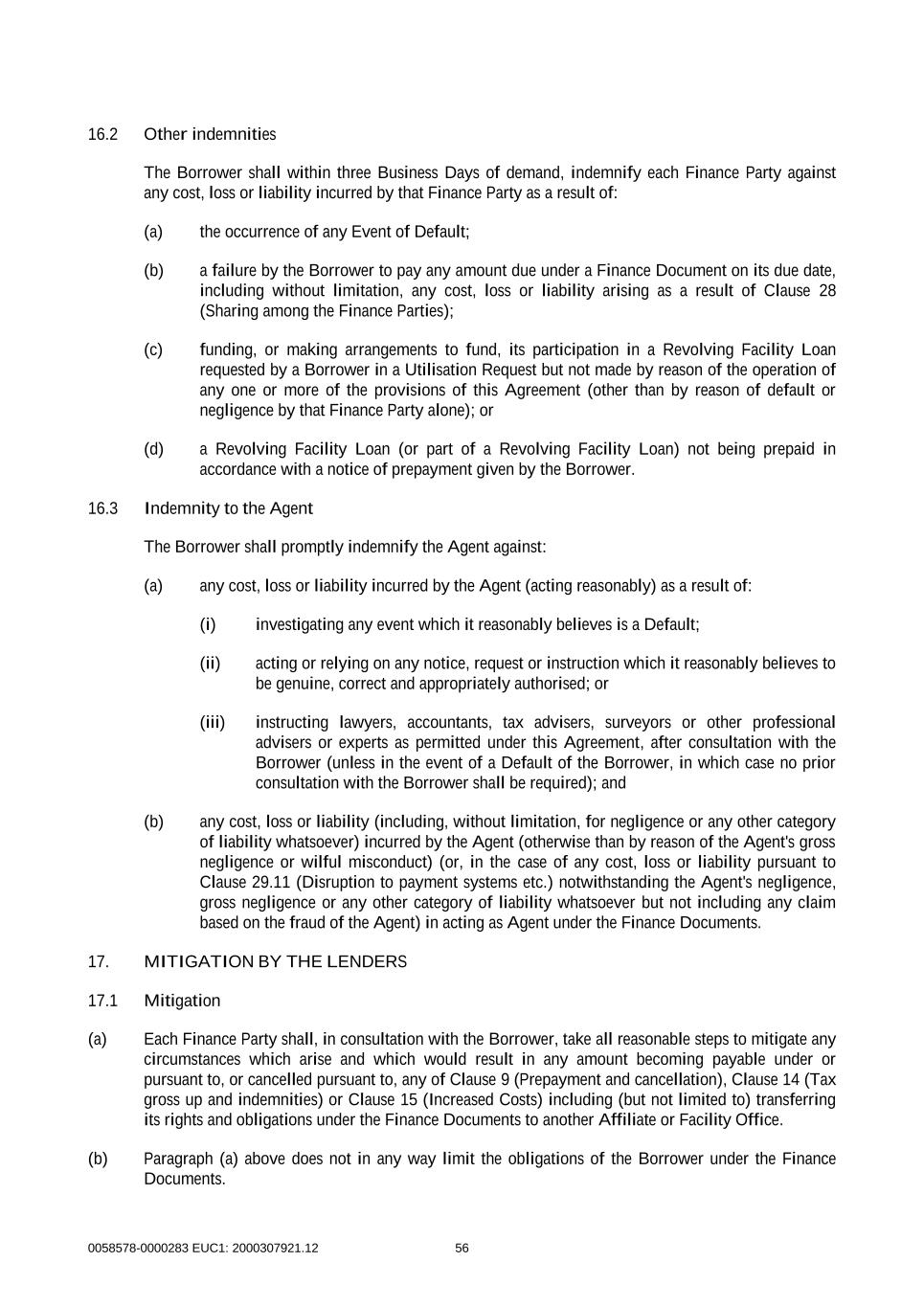 0058578-0000283 EUC1: 2000307921.12 56 16.2 Other indemnities The Borrower shall within three Business Days of demand, indemnify each Finance Party against any cost, loss or liability incurred by that Finance Party as a result of: (a) the occurrence of any Event of Default; (b) a failure by the Borrower to pay any amount due under a Finance Document on its due date, including without limitation, any cost, loss or liability arising as a result of Clause 28 (Sharing among the Finance Parties); (c) funding, or making arrangements to fund, its participation in a Revolving Facility Loan requested by a Borrower in a Utilisation Request but not made by reason of the operation of any one or more of the provisions of this Agreement (other than by reason of default or negligence by that Finance Party alone); or (d) a Revolving Facility Loan (or part of a Revolving Facility Loan) not being prepaid in accordance with a notice of prepayment given by the Borrower. 16.3 Indemnity to the Agent The Borrower shall promptly indemnify the Agent against: (a) any cost, loss or liability incurred by the Agent (acting reasonably) as a result of: (i) investigating any event which it reasonably believes is a Default; (ii) acting or relying on any notice, request or instruction which it reasonably believes to be genuine, correct and appropriately authorised; or (iii) instructing lawyers, accountants, tax advisers, surveyors or other professional advisers or experts as permitted under this Agreement, after consultation with the Borrower (unless in the event of a Default of the Borrower, in which case no prior consultation with the Borrower shall be required); and (b) any cost, loss or liability (including, without limitation, for negligence or any other category of liability whatsoever) incurred by the Agent (otherwise than by reason of the Agent's gross negligence or wilful misconduct) (or, in the case of any cost, loss or liability pursuant to Clause 29.11 (Disruption to payment systems etc.) notwithstanding the Agent's negligence, gross negligence or any other category of liability whatsoever but not including any claim based on the fraud of the Agent) in acting as Agent under the Finance Documents. 17. MITIGATION BY THE LENDERS 17.1 Mitigation (a) Each Finance Party shall, in consultation with the Borrower, take all reasonable steps to mitigate any circumstances which arise and which would result in any amount becoming payable under or pursuant to, or cancelled pursuant to, any of Clause 9 (Prepayment and cancellation), Clause 14 (Tax gross up and indemnities) or Clause 15 (Increased Costs) including (but not limited to) transferring its rights and obligations under the Finance Documents to another Affiliate or Facility Office. (b) Paragraph (a) above does not in any way limit the obligations of the Borrower under the Finance Documents.