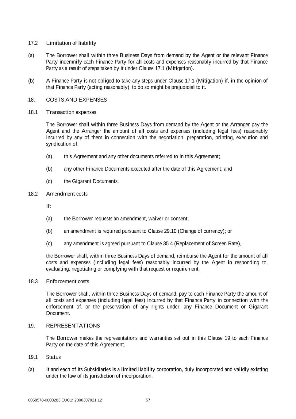 0058578-0000283 EUC1: 2000307921.12 57 17.2 Limitation of liability (a) The Borrower shall within three Business Days from demand by the Agent or the relevant Finance Party indemnify each Finance Party for all costs and expenses reasonably incurred by that Finance Party as a result of steps taken by it under Clause 17.1 (Mitigation). (b) A Finance Party is not obliged to take any steps under Clause 17.1 (Mitigation) if, in the opinion of that Finance Party (acting reasonably), to do so might be prejudicial to it. 18. COSTS AND EXPENSES 18.1 Transaction expenses The Borrower shall within three Business Days from demand by the Agent or the Arranger pay the Agent and the Arranger the amount of all costs and expenses (including legal fees) reasonably incurred by any of them in connection with the negotiation, preparation, printing, execution and syndication of: (a) this Agreement and any other documents referred to in this Agreement; (b) any other Finance Documents executed after the date of this Agreement; and (c) the Gigarant Documents. 18.2 Amendment costs If: (a) the Borrower requests an amendment, waiver or consent; (b) an amendment is required pursuant to Clause 29.10 (Change of currency); or (c) any amendment is agreed pursuant to Clause 35.4 (Replacement of Screen Rate), the Borrower shall, within three Business Days of demand, reimburse the Agent for the amount of all costs and expenses (including legal fees) reasonably incurred by the Agent in responding to, evaluating, negotiating or complying with that request or requirement. 18.3 Enforcement costs The Borrower shall, within three Business Days of demand, pay to each Finance Party the amount of all costs and expenses (including legal fees) incurred by that Finance Party in connection with the enforcement of, or the preservation of any rights under, any Finance Document or Gigarant Document. 19. REPRESENTATIONS The Borrower makes the representations and warranties set out in this Clause 19 to each Finance Party on the date of this Agreement. 19.1 Status (a) It and each of its Subsidiaries is a limited liability corporation, duly incorporated and validly existing under the law of its jurisdiction of incorporation.