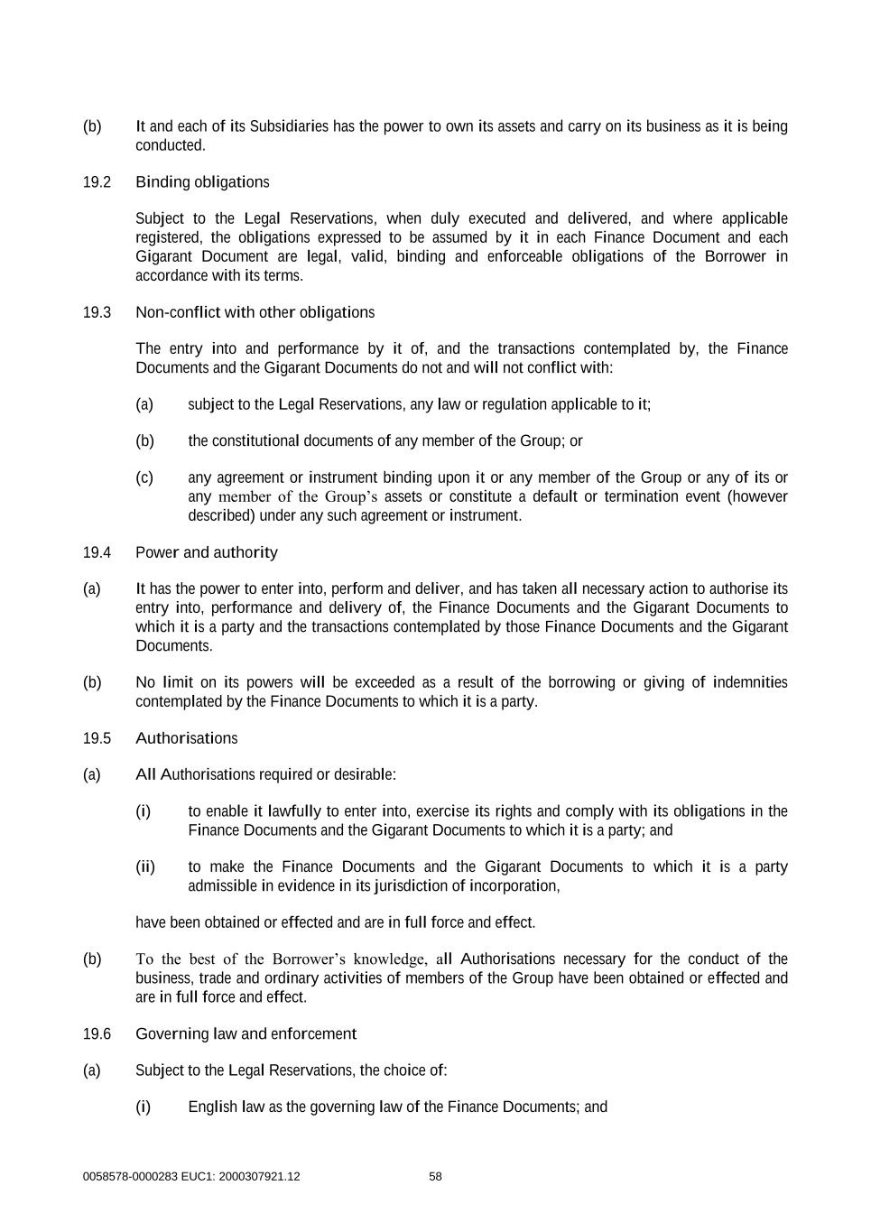 0058578-0000283 EUC1: 2000307921.12 58 (b) It and each of its Subsidiaries has the power to own its assets and carry on its business as it is being conducted. 19.2 Binding obligations Subject to the Legal Reservations, when duly executed and delivered, and where applicable registered, the obligations expressed to be assumed by it in each Finance Document and each Gigarant Document are legal, valid, binding and enforceable obligations of the Borrower in accordance with its terms. 19.3 Non-conflict with other obligations The entry into and performance by it of, and the transactions contemplated by, the Finance Documents and the Gigarant Documents do not and will not conflict with: (a) subject to the Legal Reservations, any law or regulation applicable to it; (b) the constitutional documents of any member of the Group; or (c) any agreement or instrument binding upon it or any member of the Group or any of its or any member of the Group’s assets or constitute a default or termination event (however described) under any such agreement or instrument. 19.4 Power and authority (a) It has the power to enter into, perform and deliver, and has taken all necessary action to authorise its entry into, performance and delivery of, the Finance Documents and the Gigarant Documents to which it is a party and the transactions contemplated by those Finance Documents and the Gigarant Documents. (b) No limit on its powers will be exceeded as a result of the borrowing or giving of indemnities contemplated by the Finance Documents to which it is a party. 19.5 Authorisations (a) All Authorisations required or desirable: (i) to enable it lawfully to enter into, exercise its rights and comply with its obligations in the Finance Documents and the Gigarant Documents to which it is a party; and (ii) to make the Finance Documents and the Gigarant Documents to which it is a party admissible in evidence in its jurisdiction of incorporation, have been obtained or effected and are in full force and effect. (b) To the best of the Borrower’s knowledge, all Authorisations necessary for the conduct of the business, trade and ordinary activities of members of the Group have been obtained or effected and are in full force and effect. 19.6 Governing law and enforcement (a) Subject to the Legal Reservations, the choice of: (i) English law as the governing law of the Finance Documents; and