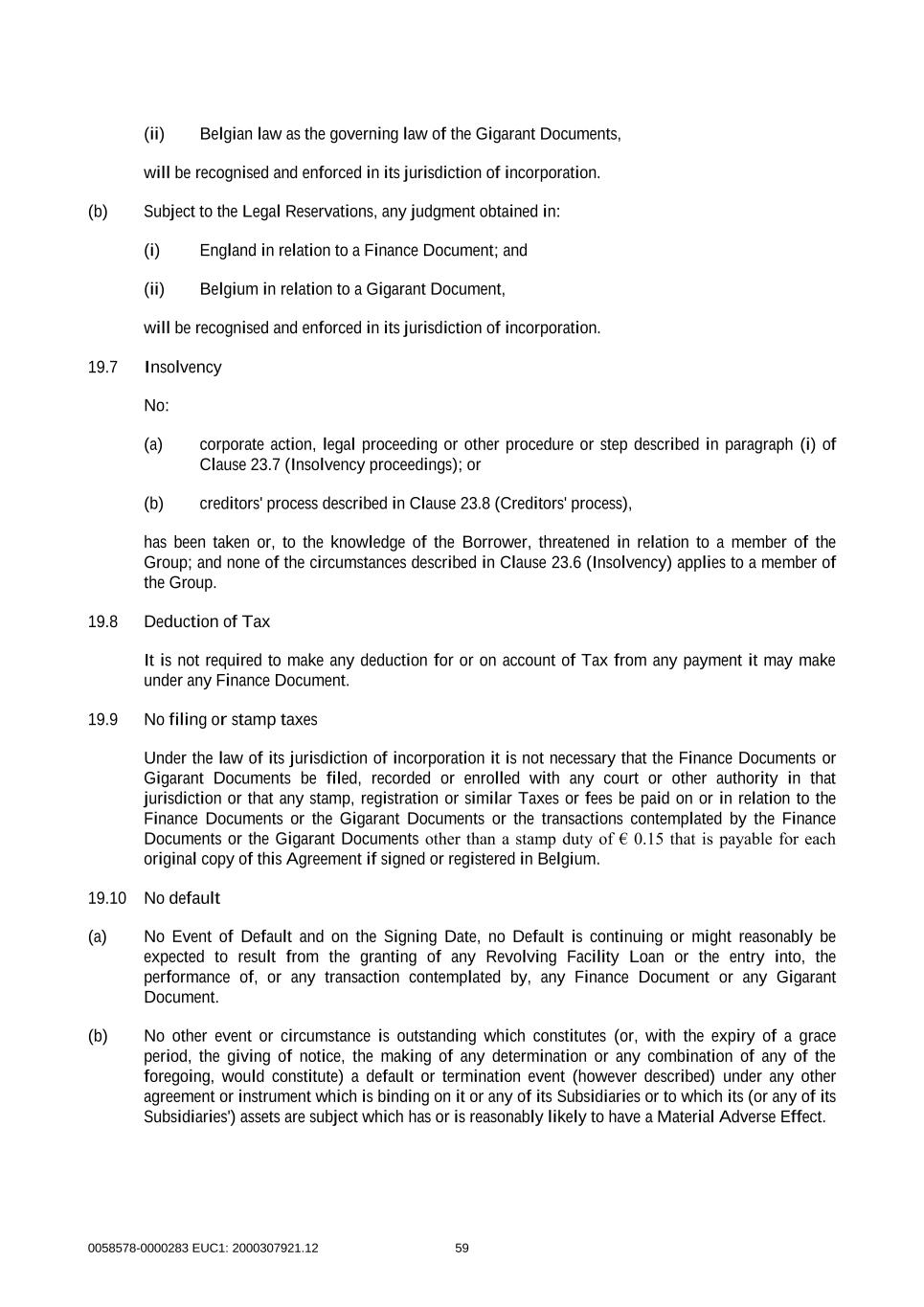 0058578-0000283 EUC1: 2000307921.12 59 (ii) Belgian law as the governing law of the Gigarant Documents, will be recognised and enforced in its jurisdiction of incorporation. (b) Subject to the Legal Reservations, any judgment obtained in: (i) England in relation to a Finance Document; and (ii) Belgium in relation to a Gigarant Document, will be recognised and enforced in its jurisdiction of incorporation. 19.7 Insolvency No: (a) corporate action, legal proceeding or other procedure or step described in paragraph (i) of Clause 23.7 (Insolvency proceedings); or (b) creditors' process described in Clause 23.8 (Creditors' process), has been taken or, to the knowledge of the Borrower, threatened in relation to a member of the Group; and none of the circumstances described in Clause 23.6 (Insolvency) applies to a member of the Group. 19.8 Deduction of Tax It is not required to make any deduction for or on account of Tax from any payment it may make under any Finance Document. 19.9 No filing or stamp taxes Under the law of its jurisdiction of incorporation it is not necessary that the Finance Documents or Gigarant Documents be filed, recorded or enrolled with any court or other authority in that jurisdiction or that any stamp, registration or similar Taxes or fees be paid on or in relation to the Finance Documents or the Gigarant Documents or the transactions contemplated by the Finance Documents or the Gigarant Documents other than a stamp duty of € 0.15 that is payable for each original copy of this Agreement if signed or registered in Belgium. 19.10 No default (a) No Event of Default and on the Signing Date, no Default is continuing or might reasonably be expected to result from the granting of any Revolving Facility Loan or the entry into, the performance of, or any transaction contemplated by, any Finance Document or any Gigarant Document. (b) No other event or circumstance is outstanding which constitutes (or, with the expiry of a grace period, the giving of notice, the making of any determination or any combination of any of the foregoing, would constitute) a default or termination event (however described) under any other agreement or instrument which is binding on it or any of its Subsidiaries or to which its (or any of its Subsidiaries') assets are subject which has or is reasonably likely to have a Material Adverse Effect.