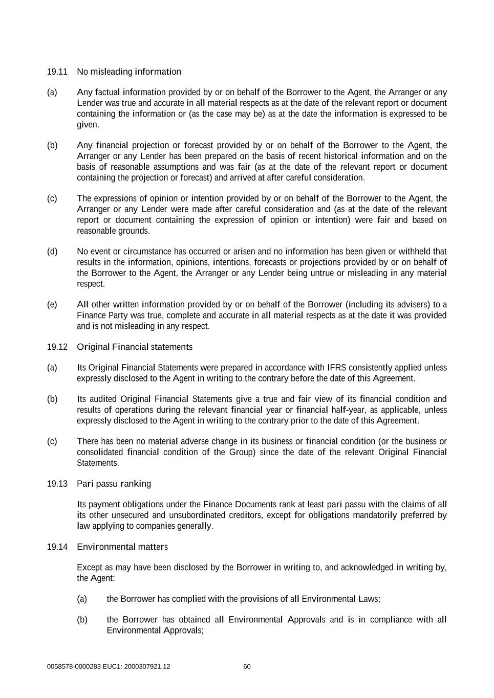 0058578-0000283 EUC1: 2000307921.12 60 19.11 No misleading information (a) Any factual information provided by or on behalf of the Borrower to the Agent, the Arranger or any Lender was true and accurate in all material respects as at the date of the relevant report or document containing the information or (as the case may be) as at the date the information is expressed to be given. (b) Any financial projection or forecast provided by or on behalf of the Borrower to the Agent, the Arranger or any Lender has been prepared on the basis of recent historical information and on the basis of reasonable assumptions and was fair (as at the date of the relevant report or document containing the projection or forecast) and arrived at after careful consideration. (c) The expressions of opinion or intention provided by or on behalf of the Borrower to the Agent, the Arranger or any Lender were made after careful consideration and (as at the date of the relevant report or document containing the expression of opinion or intention) were fair and based on reasonable grounds. (d) No event or circumstance has occurred or arisen and no information has been given or withheld that results in the information, opinions, intentions, forecasts or projections provided by or on behalf of the Borrower to the Agent, the Arranger or any Lender being untrue or misleading in any material respect. (e) All other written information provided by or on behalf of the Borrower (including its advisers) to a Finance Party was true, complete and accurate in all material respects as at the date it was provided and is not misleading in any respect. 19.12 Original Financial statements (a) Its Original Financial Statements were prepared in accordance with IFRS consistently applied unless expressly disclosed to the Agent in writing to the contrary before the date of this Agreement. (b) Its audited Original Financial Statements give a true and fair view of its financial condition and results of operations during the relevant financial year or financial half-year, as applicable, unless expressly disclosed to the Agent in writing to the contrary prior to the date of this Agreement. (c) There has been no material adverse change in its business or financial condition (or the business or consolidated financial condition of the Group) since the date of the relevant Original Financial Statements. 19.13 Pari passu ranking Its payment obligations under the Finance Documents rank at least pari passu with the claims of all its other unsecured and unsubordinated creditors, except for obligations mandatorily preferred by law applying to companies generally. 19.14 Environmental matters Except as may have been disclosed by the Borrower in writing to, and acknowledged in writing by, the Agent: (a) the Borrower has complied with the provisions of all Environmental Laws; (b) the Borrower has obtained all Environmental Approvals and is in compliance with all Environmental Approvals;