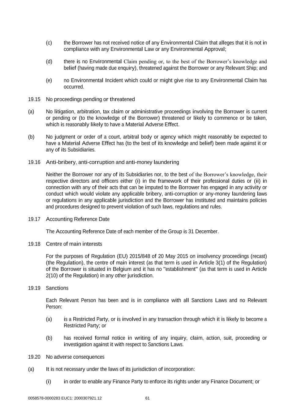 0058578-0000283 EUC1: 2000307921.12 61 (c) the Borrower has not received notice of any Environmental Claim that alleges that it is not in compliance with any Environmental Law or any Environmental Approval; (d) there is no Environmental Claim pending or, to the best of the Borrower’s knowledge and belief (having made due enquiry), threatened against the Borrower or any Relevant Ship; and (e) no Environmental Incident which could or might give rise to any Environmental Claim has occurred. 19.15 No proceedings pending or threatened (a) No litigation, arbitration, tax claim or administrative proceedings involving the Borrower is current or pending or (to the knowledge of the Borrower) threatened or likely to commence or be taken, which is reasonably likely to have a Material Adverse Effect. (b) No judgment or order of a court, arbitral body or agency which might reasonably be expected to have a Material Adverse Effect has (to the best of its knowledge and belief) been made against it or any of its Subsidiaries. 19.16 Anti-bribery, anti-corruption and anti-money laundering Neither the Borrower nor any of its Subsidiaries nor, to the best of the Borrower’s knowledge, their respective directors and officers either (i) in the framework of their professional duties or (ii) in connection with any of their acts that can be imputed to the Borrower has engaged in any activity or conduct which would violate any applicable bribery, anti-corruption or any-money laundering laws or regulations in any applicable jurisdiction and the Borrower has instituted and maintains policies and procedures designed to prevent violation of such laws, regulations and rules. 19.17 Accounting Reference Date The Accounting Reference Date of each member of the Group is 31 December. 19.18 Centre of main interests For the purposes of Regulation (EU) 2015/848 of 20 May 2015 on insolvency proceedings (recast) (the Regulation), the centre of main interest (as that term is used in Article 3(1) of the Regulation) of the Borrower is situated in Belgium and it has no "establishment" (as that term is used in Article 2(10) of the Regulation) in any other jurisdiction. 19.19 Sanctions Each Relevant Person has been and is in compliance with all Sanctions Laws and no Relevant Person: (a) is a Restricted Party, or is involved in any transaction through which it is likely to become a Restricted Party; or (b) has received formal notice in writing of any inquiry, claim, action, suit, proceeding or investigation against it with respect to Sanctions Laws. 19.20 No adverse consequences (a) It is not necessary under the laws of its jurisdiction of incorporation: (i) in order to enable any Finance Party to enforce its rights under any Finance Document; or