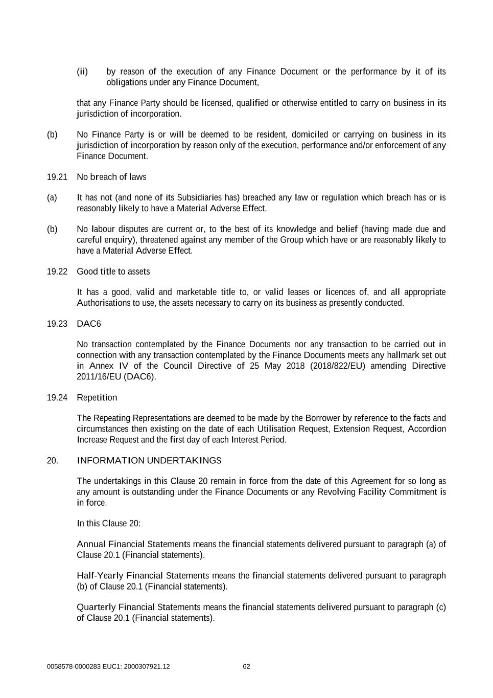 0058578-0000283 EUC1: 2000307921.12 62 (ii) by reason of the execution of any Finance Document or the performance by it of its obligations under any Finance Document, that any Finance Party should be licensed, qualified or otherwise entitled to carry on business in its jurisdiction of incorporation. (b) No Finance Party is or will be deemed to be resident, domiciled or carrying on business in its jurisdiction of incorporation by reason only of the execution, performance and/or enforcement of any Finance Document. 19.21 No breach of laws (a) It has not (and none of its Subsidiaries has) breached any law or regulation which breach has or is reasonably likely to have a Material Adverse Effect. (b) No labour disputes are current or, to the best of its knowledge and belief (having made due and careful enquiry), threatened against any member of the Group which have or are reasonably likely to have a Material Adverse Effect. 19.22 Good title to assets It has a good, valid and marketable title to, or valid leases or licences of, and all appropriate Authorisations to use, the assets necessary to carry on its business as presently conducted. 19.23 DAC6 No transaction contemplated by the Finance Documents nor any transaction to be carried out in connection with any transaction contemplated by the Finance Documents meets any hallmark set out in Annex IV of the Council Directive of 25 May 2018 (2018/822/EU) amending Directive 2011/16/EU (DAC6). 19.24 Repetition The Repeating Representations are deemed to be made by the Borrower by reference to the facts and circumstances then existing on the date of each Utilisation Request, Extension Request, Accordion Increase Request and the first day of each Interest Period. 20. INFORMATION UNDERTAKINGS The undertakings in this Clause 20 remain in force from the date of this Agreement for so long as any amount is outstanding under the Finance Documents or any Revolving Facility Commitment is in force. In this Clause 20: Annual Financial Statements means the financial statements delivered pursuant to paragraph (a) of Clause 20.1 (Financial statements). Half-Yearly Financial Statements means the financial statements delivered pursuant to paragraph (b) of Clause 20.1 (Financial statements). Quarterly Financial Statements means the financial statements delivered pursuant to paragraph (c) of Clause 20.1 (Financial statements).