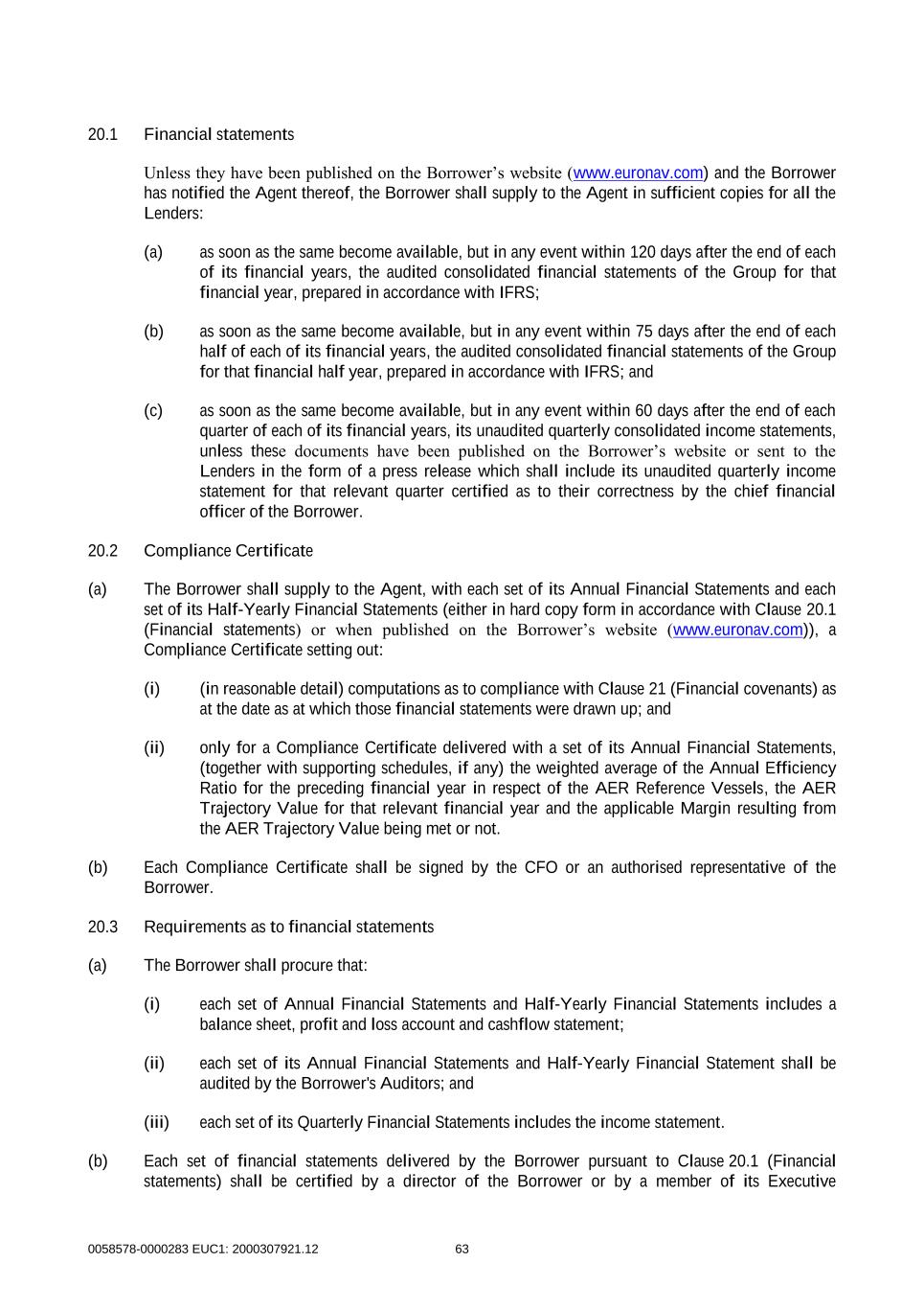 0058578-0000283 EUC1: 2000307921.12 63 20.1 Financial statements Unless they have been published on the Borrower’s website (www.euronav.com) and the Borrower has notified the Agent thereof, the Borrower shall supply to the Agent in sufficient copies for all the Lenders: (a) as soon as the same become available, but in any event within 120 days after the end of each of its financial years, the audited consolidated financial statements of the Group for that financial year, prepared in accordance with IFRS; (b) as soon as the same become available, but in any event within 75 days after the end of each half of each of its financial years, the audited consolidated financial statements of the Group for that financial half year, prepared in accordance with IFRS; and (c) as soon as the same become available, but in any event within 60 days after the end of each quarter of each of its financial years, its unaudited quarterly consolidated income statements, unless these documents have been published on the Borrower’s website or sent to the Lenders in the form of a press release which shall include its unaudited quarterly income statement for that relevant quarter certified as to their correctness by the chief financial officer of the Borrower. 20.2 Compliance Certificate (a) The Borrower shall supply to the Agent, with each set of its Annual Financial Statements and each set of its Half-Yearly Financial Statements (either in hard copy form in accordance with Clause 20.1 (Financial statements) or when published on the Borrower’s website (www.euronav.com)), a Compliance Certificate setting out: (i) (in reasonable detail) computations as to compliance with Clause 21 (Financial covenants) as at the date as at which those financial statements were drawn up; and (ii) only for a Compliance Certificate delivered with a set of its Annual Financial Statements, (together with supporting schedules, if any) the weighted average of the Annual Efficiency Ratio for the preceding financial year in respect of the AER Reference Vessels, the AER Trajectory Value for that relevant financial year and the applicable Margin resulting from the AER Trajectory Value being met or not. (b) Each Compliance Certificate shall be signed by the CFO or an authorised representative of the Borrower. 20.3 Requirements as to financial statements (a) The Borrower shall procure that: (i) each set of Annual Financial Statements and Half-Yearly Financial Statements includes a balance sheet, profit and loss account and cashflow statement; (ii) each set of its Annual Financial Statements and Half-Yearly Financial Statement shall be audited by the Borrower's Auditors; and (iii) each set of its Quarterly Financial Statements includes the income statement. (b) Each set of financial statements delivered by the Borrower pursuant to Clause 20.1 (Financial statements) shall be certified by a director of the Borrower or by a member of its Executive