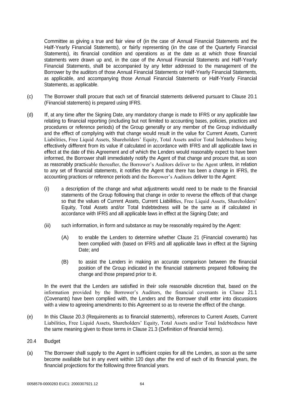 0058578-0000283 EUC1: 2000307921.12 64 Committee as giving a true and fair view of (in the case of Annual Financial Statements and the Half-Yearly Financial Statements), or fairly representing (in the case of the Quarterly Financial Statements), its financial condition and operations as at the date as at which those financial statements were drawn up and, in the case of the Annual Financial Statements and Half-Yearly Financial Statements, shall be accompanied by any letter addressed to the management of the Borrower by the auditors of those Annual Financial Statements or Half-Yearly Financial Statements, as applicable, and accompanying those Annual Financial Statements or Half-Yearly Financial Statements, as applicable. (c) The Borrower shall procure that each set of financial statements delivered pursuant to Clause 20.1 (Financial statements) is prepared using IFRS. (d) If, at any time after the Signing Date, any mandatory change is made to IFRS or any applicable law relating to financial reporting (including but not limited to accounting bases, policies, practices and procedures or reference periods) of the Group generally or any member of the Group individually and the effect of complying with that change would result in the value for Current Assets, Current Liabilities, Free Liquid Assets, Shareholders’ Equity, Total Assets and/or Total Indebtedness being effectively different from its value if calculated in accordance with IFRS and all applicable laws in effect at the date of this Agreement and of which the Lenders would reasonably expect to have been informed, the Borrower shall immediately notify the Agent of that change and procure that, as soon as reasonably practicable thereafter, the Borrower’s Auditors deliver to the Agent unless, in relation to any set of financial statements, it notifies the Agent that there has been a change in IFRS, the accounting practices or reference periods and the Borrower’s Auditors deliver to the Agent: (i) a description of the change and what adjustments would need to be made to the financial statements of the Group following that change in order to reverse the effects of that change so that the values of Current Assets, Current Liabilities, Free Liquid Assets, Shareholders’ Equity, Total Assets and/or Total Indebtedness will be the same as if calculated in accordance with IFRS and all applicable laws in effect at the Signing Date; and (ii) such information, in form and substance as may be reasonably required by the Agent: (A) to enable the Lenders to determine whether Clause 21 (Financial covenants) has been complied with (based on IFRS and all applicable laws in effect at the Signing Date; and (B) to assist the Lenders in making an accurate comparison between the financial position of the Group indicated in the financial statements prepared following the change and those prepared prior to it. In the event that the Lenders are satisfied in their sole reasonable discretion that, based on the information provided by the Borrower’s Auditors, the financial covenants in Clause 21.1 (Covenants) have been complied with, the Lenders and the Borrower shall enter into discussions with a view to agreeing amendments to this Agreement so as to reverse the effect of the change. (e) In this Clause 20.3 (Requirements as to financial statements), references to Current Assets, Current Liabilities, Free Liquid Assets, Shareholders’ Equity, Total Assets and/or Total Indebtedness have the same meaning given to those terms in Clause 21.3 (Definition of financial terms). 20.4 Budget (a) The Borrower shall supply to the Agent in sufficient copies for all the Lenders, as soon as the same become available but in any event within 120 days after the end of each of its financial years, the financial projections for the following three financial years.