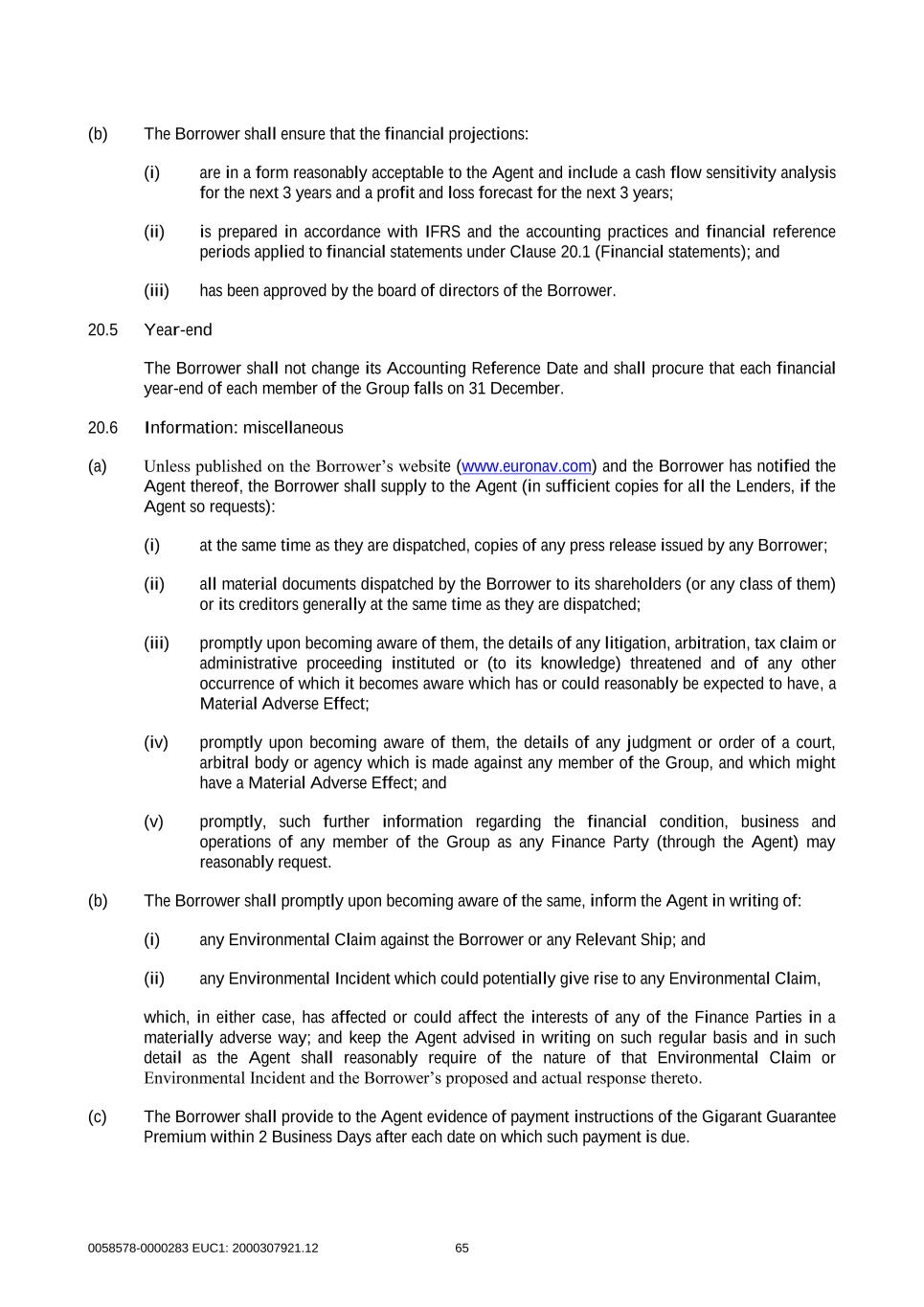 0058578-0000283 EUC1: 2000307921.12 65 (b) The Borrower shall ensure that the financial projections: (i) are in a form reasonably acceptable to the Agent and include a cash flow sensitivity analysis for the next 3 years and a profit and loss forecast for the next 3 years; (ii) is prepared in accordance with IFRS and the accounting practices and financial reference periods applied to financial statements under Clause 20.1 (Financial statements); and (iii) has been approved by the board of directors of the Borrower. 20.5 Year-end The Borrower shall not change its Accounting Reference Date and shall procure that each financial year-end of each member of the Group falls on 31 December. 20.6 Information: miscellaneous (a) Unless published on the Borrower’s website (www.euronav.com) and the Borrower has notified the Agent thereof, the Borrower shall supply to the Agent (in sufficient copies for all the Lenders, if the Agent so requests): (i) at the same time as they are dispatched, copies of any press release issued by any Borrower; (ii) all material documents dispatched by the Borrower to its shareholders (or any class of them) or its creditors generally at the same time as they are dispatched; (iii) promptly upon becoming aware of them, the details of any litigation, arbitration, tax claim or administrative proceeding instituted or (to its knowledge) threatened and of any other occurrence of which it becomes aware which has or could reasonably be expected to have, a Material Adverse Effect; (iv) promptly upon becoming aware of them, the details of any judgment or order of a court, arbitral body or agency which is made against any member of the Group, and which might have a Material Adverse Effect; and (v) promptly, such further information regarding the financial condition, business and operations of any member of the Group as any Finance Party (through the Agent) may reasonably request. (b) The Borrower shall promptly upon becoming aware of the same, inform the Agent in writing of: (i) any Environmental Claim against the Borrower or any Relevant Ship; and (ii) any Environmental Incident which could potentially give rise to any Environmental Claim, which, in either case, has affected or could affect the interests of any of the Finance Parties in a materially adverse way; and keep the Agent advised in writing on such regular basis and in such detail as the Agent shall reasonably require of the nature of that Environmental Claim or Environmental Incident and the Borrower’s proposed and actual response thereto. (c) The Borrower shall provide to the Agent evidence of payment instructions of the Gigarant Guarantee Premium within 2 Business Days after each date on which such payment is due.
