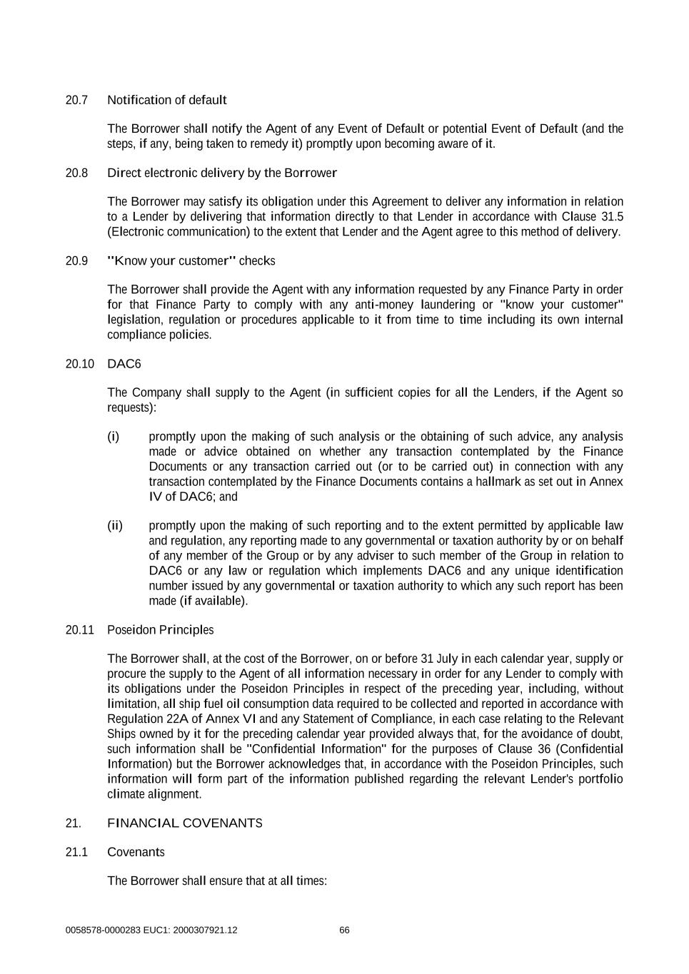0058578-0000283 EUC1: 2000307921.12 66 20.7 Notification of default The Borrower shall notify the Agent of any Event of Default or potential Event of Default (and the steps, if any, being taken to remedy it) promptly upon becoming aware of it. 20.8 Direct electronic delivery by the Borrower The Borrower may satisfy its obligation under this Agreement to deliver any information in relation to a Lender by delivering that information directly to that Lender in accordance with Clause 31.5 (Electronic communication) to the extent that Lender and the Agent agree to this method of delivery. 20.9 "Know your customer" checks The Borrower shall provide the Agent with any information requested by any Finance Party in order for that Finance Party to comply with any anti-money laundering or "know your customer" legislation, regulation or procedures applicable to it from time to time including its own internal compliance policies. 20.10 DAC6 The Company shall supply to the Agent (in sufficient copies for all the Lenders, if the Agent so requests): (i) promptly upon the making of such analysis or the obtaining of such advice, any analysis made or advice obtained on whether any transaction contemplated by the Finance Documents or any transaction carried out (or to be carried out) in connection with any transaction contemplated by the Finance Documents contains a hallmark as set out in Annex IV of DAC6; and (ii) promptly upon the making of such reporting and to the extent permitted by applicable law and regulation, any reporting made to any governmental or taxation authority by or on behalf of any member of the Group or by any adviser to such member of the Group in relation to DAC6 or any law or regulation which implements DAC6 and any unique identification number issued by any governmental or taxation authority to which any such report has been made (if available). 20.11 Poseidon Principles The Borrower shall, at the cost of the Borrower, on or before 31 July in each calendar year, supply or procure the supply to the Agent of all information necessary in order for any Lender to comply with its obligations under the Poseidon Principles in respect of the preceding year, including, without limitation, all ship fuel oil consumption data required to be collected and reported in accordance with Regulation 22A of Annex VI and any Statement of Compliance, in each case relating to the Relevant Ships owned by it for the preceding calendar year provided always that, for the avoidance of doubt, such information shall be "Confidential Information" for the purposes of Clause 36 (Confidential Information) but the Borrower acknowledges that, in accordance with the Poseidon Principles, such information will form part of the information published regarding the relevant Lender's portfolio climate alignment. 21. FINANCIAL COVENANTS 21.1 Covenants The Borrower shall ensure that at all times: