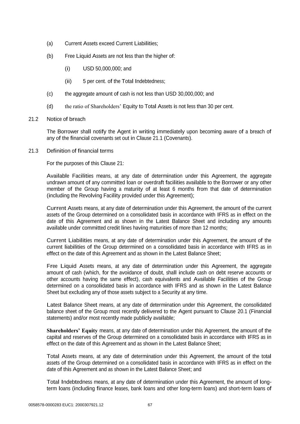 0058578-0000283 EUC1: 2000307921.12 67 (a) Current Assets exceed Current Liabilities; (b) Free Liquid Assets are not less than the higher of: (i) USD 50,000,000; and (ii) 5 per cent. of the Total Indebtedness; (c) the aggregate amount of cash is not less than USD 30,000,000; and (d) the ratio of Shareholders’ Equity to Total Assets is not less than 30 per cent. 21.2 Notice of breach The Borrower shall notify the Agent in writing immediately upon becoming aware of a breach of any of the financial covenants set out in Clause 21.1 (Covenants). 21.3 Definition of financial terms For the purposes of this Clause 21: Available Facilities means, at any date of determination under this Agreement, the aggregate undrawn amount of any committed loan or overdraft facilities available to the Borrower or any other member of the Group having a maturity of at least 6 months from that date of determination (including the Revolving Facility provided under this Agreement); Current Assets means, at any date of determination under this Agreement, the amount of the current assets of the Group determined on a consolidated basis in accordance with IFRS as in effect on the date of this Agreement and as shown in the Latest Balance Sheet and including any amounts available under committed credit lines having maturities of more than 12 months; Current Liabilities means, at any date of determination under this Agreement, the amount of the current liabilities of the Group determined on a consolidated basis in accordance with IFRS as in effect on the date of this Agreement and as shown in the Latest Balance Sheet; Free Liquid Assets means, at any date of determination under this Agreement, the aggregate amount of cash (which, for the avoidance of doubt, shall include cash on debt reserve accounts or other accounts having the same effect), cash equivalents and Available Facilities of the Group determined on a consolidated basis in accordance with IFRS and as shown in the Latest Balance Sheet but excluding any of those assets subject to a Security at any time. Latest Balance Sheet means, at any date of determination under this Agreement, the consolidated balance sheet of the Group most recently delivered to the Agent pursuant to Clause 20.1 (Financial statements) and/or most recently made publicly available; Shareholders’ Equity means, at any date of determination under this Agreement, the amount of the capital and reserves of the Group determined on a consolidated basis in accordance with IFRS as in effect on the date of this Agreement and as shown in the Latest Balance Sheet; Total Assets means, at any date of determination under this Agreement, the amount of the total assets of the Group determined on a consolidated basis in accordance with IFRS as in effect on the date of this Agreement and as shown in the Latest Balance Sheet; and Total Indebtedness means, at any date of determination under this Agreement, the amount of long- term loans (including finance leases, bank loans and other long-term loans) and short-term loans of