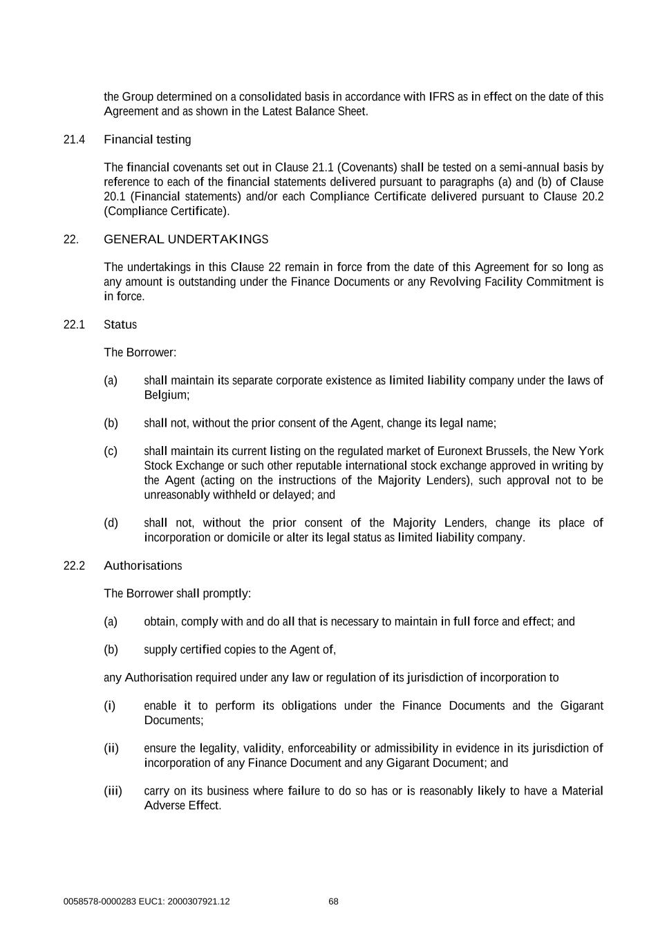 0058578-0000283 EUC1: 2000307921.12 68 the Group determined on a consolidated basis in accordance with IFRS as in effect on the date of this Agreement and as shown in the Latest Balance Sheet. 21.4 Financial testing The financial covenants set out in Clause 21.1 (Covenants) shall be tested on a semi-annual basis by reference to each of the financial statements delivered pursuant to paragraphs (a) and (b) of Clause 20.1 (Financial statements) and/or each Compliance Certificate delivered pursuant to Clause 20.2 (Compliance Certificate). 22. GENERAL UNDERTAKINGS The undertakings in this Clause 22 remain in force from the date of this Agreement for so long as any amount is outstanding under the Finance Documents or any Revolving Facility Commitment is in force. 22.1 Status The Borrower: (a) shall maintain its separate corporate existence as limited liability company under the laws of Belgium; (b) shall not, without the prior consent of the Agent, change its legal name; (c) shall maintain its current listing on the regulated market of Euronext Brussels, the New York Stock Exchange or such other reputable international stock exchange approved in writing by the Agent (acting on the instructions of the Majority Lenders), such approval not to be unreasonably withheld or delayed; and (d) shall not, without the prior consent of the Majority Lenders, change its place of incorporation or domicile or alter its legal status as limited liability company. 22.2 Authorisations The Borrower shall promptly: (a) obtain, comply with and do all that is necessary to maintain in full force and effect; and (b) supply certified copies to the Agent of, any Authorisation required under any law or regulation of its jurisdiction of incorporation to (i) enable it to perform its obligations under the Finance Documents and the Gigarant Documents; (ii) ensure the legality, validity, enforceability or admissibility in evidence in its jurisdiction of incorporation of any Finance Document and any Gigarant Document; and (iii) carry on its business where failure to do so has or is reasonably likely to have a Material Adverse Effect.
