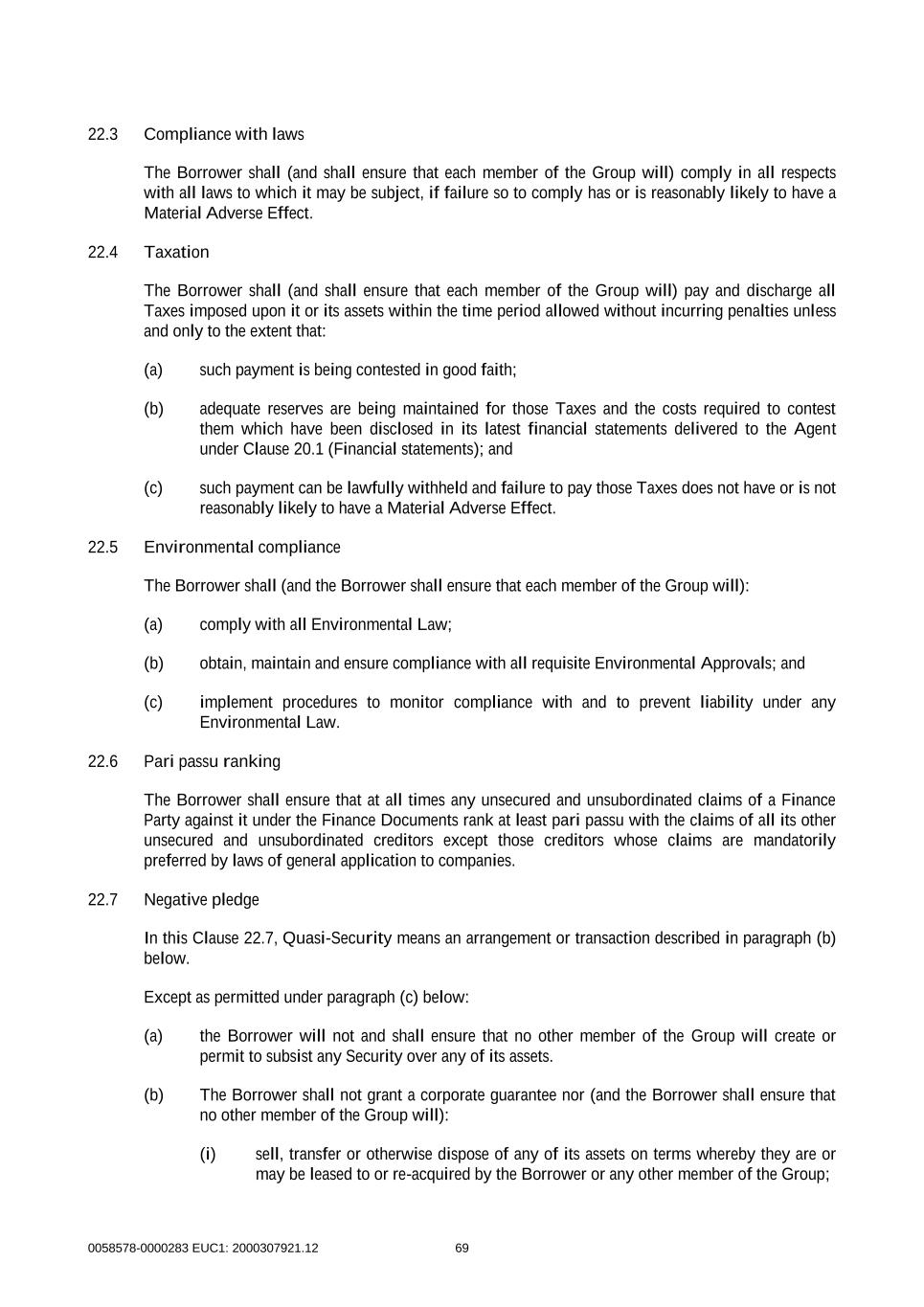 0058578-0000283 EUC1: 2000307921.12 69 22.3 Compliance with laws The Borrower shall (and shall ensure that each member of the Group will) comply in all respects with all laws to which it may be subject, if failure so to comply has or is reasonably likely to have a Material Adverse Effect. 22.4 Taxation The Borrower shall (and shall ensure that each member of the Group will) pay and discharge all Taxes imposed upon it or its assets within the time period allowed without incurring penalties unless and only to the extent that: (a) such payment is being contested in good faith; (b) adequate reserves are being maintained for those Taxes and the costs required to contest them which have been disclosed in its latest financial statements delivered to the Agent under Clause 20.1 (Financial statements); and (c) such payment can be lawfully withheld and failure to pay those Taxes does not have or is not reasonably likely to have a Material Adverse Effect. 22.5 Environmental compliance The Borrower shall (and the Borrower shall ensure that each member of the Group will): (a) comply with all Environmental Law; (b) obtain, maintain and ensure compliance with all requisite Environmental Approvals; and (c) implement procedures to monitor compliance with and to prevent liability under any Environmental Law. 22.6 Pari passu ranking The Borrower shall ensure that at all times any unsecured and unsubordinated claims of a Finance Party against it under the Finance Documents rank at least pari passu with the claims of all its other unsecured and unsubordinated creditors except those creditors whose claims are mandatorily preferred by laws of general application to companies. 22.7 Negative pledge In this Clause 22.7, Quasi-Security means an arrangement or transaction described in paragraph (b) below. Except as permitted under paragraph (c) below: (a) the Borrower will not and shall ensure that no other member of the Group will create or permit to subsist any Security over any of its assets. (b) The Borrower shall not grant a corporate guarantee nor (and the Borrower shall ensure that no other member of the Group will): (i) sell, transfer or otherwise dispose of any of its assets on terms whereby they are or may be leased to or re-acquired by the Borrower or any other member of the Group;