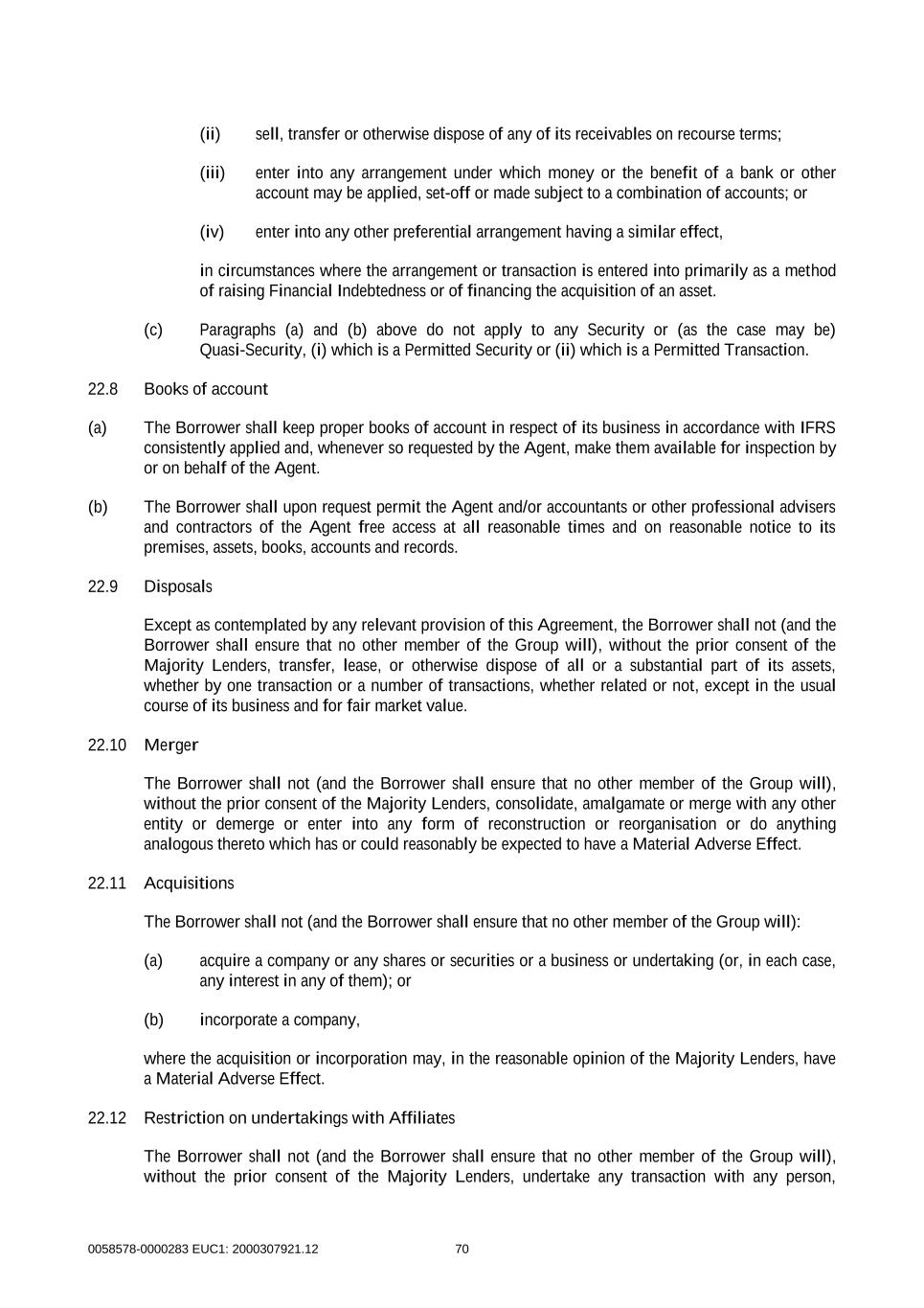 0058578-0000283 EUC1: 2000307921.12 70 (ii) sell, transfer or otherwise dispose of any of its receivables on recourse terms; (iii) enter into any arrangement under which money or the benefit of a bank or other account may be applied, set-off or made subject to a combination of accounts; or (iv) enter into any other preferential arrangement having a similar effect, in circumstances where the arrangement or transaction is entered into primarily as a method of raising Financial Indebtedness or of financing the acquisition of an asset. (c) Paragraphs (a) and (b) above do not apply to any Security or (as the case may be) Quasi-Security, (i) which is a Permitted Security or (ii) which is a Permitted Transaction. 22.8 Books of account (a) The Borrower shall keep proper books of account in respect of its business in accordance with IFRS consistently applied and, whenever so requested by the Agent, make them available for inspection by or on behalf of the Agent. (b) The Borrower shall upon request permit the Agent and/or accountants or other professional advisers and contractors of the Agent free access at all reasonable times and on reasonable notice to its premises, assets, books, accounts and records. 22.9 Disposals Except as contemplated by any relevant provision of this Agreement, the Borrower shall not (and the Borrower shall ensure that no other member of the Group will), without the prior consent of the Majority Lenders, transfer, lease, or otherwise dispose of all or a substantial part of its assets, whether by one transaction or a number of transactions, whether related or not, except in the usual course of its business and for fair market value. 22.10 Merger The Borrower shall not (and the Borrower shall ensure that no other member of the Group will), without the prior consent of the Majority Lenders, consolidate, amalgamate or merge with any other entity or demerge or enter into any form of reconstruction or reorganisation or do anything analogous thereto which has or could reasonably be expected to have a Material Adverse Effect. 22.11 Acquisitions The Borrower shall not (and the Borrower shall ensure that no other member of the Group will): (a) acquire a company or any shares or securities or a business or undertaking (or, in each case, any interest in any of them); or (b) incorporate a company, where the acquisition or incorporation may, in the reasonable opinion of the Majority Lenders, have a Material Adverse Effect. 22.12 Restriction on undertakings with Affiliates The Borrower shall not (and the Borrower shall ensure that no other member of the Group will), without the prior consent of the Majority Lenders, undertake any transaction with any person,