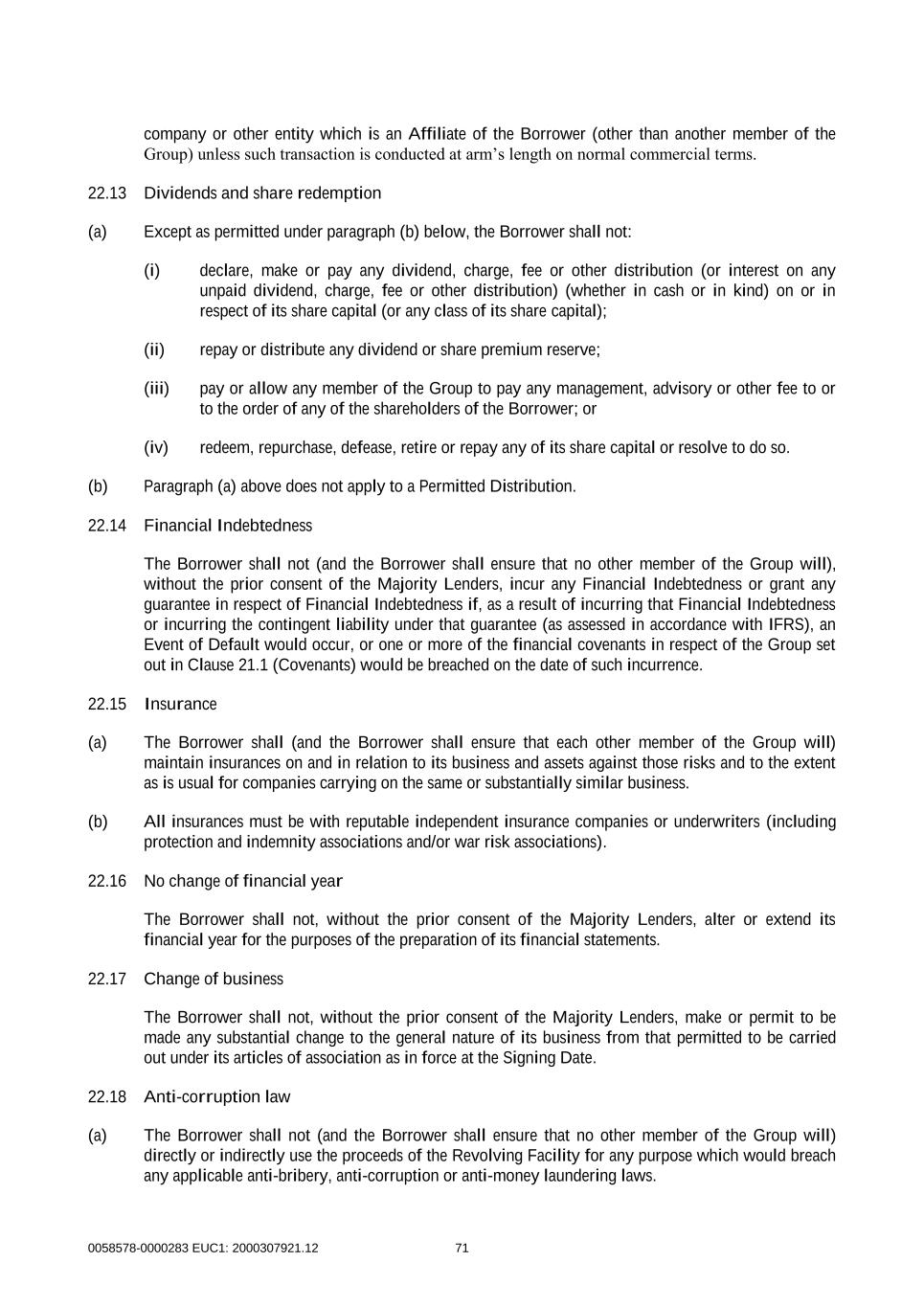 0058578-0000283 EUC1: 2000307921.12 71 company or other entity which is an Affiliate of the Borrower (other than another member of the Group) unless such transaction is conducted at arm’s length on normal commercial terms. 22.13 Dividends and share redemption (a) Except as permitted under paragraph (b) below, the Borrower shall not: (i) declare, make or pay any dividend, charge, fee or other distribution (or interest on any unpaid dividend, charge, fee or other distribution) (whether in cash or in kind) on or in respect of its share capital (or any class of its share capital); (ii) repay or distribute any dividend or share premium reserve; (iii) pay or allow any member of the Group to pay any management, advisory or other fee to or to the order of any of the shareholders of the Borrower; or (iv) redeem, repurchase, defease, retire or repay any of its share capital or resolve to do so. (b) Paragraph (a) above does not apply to a Permitted Distribution. 22.14 Financial Indebtedness The Borrower shall not (and the Borrower shall ensure that no other member of the Group will), without the prior consent of the Majority Lenders, incur any Financial Indebtedness or grant any guarantee in respect of Financial Indebtedness if, as a result of incurring that Financial Indebtedness or incurring the contingent liability under that guarantee (as assessed in accordance with IFRS), an Event of Default would occur, or one or more of the financial covenants in respect of the Group set out in Clause 21.1 (Covenants) would be breached on the date of such incurrence. 22.15 Insurance (a) The Borrower shall (and the Borrower shall ensure that each other member of the Group will) maintain insurances on and in relation to its business and assets against those risks and to the extent as is usual for companies carrying on the same or substantially similar business. (b) All insurances must be with reputable independent insurance companies or underwriters (including protection and indemnity associations and/or war risk associations). 22.16 No change of financial year The Borrower shall not, without the prior consent of the Majority Lenders, alter or extend its financial year for the purposes of the preparation of its financial statements. 22.17 Change of business The Borrower shall not, without the prior consent of the Majority Lenders, make or permit to be made any substantial change to the general nature of its business from that permitted to be carried out under its articles of association as in force at the Signing Date. 22.18 Anti-corruption law (a) The Borrower shall not (and the Borrower shall ensure that no other member of the Group will) directly or indirectly use the proceeds of the Revolving Facility for any purpose which would breach any applicable anti-bribery, anti-corruption or anti-money laundering laws.