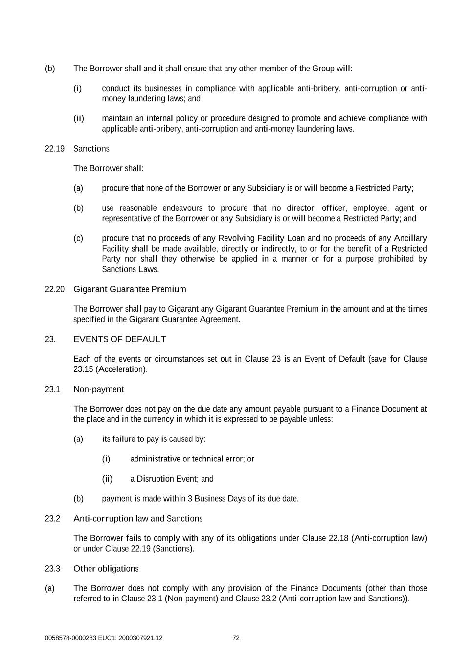 0058578-0000283 EUC1: 2000307921.12 72 (b) The Borrower shall and it shall ensure that any other member of the Group will: (i) conduct its businesses in compliance with applicable anti-bribery, anti-corruption or anti- money laundering laws; and (ii) maintain an internal policy or procedure designed to promote and achieve compliance with applicable anti-bribery, anti-corruption and anti-money laundering laws. 22.19 Sanctions The Borrower shall: (a) procure that none of the Borrower or any Subsidiary is or will become a Restricted Party; (b) use reasonable endeavours to procure that no director, officer, employee, agent or representative of the Borrower or any Subsidiary is or will become a Restricted Party; and (c) procure that no proceeds of any Revolving Facility Loan and no proceeds of any Ancillary Facility shall be made available, directly or indirectly, to or for the benefit of a Restricted Party nor shall they otherwise be applied in a manner or for a purpose prohibited by Sanctions Laws. 22.20 Gigarant Guarantee Premium The Borrower shall pay to Gigarant any Gigarant Guarantee Premium in the amount and at the times specified in the Gigarant Guarantee Agreement. 23. EVENTS OF DEFAULT Each of the events or circumstances set out in Clause 23 is an Event of Default (save for Clause 23.15 (Acceleration). 23.1 Non-payment The Borrower does not pay on the due date any amount payable pursuant to a Finance Document at the place and in the currency in which it is expressed to be payable unless: (a) its failure to pay is caused by: (i) administrative or technical error; or (ii) a Disruption Event; and (b) payment is made within 3 Business Days of its due date. 23.2 Anti-corruption law and Sanctions The Borrower fails to comply with any of its obligations under Clause 22.18 (Anti-corruption law) or under Clause 22.19 (Sanctions). 23.3 Other obligations (a) The Borrower does not comply with any provision of the Finance Documents (other than those referred to in Clause 23.1 (Non-payment) and Clause 23.2 (Anti-corruption law and Sanctions)).