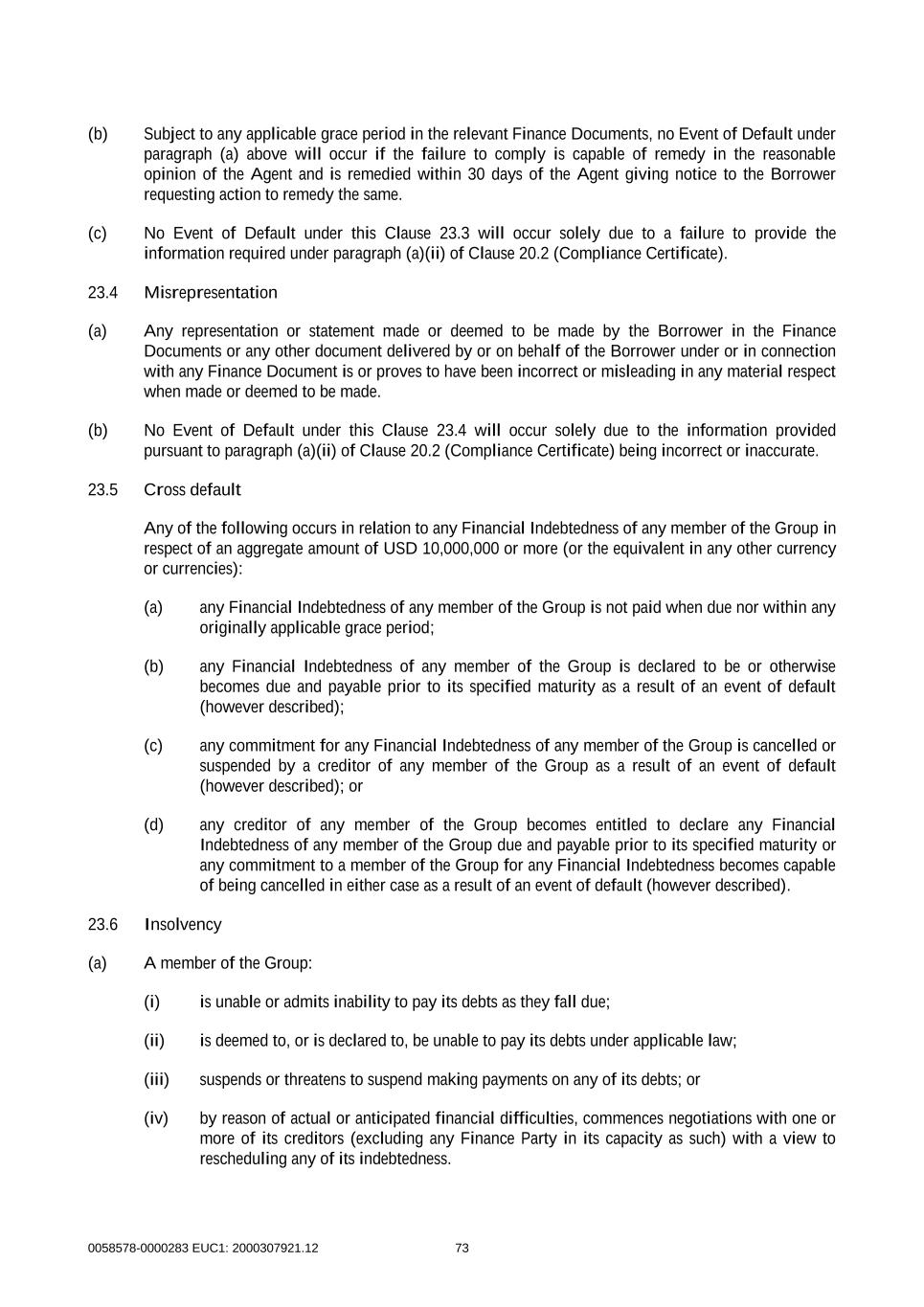 0058578-0000283 EUC1: 2000307921.12 73 (b) Subject to any applicable grace period in the relevant Finance Documents, no Event of Default under paragraph (a) above will occur if the failure to comply is capable of remedy in the reasonable opinion of the Agent and is remedied within 30 days of the Agent giving notice to the Borrower requesting action to remedy the same. (c) No Event of Default under this Clause 23.3 will occur solely due to a failure to provide the information required under paragraph (a)(ii) of Clause 20.2 (Compliance Certificate). 23.4 Misrepresentation (a) Any representation or statement made or deemed to be made by the Borrower in the Finance Documents or any other document delivered by or on behalf of the Borrower under or in connection with any Finance Document is or proves to have been incorrect or misleading in any material respect when made or deemed to be made. (b) No Event of Default under this Clause 23.4 will occur solely due to the information provided pursuant to paragraph (a)(ii) of Clause 20.2 (Compliance Certificate) being incorrect or inaccurate. 23.5 Cross default Any of the following occurs in relation to any Financial Indebtedness of any member of the Group in respect of an aggregate amount of USD 10,000,000 or more (or the equivalent in any other currency or currencies): (a) any Financial Indebtedness of any member of the Group is not paid when due nor within any originally applicable grace period; (b) any Financial Indebtedness of any member of the Group is declared to be or otherwise becomes due and payable prior to its specified maturity as a result of an event of default (however described); (c) any commitment for any Financial Indebtedness of any member of the Group is cancelled or suspended by a creditor of any member of the Group as a result of an event of default (however described); or (d) any creditor of any member of the Group becomes entitled to declare any Financial Indebtedness of any member of the Group due and payable prior to its specified maturity or any commitment to a member of the Group for any Financial Indebtedness becomes capable of being cancelled in either case as a result of an event of default (however described). 23.6 Insolvency (a) A member of the Group: (i) is unable or admits inability to pay its debts as they fall due; (ii) is deemed to, or is declared to, be unable to pay its debts under applicable law; (iii) suspends or threatens to suspend making payments on any of its debts; or (iv) by reason of actual or anticipated financial difficulties, commences negotiations with one or more of its creditors (excluding any Finance Party in its capacity as such) with a view to rescheduling any of its indebtedness.
