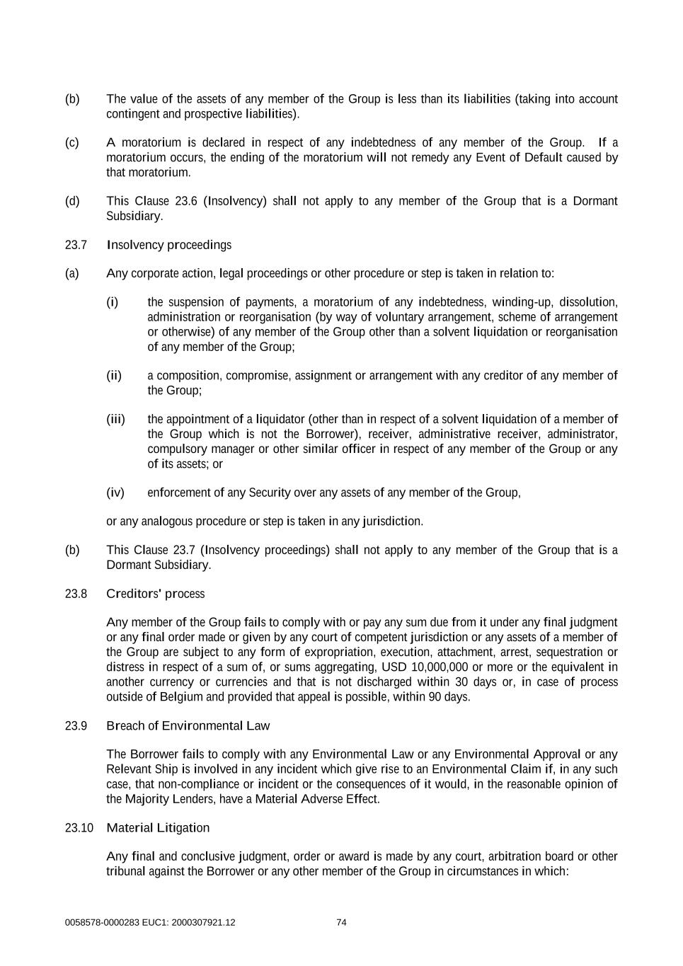 0058578-0000283 EUC1: 2000307921.12 74 (b) The value of the assets of any member of the Group is less than its liabilities (taking into account contingent and prospective liabilities). (c) A moratorium is declared in respect of any indebtedness of any member of the Group. If a moratorium occurs, the ending of the moratorium will not remedy any Event of Default caused by that moratorium. (d) This Clause 23.6 (Insolvency) shall not apply to any member of the Group that is a Dormant Subsidiary. 23.7 Insolvency proceedings (a) Any corporate action, legal proceedings or other procedure or step is taken in relation to: (i) the suspension of payments, a moratorium of any indebtedness, winding-up, dissolution, administration or reorganisation (by way of voluntary arrangement, scheme of arrangement or otherwise) of any member of the Group other than a solvent liquidation or reorganisation of any member of the Group; (ii) a composition, compromise, assignment or arrangement with any creditor of any member of the Group; (iii) the appointment of a liquidator (other than in respect of a solvent liquidation of a member of the Group which is not the Borrower), receiver, administrative receiver, administrator, compulsory manager or other similar officer in respect of any member of the Group or any of its assets; or (iv) enforcement of any Security over any assets of any member of the Group, or any analogous procedure or step is taken in any jurisdiction. (b) This Clause 23.7 (Insolvency proceedings) shall not apply to any member of the Group that is a Dormant Subsidiary. 23.8 Creditors' process Any member of the Group fails to comply with or pay any sum due from it under any final judgment or any final order made or given by any court of competent jurisdiction or any assets of a member of the Group are subject to any form of expropriation, execution, attachment, arrest, sequestration or distress in respect of a sum of, or sums aggregating, USD 10,000,000 or more or the equivalent in another currency or currencies and that is not discharged within 30 days or, in case of process outside of Belgium and provided that appeal is possible, within 90 days. 23.9 Breach of Environmental Law The Borrower fails to comply with any Environmental Law or any Environmental Approval or any Relevant Ship is involved in any incident which give rise to an Environmental Claim if, in any such case, that non-compliance or incident or the consequences of it would, in the reasonable opinion of the Majority Lenders, have a Material Adverse Effect. 23.10 Material Litigation Any final and conclusive judgment, order or award is made by any court, arbitration board or other tribunal against the Borrower or any other member of the Group in circumstances in which: