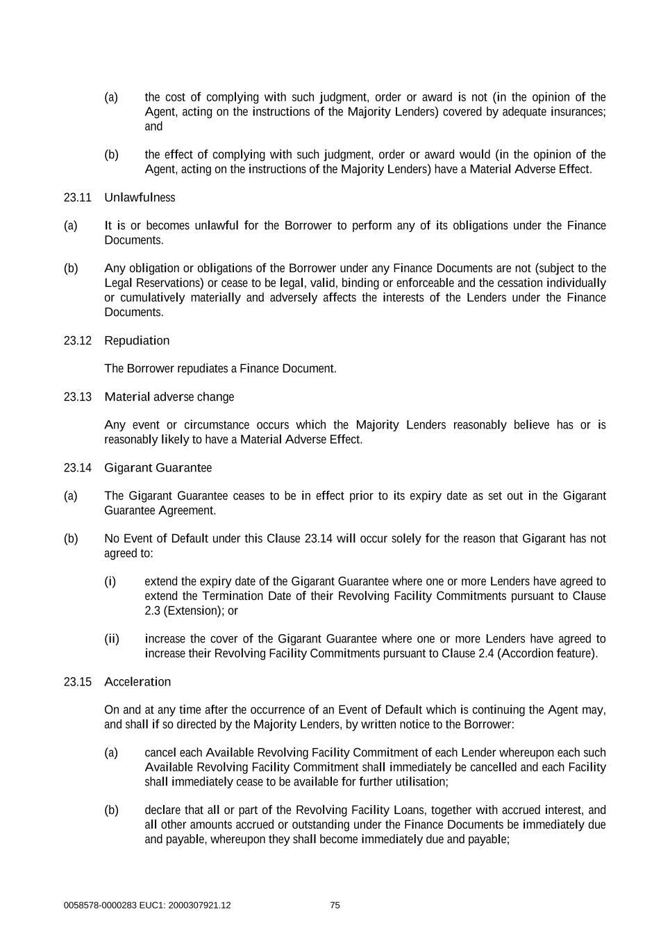0058578-0000283 EUC1: 2000307921.12 75 (a) the cost of complying with such judgment, order or award is not (in the opinion of the Agent, acting on the instructions of the Majority Lenders) covered by adequate insurances; and (b) the effect of complying with such judgment, order or award would (in the opinion of the Agent, acting on the instructions of the Majority Lenders) have a Material Adverse Effect. 23.11 Unlawfulness (a) It is or becomes unlawful for the Borrower to perform any of its obligations under the Finance Documents. (b) Any obligation or obligations of the Borrower under any Finance Documents are not (subject to the Legal Reservations) or cease to be legal, valid, binding or enforceable and the cessation individually or cumulatively materially and adversely affects the interests of the Lenders under the Finance Documents. 23.12 Repudiation The Borrower repudiates a Finance Document. 23.13 Material adverse change Any event or circumstance occurs which the Majority Lenders reasonably believe has or is reasonably likely to have a Material Adverse Effect. 23.14 Gigarant Guarantee (a) The Gigarant Guarantee ceases to be in effect prior to its expiry date as set out in the Gigarant Guarantee Agreement. (b) No Event of Default under this Clause 23.14 will occur solely for the reason that Gigarant has not agreed to: (i) extend the expiry date of the Gigarant Guarantee where one or more Lenders have agreed to extend the Termination Date of their Revolving Facility Commitments pursuant to Clause 2.3 (Extension); or (ii) increase the cover of the Gigarant Guarantee where one or more Lenders have agreed to increase their Revolving Facility Commitments pursuant to Clause 2.4 (Accordion feature). 23.15 Acceleration On and at any time after the occurrence of an Event of Default which is continuing the Agent may, and shall if so directed by the Majority Lenders, by written notice to the Borrower: (a) cancel each Available Revolving Facility Commitment of each Lender whereupon each such Available Revolving Facility Commitment shall immediately be cancelled and each Facility shall immediately cease to be available for further utilisation; (b) declare that all or part of the Revolving Facility Loans, together with accrued interest, and all other amounts accrued or outstanding under the Finance Documents be immediately due and payable, whereupon they shall become immediately due and payable;