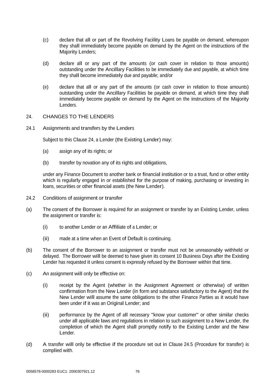 0058578-0000283 EUC1: 2000307921.12 76 (c) declare that all or part of the Revolving Facility Loans be payable on demand, whereupon they shall immediately become payable on demand by the Agent on the instructions of the Majority Lenders; (d) declare all or any part of the amounts (or cash cover in relation to those amounts) outstanding under the Ancillary Facilities to be immediately due and payable, at which time they shall become immediately due and payable; and/or (e) declare that all or any part of the amounts (or cash cover in relation to those amounts) outstanding under the Ancillary Facilities be payable on demand, at which time they shall immediately become payable on demand by the Agent on the instructions of the Majority Lenders. 24. CHANGES TO THE LENDERS 24.1 Assignments and transfers by the Lenders Subject to this Clause 24, a Lender (the Existing Lender) may: (a) assign any of its rights; or (b) transfer by novation any of its rights and obligations, under any Finance Document to another bank or financial institution or to a trust, fund or other entity which is regularly engaged in or established for the purpose of making, purchasing or investing in loans, securities or other financial assets (the New Lender). 24.2 Conditions of assignment or transfer (a) The consent of the Borrower is required for an assignment or transfer by an Existing Lender, unless the assignment or transfer is: (i) to another Lender or an Affiliate of a Lender; or (ii) made at a time when an Event of Default is continuing. (b) The consent of the Borrower to an assignment or transfer must not be unreasonably withheld or delayed. The Borrower will be deemed to have given its consent 10 Business Days after the Existing Lender has requested it unless consent is expressly refused by the Borrower within that time. (c) An assignment will only be effective on: (i) receipt by the Agent (whether in the Assignment Agreement or otherwise) of written confirmation from the New Lender (in form and substance satisfactory to the Agent) that the New Lender will assume the same obligations to the other Finance Parties as it would have been under if it was an Original Lender; and (ii) performance by the Agent of all necessary "know your customer" or other similar checks under all applicable laws and regulations in relation to such assignment to a New Lender, the completion of which the Agent shall promptly notify to the Existing Lender and the New Lender. (d) A transfer will only be effective if the procedure set out in Clause 24.5 (Procedure for transfer) is complied with.