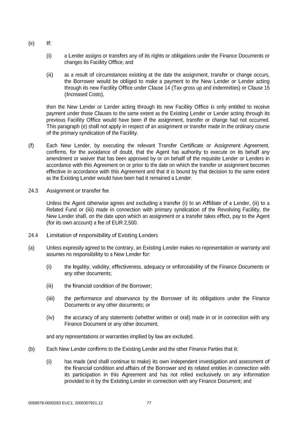 0058578-0000283 EUC1: 2000307921.12 77 (e) If: (i) a Lender assigns or transfers any of its rights or obligations under the Finance Documents or changes its Facility Office; and (ii) as a result of circumstances existing at the date the assignment, transfer or change occurs, the Borrower would be obliged to make a payment to the New Lender or Lender acting through its new Facility Office under Clause 14 (Tax gross up and indemnities) or Clause 15 (Increased Costs), then the New Lender or Lender acting through its new Facility Office is only entitled to receive payment under those Clauses to the same extent as the Existing Lender or Lender acting through its previous Facility Office would have been if the assignment, transfer or change had not occurred. This paragraph (e) shall not apply in respect of an assignment or transfer made in the ordinary course of the primary syndication of the Facility. (f) Each New Lender, by executing the relevant Transfer Certificate or Assignment Agreement, confirms, for the avoidance of doubt, that the Agent has authority to execute on its behalf any amendment or waiver that has been approved by or on behalf of the requisite Lender or Lenders in accordance with this Agreement on or prior to the date on which the transfer or assignment becomes effective in accordance with this Agreement and that it is bound by that decision to the same extent as the Existing Lender would have been had it remained a Lender. 24.3 Assignment or transfer fee Unless the Agent otherwise agrees and excluding a transfer (i) to an Affiliate of a Lender, (ii) to a Related Fund or (iii) made in connection with primary syndication of the Revolving Facility, the New Lender shall, on the date upon which an assignment or a transfer takes effect, pay to the Agent (for its own account) a fee of EUR 2,500. 24.4 Limitation of responsibility of Existing Lenders (a) Unless expressly agreed to the contrary, an Existing Lender makes no representation or warranty and assumes no responsibility to a New Lender for: (i) the legality, validity, effectiveness, adequacy or enforceability of the Finance Documents or any other documents; (ii) the financial condition of the Borrower; (iii) the performance and observance by the Borrower of its obligations under the Finance Documents or any other documents; or (iv) the accuracy of any statements (whether written or oral) made in or in connection with any Finance Document or any other document, and any representations or warranties implied by law are excluded. (b) Each New Lender confirms to the Existing Lender and the other Finance Parties that it: (i) has made (and shall continue to make) its own independent investigation and assessment of the financial condition and affairs of the Borrower and its related entities in connection with its participation in this Agreement and has not relied exclusively on any information provided to it by the Existing Lender in connection with any Finance Document; and