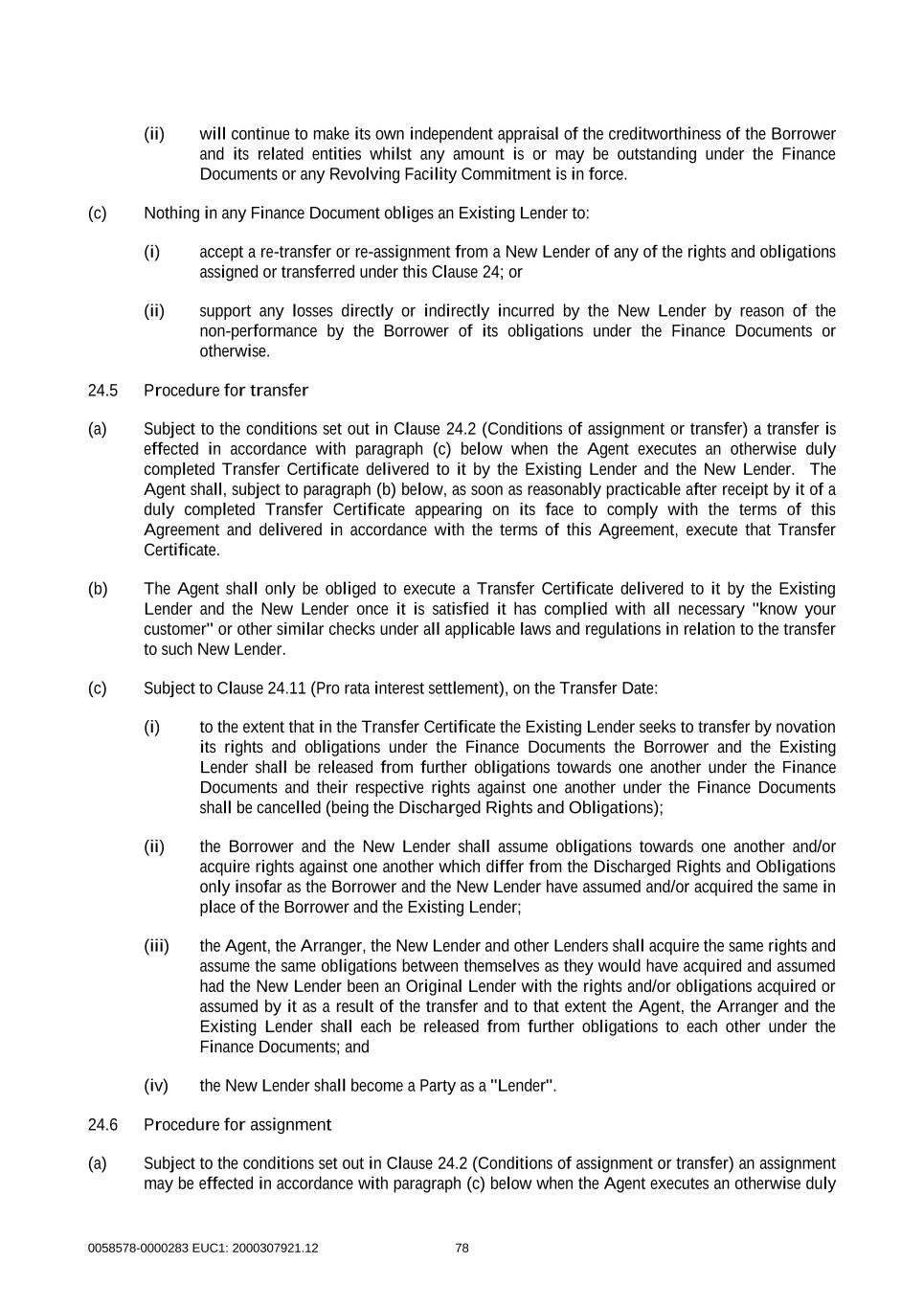 0058578-0000283 EUC1: 2000307921.12 78 (ii) will continue to make its own independent appraisal of the creditworthiness of the Borrower and its related entities whilst any amount is or may be outstanding under the Finance Documents or any Revolving Facility Commitment is in force. (c) Nothing in any Finance Document obliges an Existing Lender to: (i) accept a re-transfer or re-assignment from a New Lender of any of the rights and obligations assigned or transferred under this Clause 24; or (ii) support any losses directly or indirectly incurred by the New Lender by reason of the non-performance by the Borrower of its obligations under the Finance Documents or otherwise. 24.5 Procedure for transfer (a) Subject to the conditions set out in Clause 24.2 (Conditions of assignment or transfer) a transfer is effected in accordance with paragraph (c) below when the Agent executes an otherwise duly completed Transfer Certificate delivered to it by the Existing Lender and the New Lender. The Agent shall, subject to paragraph (b) below, as soon as reasonably practicable after receipt by it of a duly completed Transfer Certificate appearing on its face to comply with the terms of this Agreement and delivered in accordance with the terms of this Agreement, execute that Transfer Certificate. (b) The Agent shall only be obliged to execute a Transfer Certificate delivered to it by the Existing Lender and the New Lender once it is satisfied it has complied with all necessary "know your customer" or other similar checks under all applicable laws and regulations in relation to the transfer to such New Lender. (c) Subject to Clause 24.11 (Pro rata interest settlement), on the Transfer Date: (i) to the extent that in the Transfer Certificate the Existing Lender seeks to transfer by novation its rights and obligations under the Finance Documents the Borrower and the Existing Lender shall be released from further obligations towards one another under the Finance Documents and their respective rights against one another under the Finance Documents shall be cancelled (being the Discharged Rights and Obligations); (ii) the Borrower and the New Lender shall assume obligations towards one another and/or acquire rights against one another which differ from the Discharged Rights and Obligations only insofar as the Borrower and the New Lender have assumed and/or acquired the same in place of the Borrower and the Existing Lender; (iii) the Agent, the Arranger, the New Lender and other Lenders shall acquire the same rights and assume the same obligations between themselves as they would have acquired and assumed had the New Lender been an Original Lender with the rights and/or obligations acquired or assumed by it as a result of the transfer and to that extent the Agent, the Arranger and the Existing Lender shall each be released from further obligations to each other under the Finance Documents; and (iv) the New Lender shall become a Party as a "Lender". 24.6 Procedure for assignment (a) Subject to the conditions set out in Clause 24.2 (Conditions of assignment or transfer) an assignment may be effected in accordance with paragraph (c) below when the Agent executes an otherwise duly