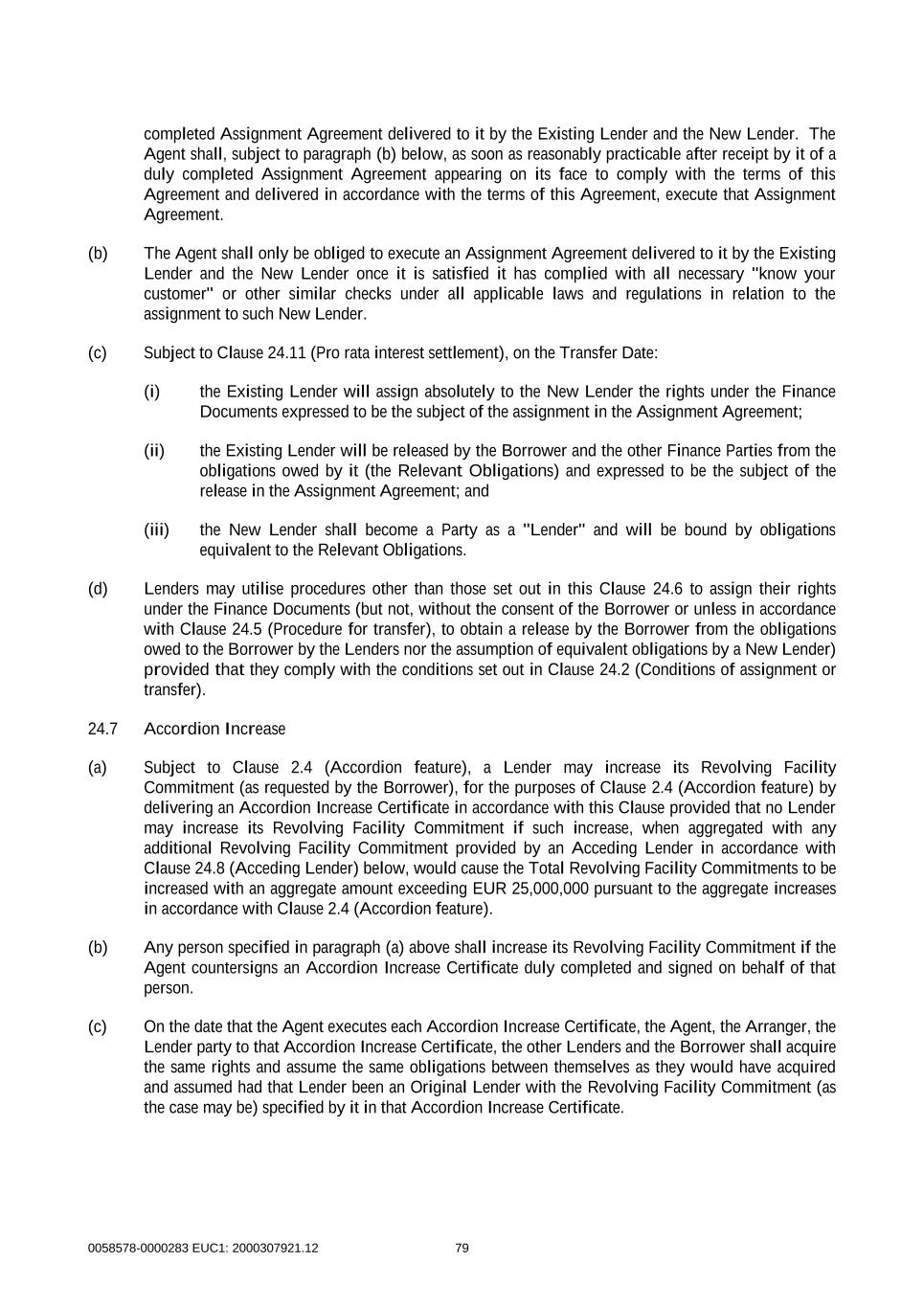 0058578-0000283 EUC1: 2000307921.12 79 completed Assignment Agreement delivered to it by the Existing Lender and the New Lender. The Agent shall, subject to paragraph (b) below, as soon as reasonably practicable after receipt by it of a duly completed Assignment Agreement appearing on its face to comply with the terms of this Agreement and delivered in accordance with the terms of this Agreement, execute that Assignment Agreement. (b) The Agent shall only be obliged to execute an Assignment Agreement delivered to it by the Existing Lender and the New Lender once it is satisfied it has complied with all necessary "know your customer" or other similar checks under all applicable laws and regulations in relation to the assignment to such New Lender. (c) Subject to Clause 24.11 (Pro rata interest settlement), on the Transfer Date: (i) the Existing Lender will assign absolutely to the New Lender the rights under the Finance Documents expressed to be the subject of the assignment in the Assignment Agreement; (ii) the Existing Lender will be released by the Borrower and the other Finance Parties from the obligations owed by it (the Relevant Obligations) and expressed to be the subject of the release in the Assignment Agreement; and (iii) the New Lender shall become a Party as a "Lender" and will be bound by obligations equivalent to the Relevant Obligations. (d) Lenders may utilise procedures other than those set out in this Clause 24.6 to assign their rights under the Finance Documents (but not, without the consent of the Borrower or unless in accordance with Clause 24.5 (Procedure for transfer), to obtain a release by the Borrower from the obligations owed to the Borrower by the Lenders nor the assumption of equivalent obligations by a New Lender) provided that they comply with the conditions set out in Clause 24.2 (Conditions of assignment or transfer). 24.7 Accordion Increase (a) Subject to Clause 2.4 (Accordion feature), a Lender may increase its Revolving Facility Commitment (as requested by the Borrower), for the purposes of Clause 2.4 (Accordion feature) by delivering an Accordion Increase Certificate in accordance with this Clause provided that no Lender may increase its Revolving Facility Commitment if such increase, when aggregated with any additional Revolving Facility Commitment provided by an Acceding Lender in accordance with Clause 24.8 (Acceding Lender) below, would cause the Total Revolving Facility Commitments to be increased with an aggregate amount exceeding EUR 25,000,000 pursuant to the aggregate increases in accordance with Clause 2.4 (Accordion feature). (b) Any person specified in paragraph (a) above shall increase its Revolving Facility Commitment if the Agent countersigns an Accordion Increase Certificate duly completed and signed on behalf of that person. (c) On the date that the Agent executes each Accordion Increase Certificate, the Agent, the Arranger, the Lender party to that Accordion Increase Certificate, the other Lenders and the Borrower shall acquire the same rights and assume the same obligations between themselves as they would have acquired and assumed had that Lender been an Original Lender with the Revolving Facility Commitment (as the case may be) specified by it in that Accordion Increase Certificate.