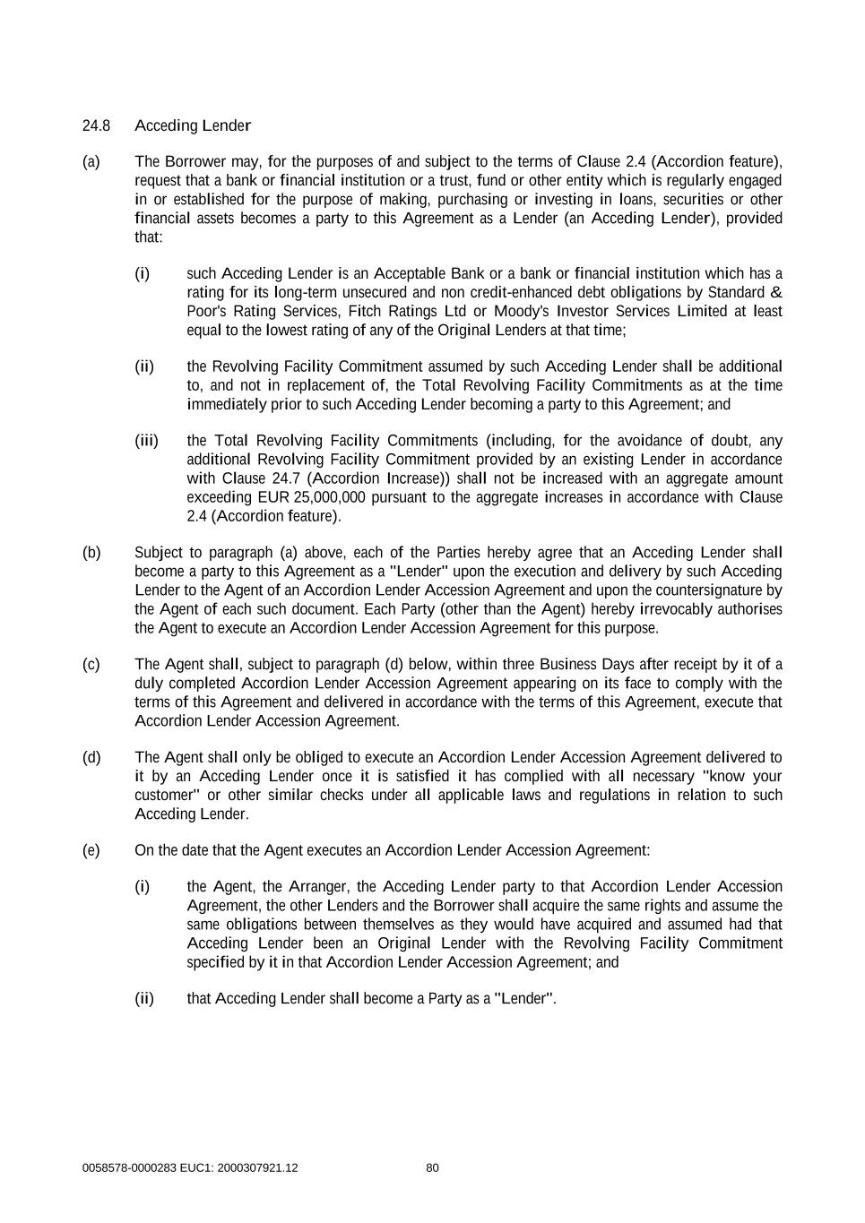 0058578-0000283 EUC1: 2000307921.12 80 24.8 Acceding Lender (a) The Borrower may, for the purposes of and subject to the terms of Clause 2.4 (Accordion feature), request that a bank or financial institution or a trust, fund or other entity which is regularly engaged in or established for the purpose of making, purchasing or investing in loans, securities or other financial assets becomes a party to this Agreement as a Lender (an Acceding Lender), provided that: (i) such Acceding Lender is an Acceptable Bank or a bank or financial institution which has a rating for its long-term unsecured and non credit-enhanced debt obligations by Standard & Poor's Rating Services, Fitch Ratings Ltd or Moody's Investor Services Limited at least equal to the lowest rating of any of the Original Lenders at that time; (ii) the Revolving Facility Commitment assumed by such Acceding Lender shall be additional to, and not in replacement of, the Total Revolving Facility Commitments as at the time immediately prior to such Acceding Lender becoming a party to this Agreement; and (iii) the Total Revolving Facility Commitments (including, for the avoidance of doubt, any additional Revolving Facility Commitment provided by an existing Lender in accordance with Clause 24.7 (Accordion Increase)) shall not be increased with an aggregate amount exceeding EUR 25,000,000 pursuant to the aggregate increases in accordance with Clause 2.4 (Accordion feature). (b) Subject to paragraph (a) above, each of the Parties hereby agree that an Acceding Lender shall become a party to this Agreement as a "Lender" upon the execution and delivery by such Acceding Lender to the Agent of an Accordion Lender Accession Agreement and upon the countersignature by the Agent of each such document. Each Party (other than the Agent) hereby irrevocably authorises the Agent to execute an Accordion Lender Accession Agreement for this purpose. (c) The Agent shall, subject to paragraph (d) below, within three Business Days after receipt by it of a duly completed Accordion Lender Accession Agreement appearing on its face to comply with the terms of this Agreement and delivered in accordance with the terms of this Agreement, execute that Accordion Lender Accession Agreement. (d) The Agent shall only be obliged to execute an Accordion Lender Accession Agreement delivered to it by an Acceding Lender once it is satisfied it has complied with all necessary "know your customer" or other similar checks under all applicable laws and regulations in relation to such Acceding Lender. (e) On the date that the Agent executes an Accordion Lender Accession Agreement: (i) the Agent, the Arranger, the Acceding Lender party to that Accordion Lender Accession Agreement, the other Lenders and the Borrower shall acquire the same rights and assume the same obligations between themselves as they would have acquired and assumed had that Acceding Lender been an Original Lender with the Revolving Facility Commitment specified by it in that Accordion Lender Accession Agreement; and (ii) that Acceding Lender shall become a Party as a "Lender".