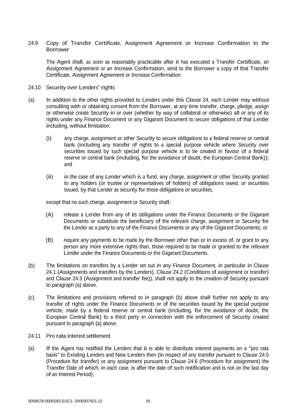0058578-0000283 EUC1: 2000307921.12 81 24.9 Copy of Transfer Certificate, Assignment Agreement or Increase Confirmation to the Borrower The Agent shall, as soon as reasonably practicable after it has executed a Transfer Certificate, an Assignment Agreement or an Increase Confirmation, send to the Borrower a copy of that Transfer Certificate, Assignment Agreement or Increase Confirmation. 24.10 Security over Lenders' rights (a) In addition to the other rights provided to Lenders under this Clause 24, each Lender may without consulting with or obtaining consent from the Borrower, at any time transfer, charge, pledge, assign or otherwise create Security in or over (whether by way of collateral or otherwise) all or any of its rights under any Finance Document or any Gigarant Document to secure obligations of that Lender including, without limitation: (i) any charge, assignment or other Security to secure obligations to a federal reserve or central bank (including any transfer of rights to a special purpose vehicle where Security over securities issued by such special purpose vehicle is to be created in favour of a federal reserve or central bank (including, for the avoidance of doubt, the European Central Bank)); and (ii) in the case of any Lender which is a fund, any charge, assignment or other Security granted to any holders (or trustee or representatives of holders) of obligations owed, or securities issued, by that Lender as security for those obligations or securities, except that no such charge, assignment or Security shall: (A) release a Lender from any of its obligations under the Finance Documents or the Gigarant Documents or substitute the beneficiary of the relevant charge, assignment or Security for the Lender as a party to any of the Finance Documents or any of the Gigarant Documents; or (B) require any payments to be made by the Borrower other than or in excess of, or grant to any person any more extensive rights than, those required to be made or granted to the relevant Lender under the Finance Documents or the Gigarant Documents. (b) The limitations on transfers by a Lender set out in any Finance Document, in particular in Clause 24.1 (Assignments and transfers by the Lenders), Clause 24.2 (Conditions of assignment or transfer) and Clause 24.3 (Assignment and transfer fee)), shall not apply to the creation of Security pursuant to paragraph (a) above. (c) The limitations and provisions referred to in paragraph (b) above shall further not apply to any transfer of rights under the Finance Documents or of the securities issued by the special purpose vehicle, made by a federal reserve or central bank (including, for the avoidance of doubt, the European Central Bank) to a third party in connection with the enforcement of Security created pursuant to paragraph (a) above. 24.11 Pro rata interest settlement (a) If the Agent has notified the Lenders that it is able to distribute interest payments on a "pro rata basis" to Existing Lenders and New Lenders then (in respect of any transfer pursuant to Clause 24.5 (Procedure for transfer) or any assignment pursuant to Clause 24.6 (Procedure for assignment) the Transfer Date of which, in each case, is after the date of such notification and is not on the last day of an Interest Period):