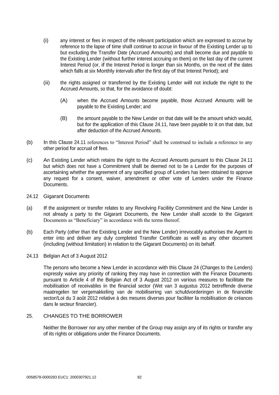 0058578-0000283 EUC1: 2000307921.12 82 (i) any interest or fees in respect of the relevant participation which are expressed to accrue by reference to the lapse of time shall continue to accrue in favour of the Existing Lender up to but excluding the Transfer Date (Accrued Amounts) and shall become due and payable to the Existing Lender (without further interest accruing on them) on the last day of the current Interest Period (or, if the Interest Period is longer than six Months, on the next of the dates which falls at six Monthly intervals after the first day of that Interest Period); and (ii) the rights assigned or transferred by the Existing Lender will not include the right to the Accrued Amounts, so that, for the avoidance of doubt: (A) when the Accrued Amounts become payable, those Accrued Amounts will be payable to the Existing Lender; and (B) the amount payable to the New Lender on that date will be the amount which would, but for the application of this Clause 24.11, have been payable to it on that date, but after deduction of the Accrued Amounts. (b) In this Clause 24.11 references to “Interest Period” shall be construed to include a reference to any other period for accrual of fees. (c) An Existing Lender which retains the right to the Accrued Amounts pursuant to this Clause 24.11 but which does not have a Commitment shall be deemed not to be a Lender for the purposes of ascertaining whether the agreement of any specified group of Lenders has been obtained to approve any request for a consent, waiver, amendment or other vote of Lenders under the Finance Documents. 24.12 Gigarant Documents (a) If the assignment or transfer relates to any Revolving Facility Commitment and the New Lender is not already a party to the Gigarant Documents, the New Lender shall accede to the Gigarant Documents as “Beneficiary” in accordance with the terms thereof. (b) Each Party (other than the Existing Lender and the New Lender) irrevocably authorises the Agent to enter into and deliver any duly completed Transfer Certificate as well as any other document (including (without limitation) in relation to the Gigarant Documents) on its behalf. 24.13 Belgian Act of 3 August 2012 The persons who become a New Lender in accordance with this Clause 24 (Changes to the Lenders) expressly waive any priority of ranking they may have in connection with the Finance Documents pursuant to Article 4 of the Belgian Act of 3 August 2012 on various measures to facilitate the mobilisation of receivables in the financial sector (Wet van 3 augustus 2012 betreffende diverse maatregelen ter vergemakkeling van de mobilisering van schuldvorderingen in de financiële sector/Loi du 3 août 2012 relative à des mesures diverses pour faciliter la mobilisation de créances dans le secteur financier). 25. CHANGES TO THE BORROWER Neither the Borrower nor any other member of the Group may assign any of its rights or transfer any of its rights or obligations under the Finance Documents.