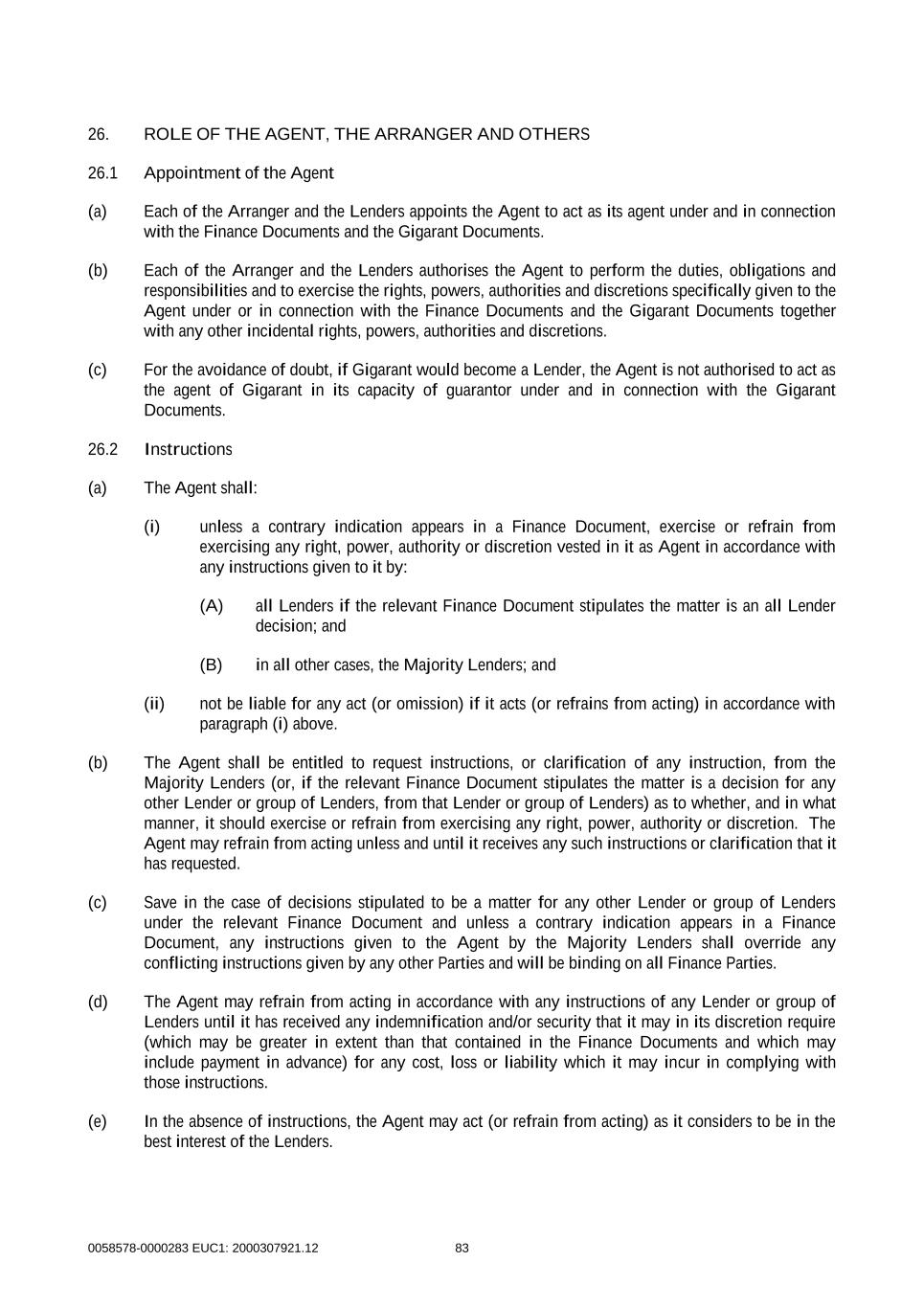 0058578-0000283 EUC1: 2000307921.12 83 26. ROLE OF THE AGENT, THE ARRANGER AND OTHERS 26.1 Appointment of the Agent (a) Each of the Arranger and the Lenders appoints the Agent to act as its agent under and in connection with the Finance Documents and the Gigarant Documents. (b) Each of the Arranger and the Lenders authorises the Agent to perform the duties, obligations and responsibilities and to exercise the rights, powers, authorities and discretions specifically given to the Agent under or in connection with the Finance Documents and the Gigarant Documents together with any other incidental rights, powers, authorities and discretions. (c) For the avoidance of doubt, if Gigarant would become a Lender, the Agent is not authorised to act as the agent of Gigarant in its capacity of guarantor under and in connection with the Gigarant Documents. 26.2 Instructions (a) The Agent shall: (i) unless a contrary indication appears in a Finance Document, exercise or refrain from exercising any right, power, authority or discretion vested in it as Agent in accordance with any instructions given to it by: (A) all Lenders if the relevant Finance Document stipulates the matter is an all Lender decision; and (B) in all other cases, the Majority Lenders; and (ii) not be liable for any act (or omission) if it acts (or refrains from acting) in accordance with paragraph (i) above. (b) The Agent shall be entitled to request instructions, or clarification of any instruction, from the Majority Lenders (or, if the relevant Finance Document stipulates the matter is a decision for any other Lender or group of Lenders, from that Lender or group of Lenders) as to whether, and in what manner, it should exercise or refrain from exercising any right, power, authority or discretion. The Agent may refrain from acting unless and until it receives any such instructions or clarification that it has requested. (c) Save in the case of decisions stipulated to be a matter for any other Lender or group of Lenders under the relevant Finance Document and unless a contrary indication appears in a Finance Document, any instructions given to the Agent by the Majority Lenders shall override any conflicting instructions given by any other Parties and will be binding on all Finance Parties. (d) The Agent may refrain from acting in accordance with any instructions of any Lender or group of Lenders until it has received any indemnification and/or security that it may in its discretion require (which may be greater in extent than that contained in the Finance Documents and which may include payment in advance) for any cost, loss or liability which it may incur in complying with those instructions. (e) In the absence of instructions, the Agent may act (or refrain from acting) as it considers to be in the best interest of the Lenders.