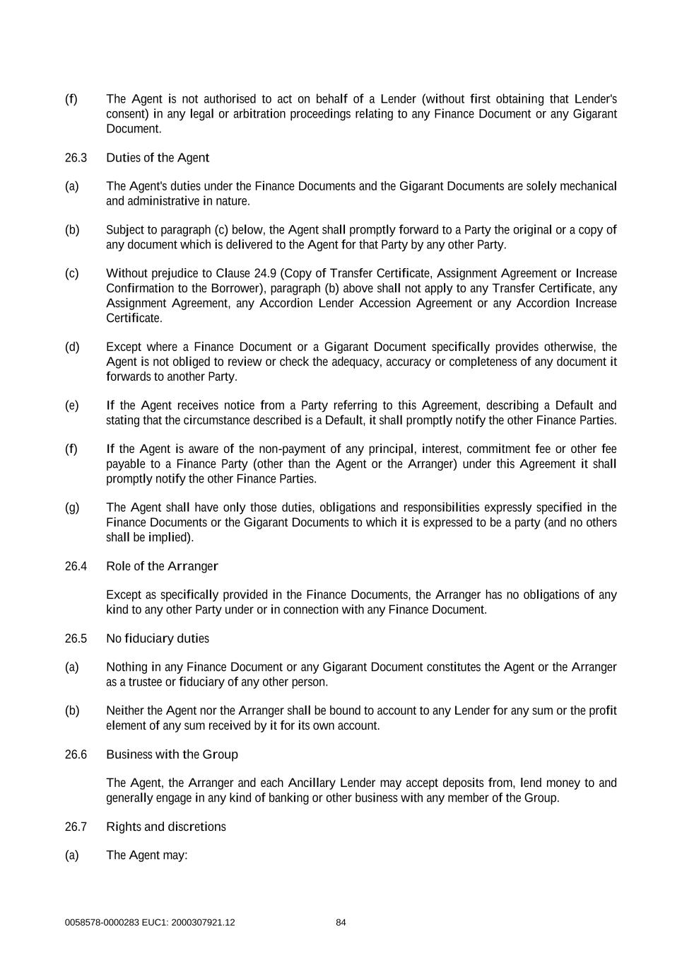 0058578-0000283 EUC1: 2000307921.12 84 (f) The Agent is not authorised to act on behalf of a Lender (without first obtaining that Lender's consent) in any legal or arbitration proceedings relating to any Finance Document or any Gigarant Document. 26.3 Duties of the Agent (a) The Agent's duties under the Finance Documents and the Gigarant Documents are solely mechanical and administrative in nature. (b) Subject to paragraph (c) below, the Agent shall promptly forward to a Party the original or a copy of any document which is delivered to the Agent for that Party by any other Party. (c) Without prejudice to Clause 24.9 (Copy of Transfer Certificate, Assignment Agreement or Increase Confirmation to the Borrower), paragraph (b) above shall not apply to any Transfer Certificate, any Assignment Agreement, any Accordion Lender Accession Agreement or any Accordion Increase Certificate. (d) Except where a Finance Document or a Gigarant Document specifically provides otherwise, the Agent is not obliged to review or check the adequacy, accuracy or completeness of any document it forwards to another Party. (e) If the Agent receives notice from a Party referring to this Agreement, describing a Default and stating that the circumstance described is a Default, it shall promptly notify the other Finance Parties. (f) If the Agent is aware of the non-payment of any principal, interest, commitment fee or other fee payable to a Finance Party (other than the Agent or the Arranger) under this Agreement it shall promptly notify the other Finance Parties. (g) The Agent shall have only those duties, obligations and responsibilities expressly specified in the Finance Documents or the Gigarant Documents to which it is expressed to be a party (and no others shall be implied). 26.4 Role of the Arranger Except as specifically provided in the Finance Documents, the Arranger has no obligations of any kind to any other Party under or in connection with any Finance Document. 26.5 No fiduciary duties (a) Nothing in any Finance Document or any Gigarant Document constitutes the Agent or the Arranger as a trustee or fiduciary of any other person. (b) Neither the Agent nor the Arranger shall be bound to account to any Lender for any sum or the profit element of any sum received by it for its own account. 26.6 Business with the Group The Agent, the Arranger and each Ancillary Lender may accept deposits from, lend money to and generally engage in any kind of banking or other business with any member of the Group. 26.7 Rights and discretions (a) The Agent may: