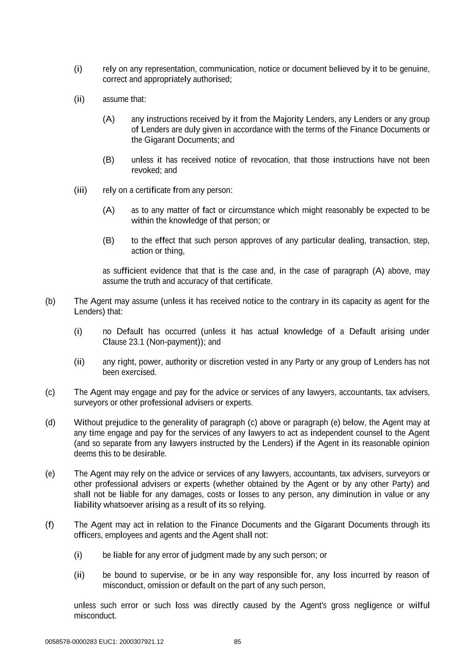0058578-0000283 EUC1: 2000307921.12 85 (i) rely on any representation, communication, notice or document believed by it to be genuine, correct and appropriately authorised; (ii) assume that: (A) any instructions received by it from the Majority Lenders, any Lenders or any group of Lenders are duly given in accordance with the terms of the Finance Documents or the Gigarant Documents; and (B) unless it has received notice of revocation, that those instructions have not been revoked; and (iii) rely on a certificate from any person: (A) as to any matter of fact or circumstance which might reasonably be expected to be within the knowledge of that person; or (B) to the effect that such person approves of any particular dealing, transaction, step, action or thing, as sufficient evidence that that is the case and, in the case of paragraph (A) above, may assume the truth and accuracy of that certificate. (b) The Agent may assume (unless it has received notice to the contrary in its capacity as agent for the Lenders) that: (i) no Default has occurred (unless it has actual knowledge of a Default arising under Clause 23.1 (Non-payment)); and (ii) any right, power, authority or discretion vested in any Party or any group of Lenders has not been exercised. (c) The Agent may engage and pay for the advice or services of any lawyers, accountants, tax advisers, surveyors or other professional advisers or experts. (d) Without prejudice to the generality of paragraph (c) above or paragraph (e) below, the Agent may at any time engage and pay for the services of any lawyers to act as independent counsel to the Agent (and so separate from any lawyers instructed by the Lenders) if the Agent in its reasonable opinion deems this to be desirable. (e) The Agent may rely on the advice or services of any lawyers, accountants, tax advisers, surveyors or other professional advisers or experts (whether obtained by the Agent or by any other Party) and shall not be liable for any damages, costs or losses to any person, any diminution in value or any liability whatsoever arising as a result of its so relying. (f) The Agent may act in relation to the Finance Documents and the Gigarant Documents through its officers, employees and agents and the Agent shall not: (i) be liable for any error of judgment made by any such person; or (ii) be bound to supervise, or be in any way responsible for, any loss incurred by reason of misconduct, omission or default on the part of any such person, unless such error or such loss was directly caused by the Agent's gross negligence or wilful misconduct.