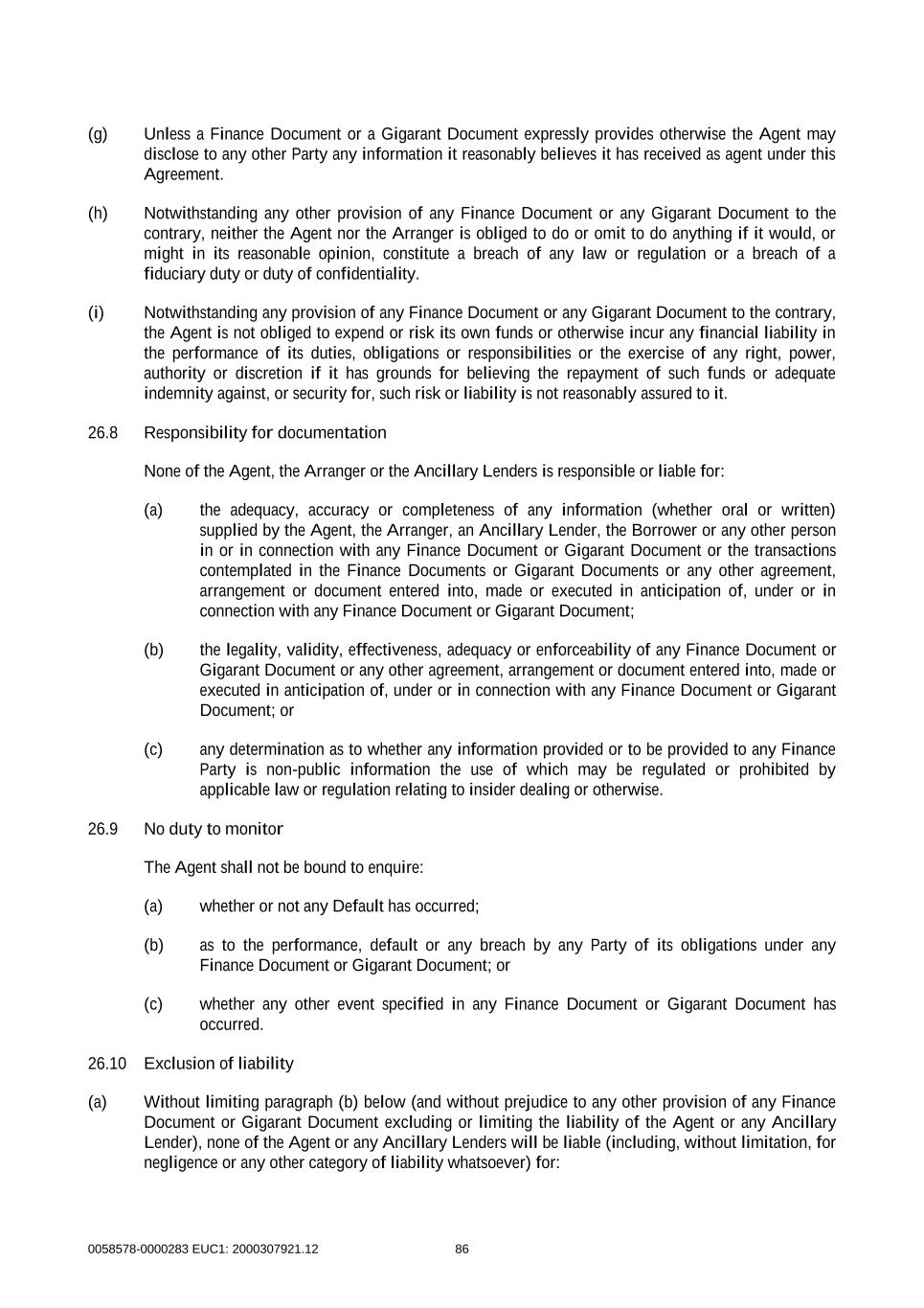 0058578-0000283 EUC1: 2000307921.12 86 (g) Unless a Finance Document or a Gigarant Document expressly provides otherwise the Agent may disclose to any other Party any information it reasonably believes it has received as agent under this Agreement. (h) Notwithstanding any other provision of any Finance Document or any Gigarant Document to the contrary, neither the Agent nor the Arranger is obliged to do or omit to do anything if it would, or might in its reasonable opinion, constitute a breach of any law or regulation or a breach of a fiduciary duty or duty of confidentiality. (i) Notwithstanding any provision of any Finance Document or any Gigarant Document to the contrary, the Agent is not obliged to expend or risk its own funds or otherwise incur any financial liability in the performance of its duties, obligations or responsibilities or the exercise of any right, power, authority or discretion if it has grounds for believing the repayment of such funds or adequate indemnity against, or security for, such risk or liability is not reasonably assured to it. 26.8 Responsibility for documentation None of the Agent, the Arranger or the Ancillary Lenders is responsible or liable for: (a) the adequacy, accuracy or completeness of any information (whether oral or written) supplied by the Agent, the Arranger, an Ancillary Lender, the Borrower or any other person in or in connection with any Finance Document or Gigarant Document or the transactions contemplated in the Finance Documents or Gigarant Documents or any other agreement, arrangement or document entered into, made or executed in anticipation of, under or in connection with any Finance Document or Gigarant Document; (b) the legality, validity, effectiveness, adequacy or enforceability of any Finance Document or Gigarant Document or any other agreement, arrangement or document entered into, made or executed in anticipation of, under or in connection with any Finance Document or Gigarant Document; or (c) any determination as to whether any information provided or to be provided to any Finance Party is non-public information the use of which may be regulated or prohibited by applicable law or regulation relating to insider dealing or otherwise. 26.9 No duty to monitor The Agent shall not be bound to enquire: (a) whether or not any Default has occurred; (b) as to the performance, default or any breach by any Party of its obligations under any Finance Document or Gigarant Document; or (c) whether any other event specified in any Finance Document or Gigarant Document has occurred. 26.10 Exclusion of liability (a) Without limiting paragraph (b) below (and without prejudice to any other provision of any Finance Document or Gigarant Document excluding or limiting the liability of the Agent or any Ancillary Lender), none of the Agent or any Ancillary Lenders will be liable (including, without limitation, for negligence or any other category of liability whatsoever) for: