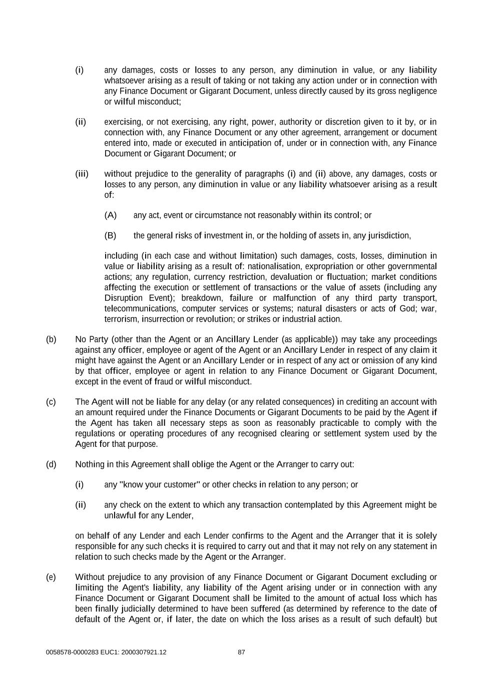 0058578-0000283 EUC1: 2000307921.12 87 (i) any damages, costs or losses to any person, any diminution in value, or any liability whatsoever arising as a result of taking or not taking any action under or in connection with any Finance Document or Gigarant Document, unless directly caused by its gross negligence or wilful misconduct; (ii) exercising, or not exercising, any right, power, authority or discretion given to it by, or in connection with, any Finance Document or any other agreement, arrangement or document entered into, made or executed in anticipation of, under or in connection with, any Finance Document or Gigarant Document; or (iii) without prejudice to the generality of paragraphs (i) and (ii) above, any damages, costs or losses to any person, any diminution in value or any liability whatsoever arising as a result of: (A) any act, event or circumstance not reasonably within its control; or (B) the general risks of investment in, or the holding of assets in, any jurisdiction, including (in each case and without limitation) such damages, costs, losses, diminution in value or liability arising as a result of: nationalisation, expropriation or other governmental actions; any regulation, currency restriction, devaluation or fluctuation; market conditions affecting the execution or settlement of transactions or the value of assets (including any Disruption Event); breakdown, failure or malfunction of any third party transport, telecommunications, computer services or systems; natural disasters or acts of God; war, terrorism, insurrection or revolution; or strikes or industrial action. (b) No Party (other than the Agent or an Ancillary Lender (as applicable)) may take any proceedings against any officer, employee or agent of the Agent or an Ancillary Lender in respect of any claim it might have against the Agent or an Ancillary Lender or in respect of any act or omission of any kind by that officer, employee or agent in relation to any Finance Document or Gigarant Document, except in the event of fraud or wilful misconduct. (c) The Agent will not be liable for any delay (or any related consequences) in crediting an account with an amount required under the Finance Documents or Gigarant Documents to be paid by the Agent if the Agent has taken all necessary steps as soon as reasonably practicable to comply with the regulations or operating procedures of any recognised clearing or settlement system used by the Agent for that purpose. (d) Nothing in this Agreement shall oblige the Agent or the Arranger to carry out: (i) any "know your customer" or other checks in relation to any person; or (ii) any check on the extent to which any transaction contemplated by this Agreement might be unlawful for any Lender, on behalf of any Lender and each Lender confirms to the Agent and the Arranger that it is solely responsible for any such checks it is required to carry out and that it may not rely on any statement in relation to such checks made by the Agent or the Arranger. (e) Without prejudice to any provision of any Finance Document or Gigarant Document excluding or limiting the Agent's liability, any liability of the Agent arising under or in connection with any Finance Document or Gigarant Document shall be limited to the amount of actual loss which has been finally judicially determined to have been suffered (as determined by reference to the date of default of the Agent or, if later, the date on which the loss arises as a result of such default) but