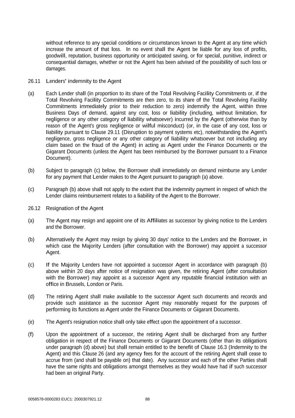 0058578-0000283 EUC1: 2000307921.12 88 without reference to any special conditions or circumstances known to the Agent at any time which increase the amount of that loss. In no event shall the Agent be liable for any loss of profits, goodwill, reputation, business opportunity or anticipated saving, or for special, punitive, indirect or consequential damages, whether or not the Agent has been advised of the possibility of such loss or damages. 26.11 Lenders' indemnity to the Agent (a) Each Lender shall (in proportion to its share of the Total Revolving Facility Commitments or, if the Total Revolving Facility Commitments are then zero, to its share of the Total Revolving Facility Commitments immediately prior to their reduction to zero) indemnify the Agent, within three Business Days of demand, against any cost, loss or liability (including, without limitation, for negligence or any other category of liability whatsoever) incurred by the Agent (otherwise than by reason of the Agent's gross negligence or wilful misconduct) (or, in the case of any cost, loss or liability pursuant to Clause 29.11 (Disruption to payment systems etc), notwithstanding the Agent's negligence, gross negligence or any other category of liability whatsoever but not including any claim based on the fraud of the Agent) in acting as Agent under the Finance Documents or the Gigarant Documents (unless the Agent has been reimbursed by the Borrower pursuant to a Finance Document). (b) Subject to paragraph (c) below, the Borrower shall immediately on demand reimburse any Lender for any payment that Lender makes to the Agent pursuant to paragraph (a) above. (c) Paragraph (b) above shall not apply to the extent that the indemnity payment in respect of which the Lender claims reimbursement relates to a liability of the Agent to the Borrower. 26.12 Resignation of the Agent (a) The Agent may resign and appoint one of its Affiliates as successor by giving notice to the Lenders and the Borrower. (b) Alternatively the Agent may resign by giving 30 days' notice to the Lenders and the Borrower, in which case the Majority Lenders (after consultation with the Borrower) may appoint a successor Agent. (c) If the Majority Lenders have not appointed a successor Agent in accordance with paragraph (b) above within 20 days after notice of resignation was given, the retiring Agent (after consultation with the Borrower) may appoint as a successor Agent any reputable financial institution with an office in Brussels, London or Paris. (d) The retiring Agent shall make available to the successor Agent such documents and records and provide such assistance as the successor Agent may reasonably request for the purposes of performing its functions as Agent under the Finance Documents or Gigarant Documents. (e) The Agent's resignation notice shall only take effect upon the appointment of a successor. (f) Upon the appointment of a successor, the retiring Agent shall be discharged from any further obligation in respect of the Finance Documents or Gigarant Documents (other than its obligations under paragraph (d) above) but shall remain entitled to the benefit of Clause 16.3 (Indemnity to the Agent) and this Clause 26 (and any agency fees for the account of the retiring Agent shall cease to accrue from (and shall be payable on) that date). Any successor and each of the other Parties shall have the same rights and obligations amongst themselves as they would have had if such successor had been an original Party.