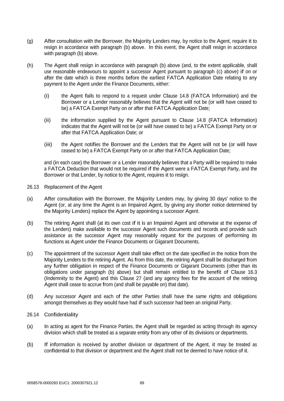 0058578-0000283 EUC1: 2000307921.12 89 (g) After consultation with the Borrower, the Majority Lenders may, by notice to the Agent, require it to resign in accordance with paragraph (b) above. In this event, the Agent shall resign in accordance with paragraph (b) above. (h) The Agent shall resign in accordance with paragraph (b) above (and, to the extent applicable, shall use reasonable endeavours to appoint a successor Agent pursuant to paragraph (c) above) if on or after the date which is three months before the earliest FATCA Application Date relating to any payment to the Agent under the Finance Documents, either: (i) the Agent fails to respond to a request under Clause 14.8 (FATCA Information) and the Borrower or a Lender reasonably believes that the Agent will not be (or will have ceased to be) a FATCA Exempt Party on or after that FATCA Application Date; (ii) the information supplied by the Agent pursuant to Clause 14.8 (FATCA Information) indicates that the Agent will not be (or will have ceased to be) a FATCA Exempt Party on or after that FATCA Application Date; or (iii) the Agent notifies the Borrower and the Lenders that the Agent will not be (or will have ceased to be) a FATCA Exempt Party on or after that FATCA Application Date; and (in each case) the Borrower or a Lender reasonably believes that a Party will be required to make a FATCA Deduction that would not be required if the Agent were a FATCA Exempt Party, and the Borrower or that Lender, by notice to the Agent, requires it to resign. 26.13 Replacement of the Agent (a) After consultation with the Borrower, the Majority Lenders may, by giving 30 days' notice to the Agent (or, at any time the Agent is an Impaired Agent, by giving any shorter notice determined by the Majority Lenders) replace the Agent by appointing a successor Agent. (b) The retiring Agent shall (at its own cost if it is an Impaired Agent and otherwise at the expense of the Lenders) make available to the successor Agent such documents and records and provide such assistance as the successor Agent may reasonably request for the purposes of performing its functions as Agent under the Finance Documents or Gigarant Documents. (c) The appointment of the successor Agent shall take effect on the date specified in the notice from the Majority Lenders to the retiring Agent. As from this date, the retiring Agent shall be discharged from any further obligation in respect of the Finance Documents or Gigarant Documents (other than its obligations under paragraph (b) above) but shall remain entitled to the benefit of Clause 16.3 (Indemnity to the Agent) and this Clause 27 (and any agency fees for the account of the retiring Agent shall cease to accrue from (and shall be payable on) that date). (d) Any successor Agent and each of the other Parties shall have the same rights and obligations amongst themselves as they would have had if such successor had been an original Party. 26.14 Confidentiality (a) In acting as agent for the Finance Parties, the Agent shall be regarded as acting through its agency division which shall be treated as a separate entity from any other of its divisions or departments. (b) If information is received by another division or department of the Agent, it may be treated as confidential to that division or department and the Agent shall not be deemed to have notice of it.