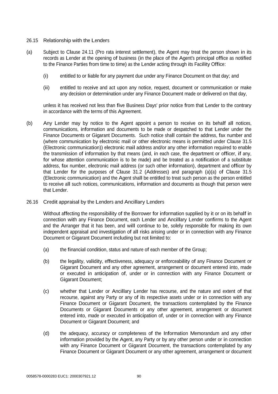 0058578-0000283 EUC1: 2000307921.12 90 26.15 Relationship with the Lenders (a) Subject to Clause 24.11 (Pro rata interest settlement), the Agent may treat the person shown in its records as Lender at the opening of business (in the place of the Agent's principal office as notified to the Finance Parties from time to time) as the Lender acting through its Facility Office: (i) entitled to or liable for any payment due under any Finance Document on that day; and (ii) entitled to receive and act upon any notice, request, document or communication or make any decision or determination under any Finance Document made or delivered on that day, unless it has received not less than five Business Days' prior notice from that Lender to the contrary in accordance with the terms of this Agreement. (b) Any Lender may by notice to the Agent appoint a person to receive on its behalf all notices, communications, information and documents to be made or despatched to that Lender under the Finance Documents or Gigarant Documents. Such notice shall contain the address, fax number and (where communication by electronic mail or other electronic means is permitted under Clause 31.5 (Electronic communication)) electronic mail address and/or any other information required to enable the transmission of information by that means (and, in each case, the department or officer, if any, for whose attention communication is to be made) and be treated as a notification of a substitute address, fax number, electronic mail address (or such other information), department and officer by that Lender for the purposes of Clause 31.2 (Addresses) and paragraph (a)(a) of Clause 31.5 (Electronic communication) and the Agent shall be entitled to treat such person as the person entitled to receive all such notices, communications, information and documents as though that person were that Lender. 26.16 Credit appraisal by the Lenders and Ancillary Lenders Without affecting the responsibility of the Borrower for information supplied by it or on its behalf in connection with any Finance Document, each Lender and Ancillary Lender confirms to the Agent and the Arranger that it has been, and will continue to be, solely responsible for making its own independent appraisal and investigation of all risks arising under or in connection with any Finance Document or Gigarant Document including but not limited to: (a) the financial condition, status and nature of each member of the Group; (b) the legality, validity, effectiveness, adequacy or enforceability of any Finance Document or Gigarant Document and any other agreement, arrangement or document entered into, made or executed in anticipation of, under or in connection with any Finance Document or Gigarant Document; (c) whether that Lender or Ancillary Lender has recourse, and the nature and extent of that recourse, against any Party or any of its respective assets under or in connection with any Finance Document or Gigarant Document, the transactions contemplated by the Finance Documents or Gigarant Documents or any other agreement, arrangement or document entered into, made or executed in anticipation of, under or in connection with any Finance Document or Gigarant Document; and (d) the adequacy, accuracy or completeness of the Information Memorandum and any other information provided by the Agent, any Party or by any other person under or in connection with any Finance Document or Gigarant Document, the transactions contemplated by any Finance Document or Gigarant Document or any other agreement, arrangement or document