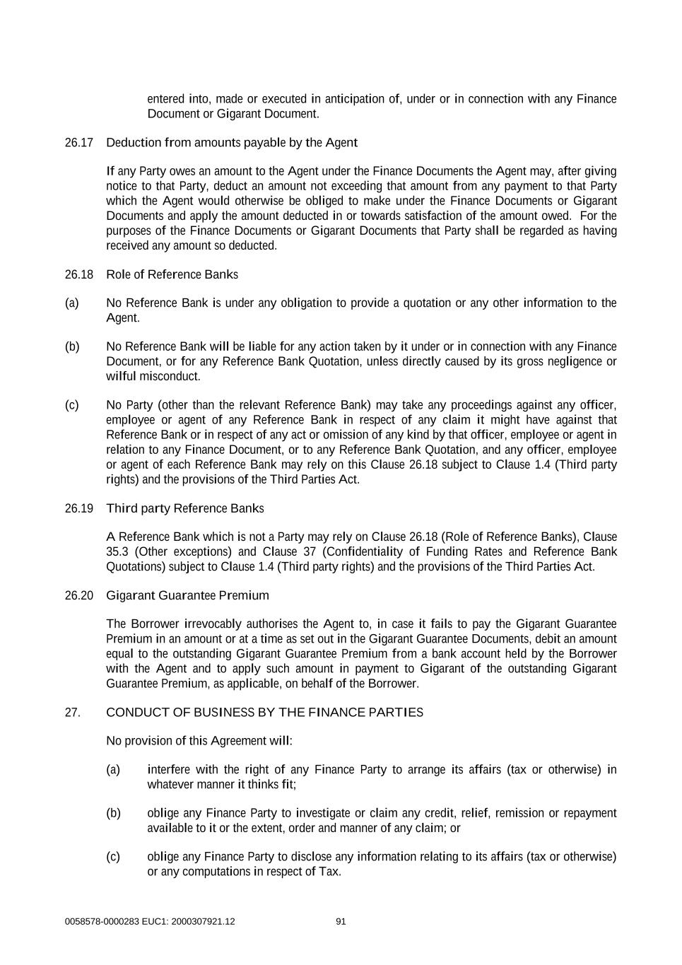 0058578-0000283 EUC1: 2000307921.12 91 entered into, made or executed in anticipation of, under or in connection with any Finance Document or Gigarant Document. 26.17 Deduction from amounts payable by the Agent If any Party owes an amount to the Agent under the Finance Documents the Agent may, after giving notice to that Party, deduct an amount not exceeding that amount from any payment to that Party which the Agent would otherwise be obliged to make under the Finance Documents or Gigarant Documents and apply the amount deducted in or towards satisfaction of the amount owed. For the purposes of the Finance Documents or Gigarant Documents that Party shall be regarded as having received any amount so deducted. 26.18 Role of Reference Banks (a) No Reference Bank is under any obligation to provide a quotation or any other information to the Agent. (b) No Reference Bank will be liable for any action taken by it under or in connection with any Finance Document, or for any Reference Bank Quotation, unless directly caused by its gross negligence or wilful misconduct. (c) No Party (other than the relevant Reference Bank) may take any proceedings against any officer, employee or agent of any Reference Bank in respect of any claim it might have against that Reference Bank or in respect of any act or omission of any kind by that officer, employee or agent in relation to any Finance Document, or to any Reference Bank Quotation, and any officer, employee or agent of each Reference Bank may rely on this Clause 26.18 subject to Clause 1.4 (Third party rights) and the provisions of the Third Parties Act. 26.19 Third party Reference Banks A Reference Bank which is not a Party may rely on Clause 26.18 (Role of Reference Banks), Clause 35.3 (Other exceptions) and Clause 37 (Confidentiality of Funding Rates and Reference Bank Quotations) subject to Clause 1.4 (Third party rights) and the provisions of the Third Parties Act. 26.20 Gigarant Guarantee Premium The Borrower irrevocably authorises the Agent to, in case it fails to pay the Gigarant Guarantee Premium in an amount or at a time as set out in the Gigarant Guarantee Documents, debit an amount equal to the outstanding Gigarant Guarantee Premium from a bank account held by the Borrower with the Agent and to apply such amount in payment to Gigarant of the outstanding Gigarant Guarantee Premium, as applicable, on behalf of the Borrower. 27. CONDUCT OF BUSINESS BY THE FINANCE PARTIES No provision of this Agreement will: (a) interfere with the right of any Finance Party to arrange its affairs (tax or otherwise) in whatever manner it thinks fit; (b) oblige any Finance Party to investigate or claim any credit, relief, remission or repayment available to it or the extent, order and manner of any claim; or (c) oblige any Finance Party to disclose any information relating to its affairs (tax or otherwise) or any computations in respect of Tax.