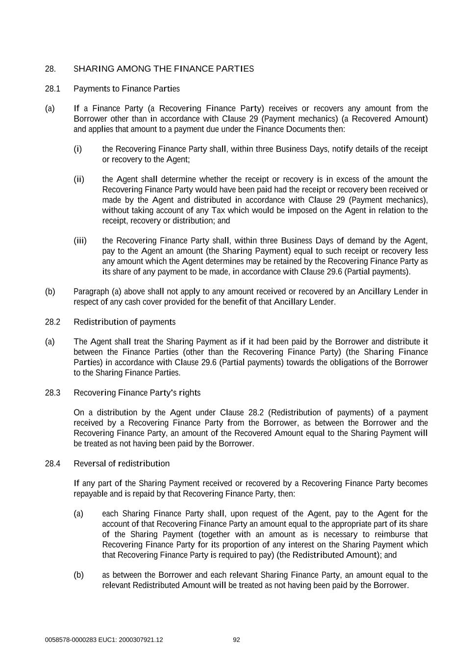 0058578-0000283 EUC1: 2000307921.12 92 28. SHARING AMONG THE FINANCE PARTIES 28.1 Payments to Finance Parties (a) If a Finance Party (a Recovering Finance Party) receives or recovers any amount from the Borrower other than in accordance with Clause 29 (Payment mechanics) (a Recovered Amount) and applies that amount to a payment due under the Finance Documents then: (i) the Recovering Finance Party shall, within three Business Days, notify details of the receipt or recovery to the Agent; (ii) the Agent shall determine whether the receipt or recovery is in excess of the amount the Recovering Finance Party would have been paid had the receipt or recovery been received or made by the Agent and distributed in accordance with Clause 29 (Payment mechanics), without taking account of any Tax which would be imposed on the Agent in relation to the receipt, recovery or distribution; and (iii) the Recovering Finance Party shall, within three Business Days of demand by the Agent, pay to the Agent an amount (the Sharing Payment) equal to such receipt or recovery less any amount which the Agent determines may be retained by the Recovering Finance Party as its share of any payment to be made, in accordance with Clause 29.6 (Partial payments). (b) Paragraph (a) above shall not apply to any amount received or recovered by an Ancillary Lender in respect of any cash cover provided for the benefit of that Ancillary Lender. 28.2 Redistribution of payments (a) The Agent shall treat the Sharing Payment as if it had been paid by the Borrower and distribute it between the Finance Parties (other than the Recovering Finance Party) (the Sharing Finance Parties) in accordance with Clause 29.6 (Partial payments) towards the obligations of the Borrower to the Sharing Finance Parties. 28.3 Recovering Finance Party's rights On a distribution by the Agent under Clause 28.2 (Redistribution of payments) of a payment received by a Recovering Finance Party from the Borrower, as between the Borrower and the Recovering Finance Party, an amount of the Recovered Amount equal to the Sharing Payment will be treated as not having been paid by the Borrower. 28.4 Reversal of redistribution If any part of the Sharing Payment received or recovered by a Recovering Finance Party becomes repayable and is repaid by that Recovering Finance Party, then: (a) each Sharing Finance Party shall, upon request of the Agent, pay to the Agent for the account of that Recovering Finance Party an amount equal to the appropriate part of its share of the Sharing Payment (together with an amount as is necessary to reimburse that Recovering Finance Party for its proportion of any interest on the Sharing Payment which that Recovering Finance Party is required to pay) (the Redistributed Amount); and (b) as between the Borrower and each relevant Sharing Finance Party, an amount equal to the relevant Redistributed Amount will be treated as not having been paid by the Borrower.