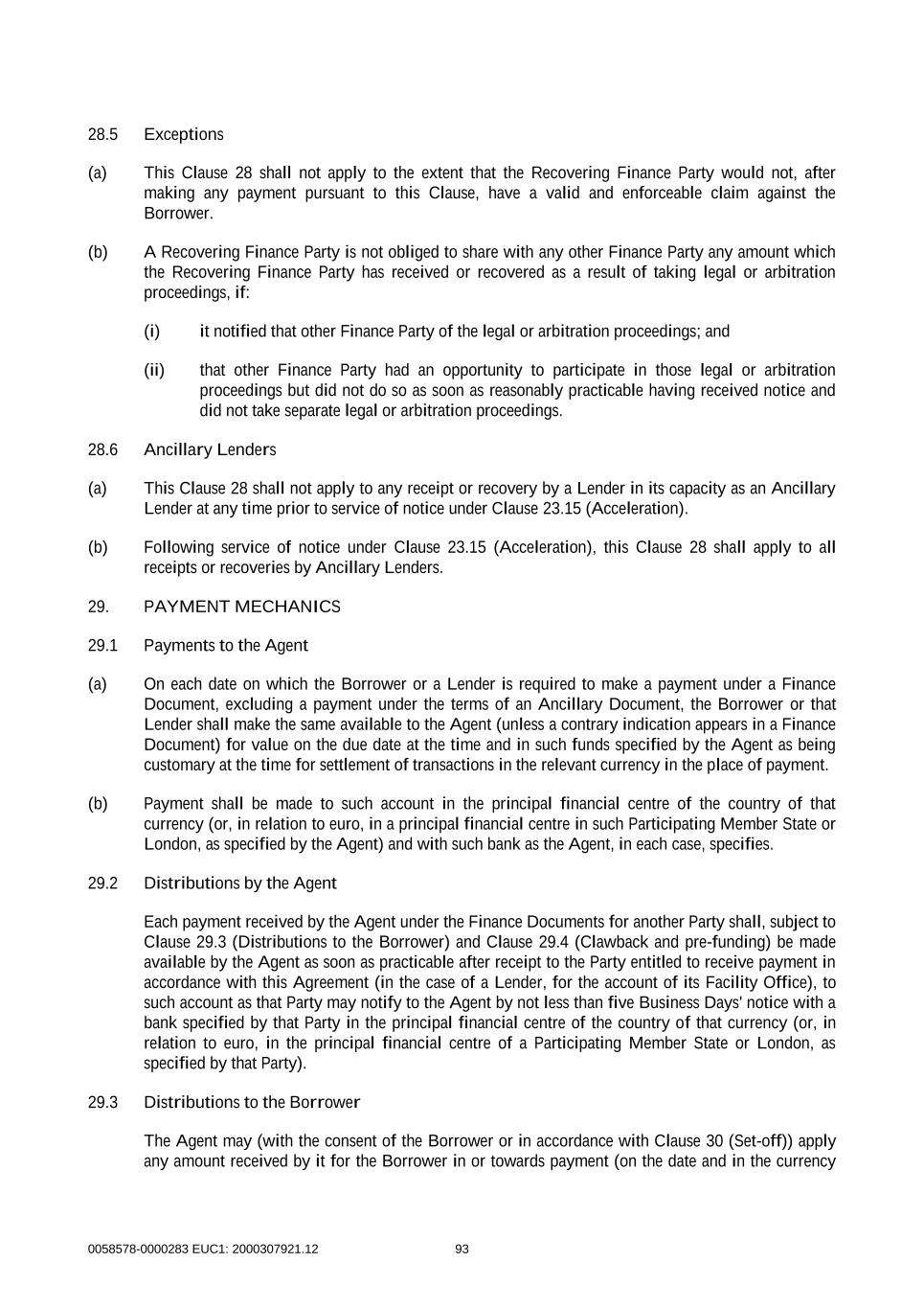 0058578-0000283 EUC1: 2000307921.12 93 28.5 Exceptions (a) This Clause 28 shall not apply to the extent that the Recovering Finance Party would not, after making any payment pursuant to this Clause, have a valid and enforceable claim against the Borrower. (b) A Recovering Finance Party is not obliged to share with any other Finance Party any amount which the Recovering Finance Party has received or recovered as a result of taking legal or arbitration proceedings, if: (i) it notified that other Finance Party of the legal or arbitration proceedings; and (ii) that other Finance Party had an opportunity to participate in those legal or arbitration proceedings but did not do so as soon as reasonably practicable having received notice and did not take separate legal or arbitration proceedings. 28.6 Ancillary Lenders (a) This Clause 28 shall not apply to any receipt or recovery by a Lender in its capacity as an Ancillary Lender at any time prior to service of notice under Clause 23.15 (Acceleration). (b) Following service of notice under Clause 23.15 (Acceleration), this Clause 28 shall apply to all receipts or recoveries by Ancillary Lenders. 29. PAYMENT MECHANICS 29.1 Payments to the Agent (a) On each date on which the Borrower or a Lender is required to make a payment under a Finance Document, excluding a payment under the terms of an Ancillary Document, the Borrower or that Lender shall make the same available to the Agent (unless a contrary indication appears in a Finance Document) for value on the due date at the time and in such funds specified by the Agent as being customary at the time for settlement of transactions in the relevant currency in the place of payment. (b) Payment shall be made to such account in the principal financial centre of the country of that currency (or, in relation to euro, in a principal financial centre in such Participating Member State or London, as specified by the Agent) and with such bank as the Agent, in each case, specifies. 29.2 Distributions by the Agent Each payment received by the Agent under the Finance Documents for another Party shall, subject to Clause 29.3 (Distributions to the Borrower) and Clause 29.4 (Clawback and pre-funding) be made available by the Agent as soon as practicable after receipt to the Party entitled to receive payment in accordance with this Agreement (in the case of a Lender, for the account of its Facility Office), to such account as that Party may notify to the Agent by not less than five Business Days' notice with a bank specified by that Party in the principal financial centre of the country of that currency (or, in relation to euro, in the principal financial centre of a Participating Member State or London, as specified by that Party). 29.3 Distributions to the Borrower The Agent may (with the consent of the Borrower or in accordance with Clause 30 (Set-off)) apply any amount received by it for the Borrower in or towards payment (on the date and in the currency